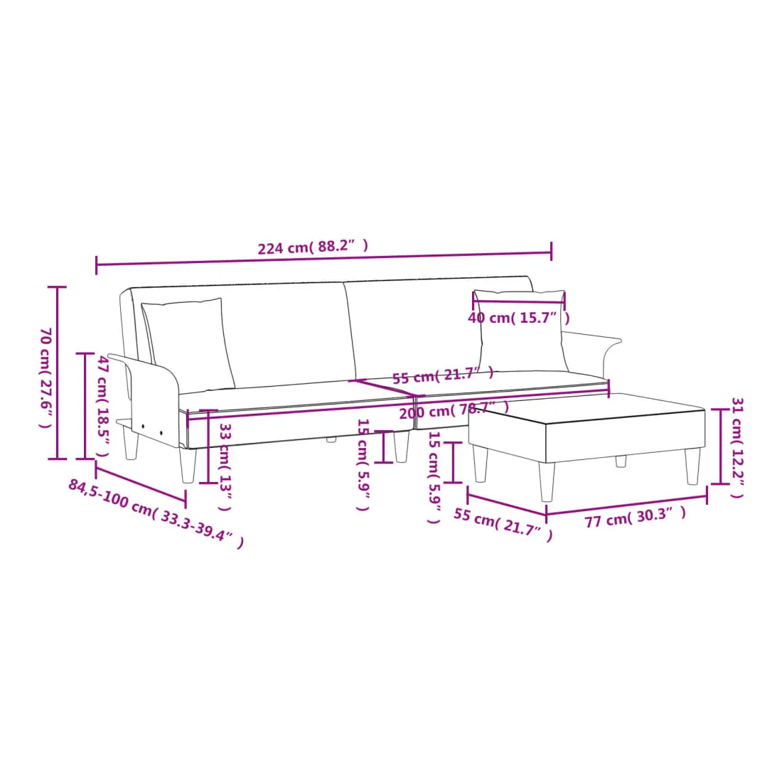 Ce canapé-lit avec repose-pied est une solution parfaite pour accueillir des invités pour la nuit tout en offrant un espace confortable pour s'asseoir pendant la journée. Matériau durable : le velours est un tissu doux et confortable, agréable au toucher.Dossier réglable : vous pouvez pousser les deux coussins de dossier séparés partiellement ou complètement vers le bas pour créer un endroit idéal pour une sieste ou un lit double.Cadre robuste et stable : le cadre en bois du canapé-lit assure robustesse et stabilité.Confort supplémentaire : ce repose-pied est adapté pour y mettre vos pieds en fin de journée ou pour vous offrir un siège supplémentaire dans votre salon ou votre entrée principale.