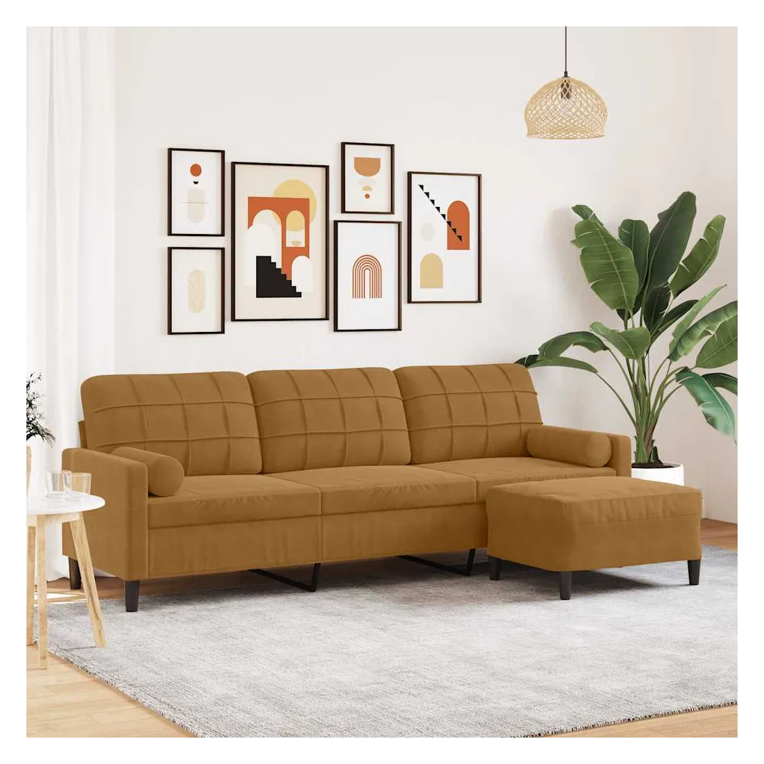 Ce canapé à 3 places est un excellent endroit pour discuter, lire, regarder la télévision ou simplement vous détendre. Il est destiné à être un point central dans votre maison. Matériau doux et confortable : le tissu en velours présente une surface douce et lisse qui offre une sensation agréable contre la peau, vous apportant chaleur et confort ultime.Cadre robuste et stable : le cadre en métal du canapé de salon assure robustesse et stabilité.Expérience d'assise confortable : le canapé est très confortable avec les sièges, les accoudoirs et les oreillers de dossier bien rembourrés.Pouf polyvalent : le tabouret est polyvalent, servant de repose-pieds confortable lorsque vous vous allongez sur le canapé ou de siège supplémentaire dans votre jardin. De plus, le design simple et la taille compacte le rendent idéal pour presque tous vos espaces de vie.Design accrocheur : doté d'un design simple mais moderne, ce canapé est destiné à attirer l'attention dans votre chambre.