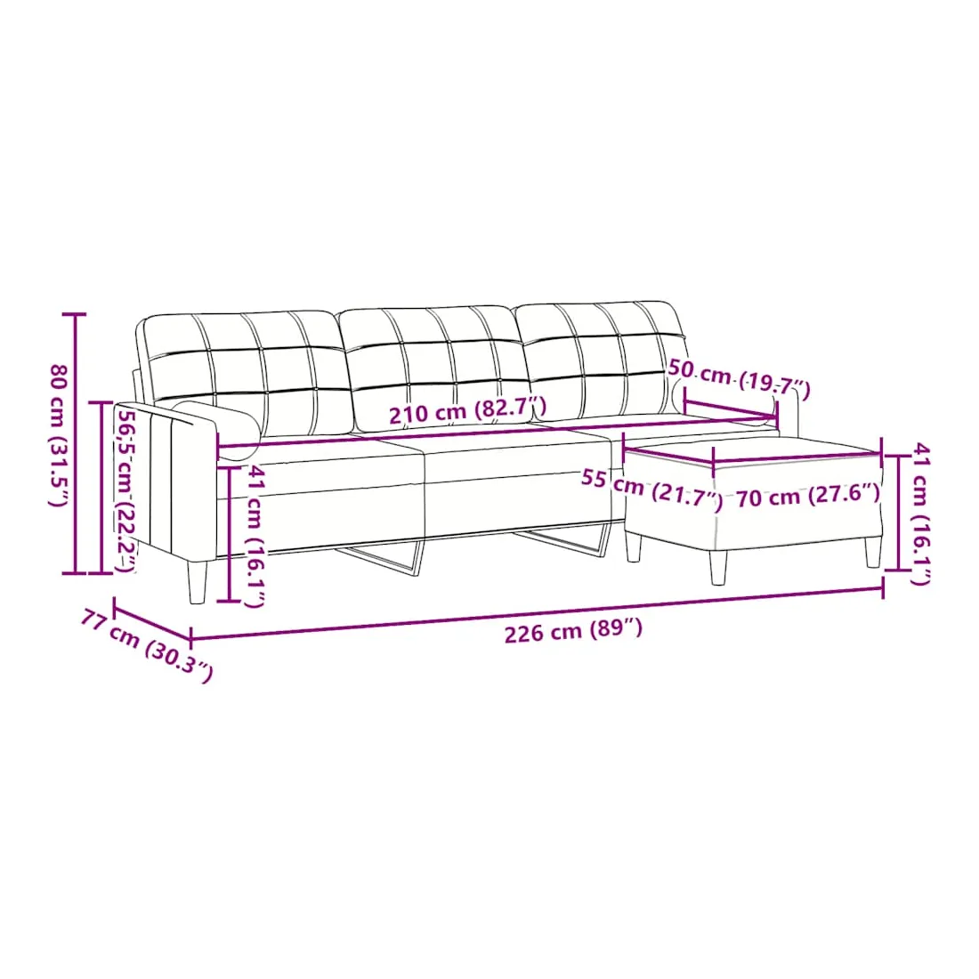 - Dimensions totales : 226 x 77 x 80 cm (l x P x H)