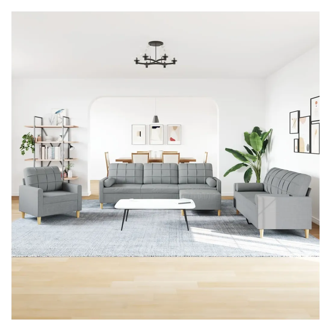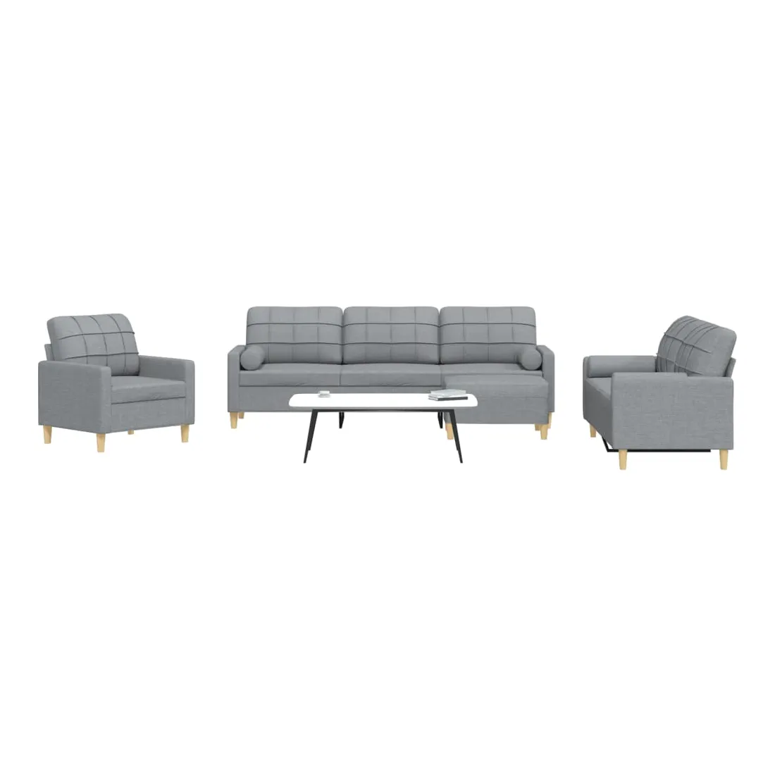 Cet ensemble de canapés est un excellent endroit pour discuter, lire, regarder la télévision ou simplement vous détendre. Il est destiné à être un point central de votre maison. Matériau doux et durable : le tissu en polyester offre une combinaison de douceur, de respirabilité et de durabilité, vous garantissant un confort et une convivialité ultimes. Cadre robuste et stable : le cadre en métal du canapé en tissu assure robustesse et stabilité. Expérience d'assise confortable : le canapé est très confortable avec les sièges, les accoudoirs et les oreillers de dossier bien rembourrés. Oreillers cylindriques pratiques : ces oreillers cylindriques non seulement embellissent votre décor, mais ils peuvent également apporter un confort supplémentaire lorsque vous êtes assis ou allongé. Pouf polyvalent : ce repose-pied convient pour reposer vos pieds lorsque vous êtes allongé dans un canapé, ou pour vous offrir un siège supplémentaire dans votre pièce. De plus, le design simple et la taille compacte le rendent idéal pour presque tous vos espaces de vie.