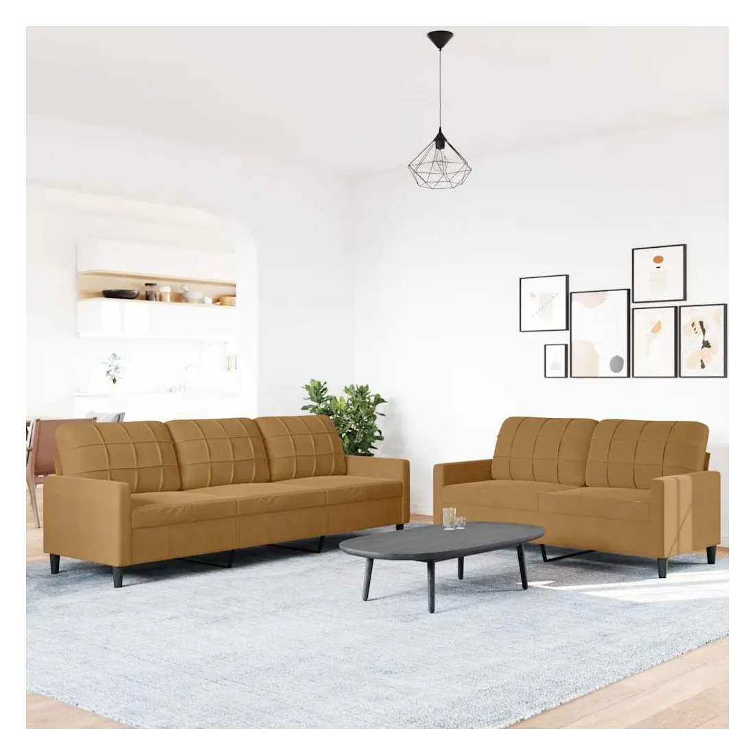 Cet ensemble de canapés est un excellent endroit pour discuter, lire, regarder la télévision ou simplement vous détendre. Il est destiné à être un point central de votre maison. Matériau doux et confortable : le tissu en velours présente une surface douce et lisse qui offre une sensation agréable contre la peau, vous apportant chaleur et confort ultime. Cadre robuste et stable : le cadre en métal du canapé de salon assure robustesse et stabilité. Expérience d'assise confortable : le canapé est très confortable avec les sièges, les accoudoirs et les oreillers de dossier bien rembourrés. Design accrocheur : doté d'un design simple mais moderne, ce canapé est destiné à attirer l'attention dans votre chambre.