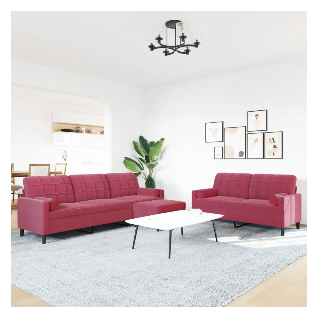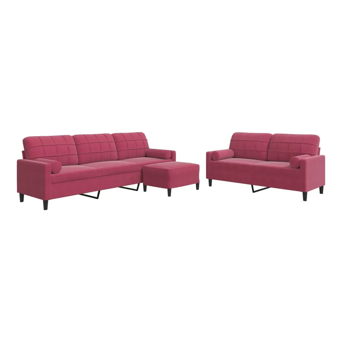 Cet ensemble de canapés est un excellent endroit pour discuter, lire, regarder la télévision ou simplement vous détendre. Il est destiné à être un point central de votre maison. Matériau doux et confortable : le tissu en velours présente une surface douce et lisse qui offre une sensation agréable contre la peau, vous apportant chaleur et confort ultime. Cadre robuste et stable : le cadre en métal du canapé de salon assure robustesse et stabilité. Expérience d'assise confortable : le canapé est très confortable avec les sièges, les accoudoirs et les oreillers de dossier bien rembourrés. Les traversins inclus ne font pas qu'embellir votre décor, ils peuvent aussi ajouter un confort supplémentaire lorsque vous êtes assis ou allongé. Pouf polyvalent : ce repose-pied convient pour reposer vos pieds lorsque vous êtes allongé dans un canapé, ou pour vous offrir un siège supplémentaire dans votre pièce. De plus, le design simple et la taille compacte le rendent idéal pour presque tous vos espaces de vie.Design accrocheur : doté d'un design simple mais moderne, ce canapé est destiné à attirer l'attention dans votre chambre.