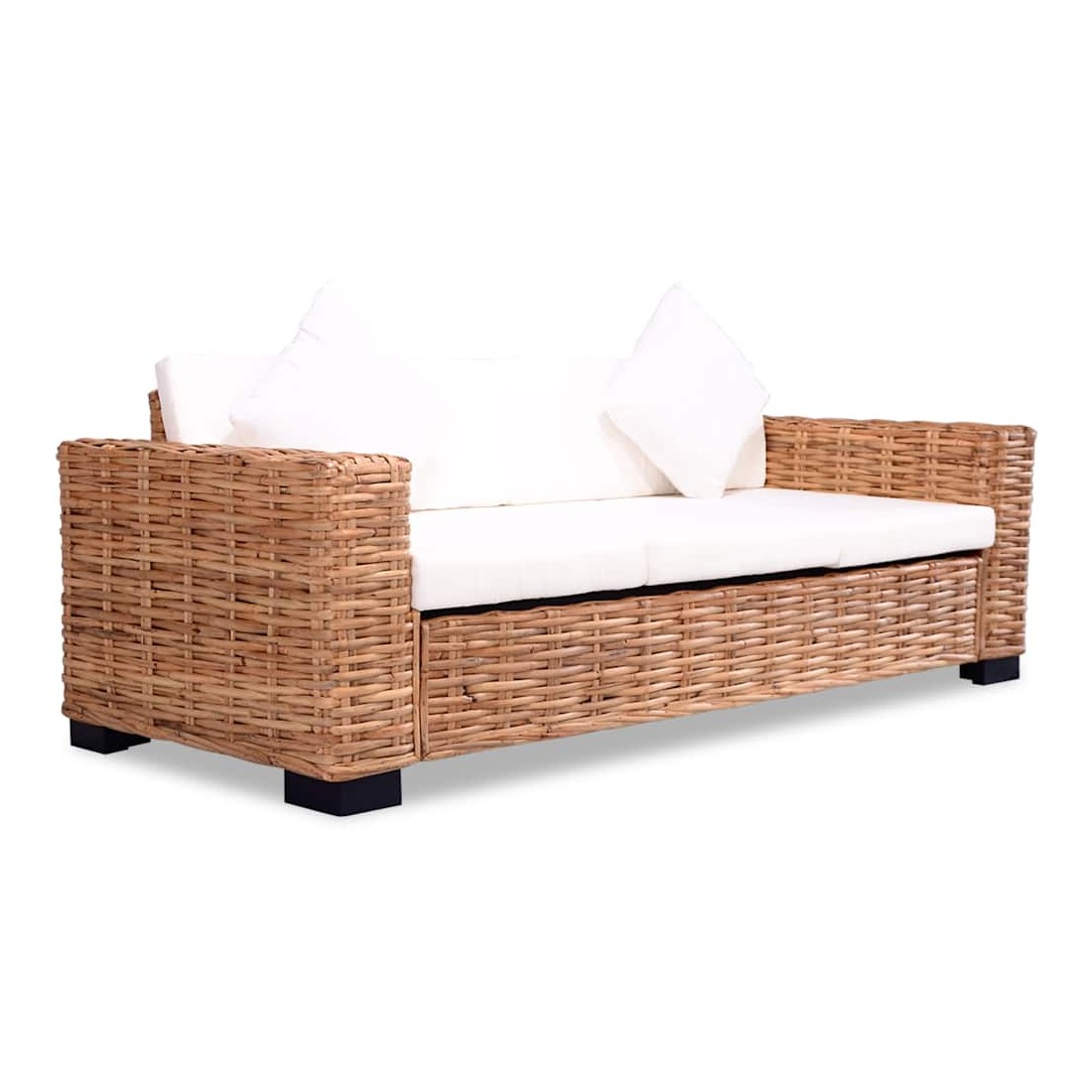 Ce canapé en rotin associe style et fonctionnalité et sera un excellent ajout à votre maison. Grâce au matériau en rotin naturel de haute qualité, ce canapé est facile à nettoyer, résistant à l'usure et adapté à un usage quotidien. Il dispose d'un cadre en bois durable et robuste. Les coussins épais de dossier et de siège sont très confortables et lavables grâce à leurs housses amovibles. En outre, les accoudoirs larges s'ajoutent au confort de votre siège. La livraison comprend un canapé à 3 places, trois coussins de siège, deux coussins de dossier et deux oreillers. Maximum 110 kg par siège. Soyez conscient du risque de feux ouverts et d'autres sources de forte chaleur à proximité du produit.