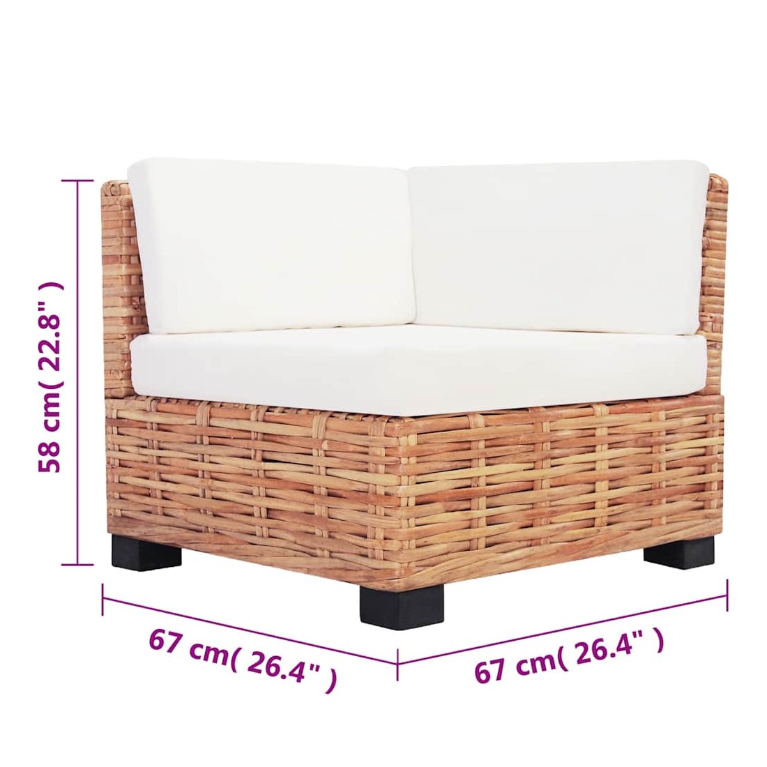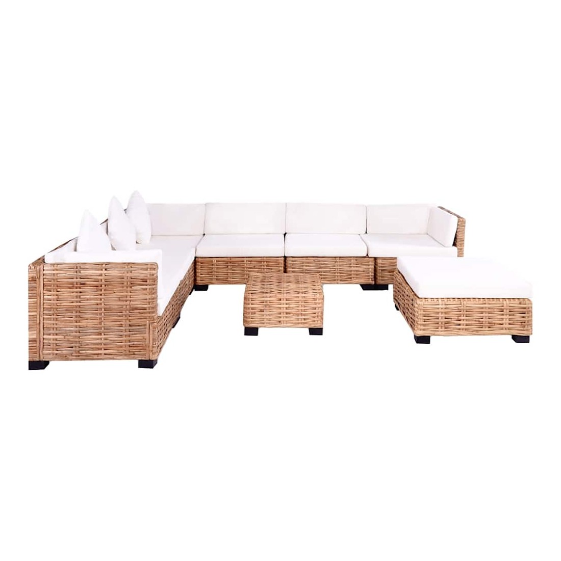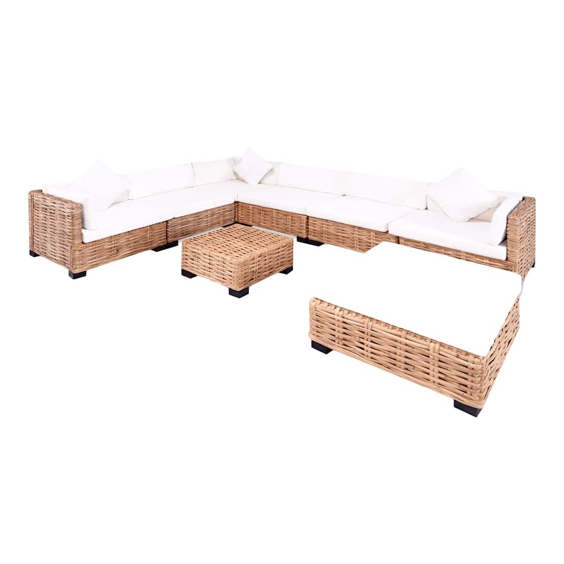 L'ensemble de canapés élégant et fonctionnel sera un excellent ajout à votre salon ! Le cadre est recouvert de rotin naturel, qui est non seulement attrayant avec son aspect naturel et ses motifs de tissage décoratifs, mais il est également durable concernant son utilisation. Les pieds du canapé sont en bois d'acajou de haute qualité. Les coussins ajoutent du confort et une sensation confortable. L'ensemble ajoutera un aperçu rustique à votre espace de vie ! L'assemblage est facile. La livraison comprend 3 segments de canapé d'angle, 3 segments de canapé central, 1 pouf, 1 table basse, 6 coussins de siège, 9 coussins de dossier, 1 coussin de pouf et 3 oreillers. Maximum 110 kg par siège. Soyez conscient du risque de feux ouverts et d'autres sources de forte chaleur à proximité du produ
