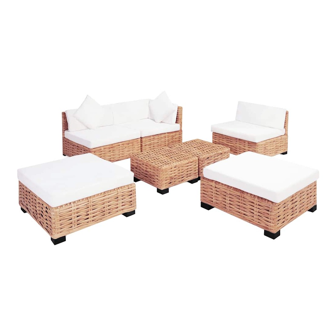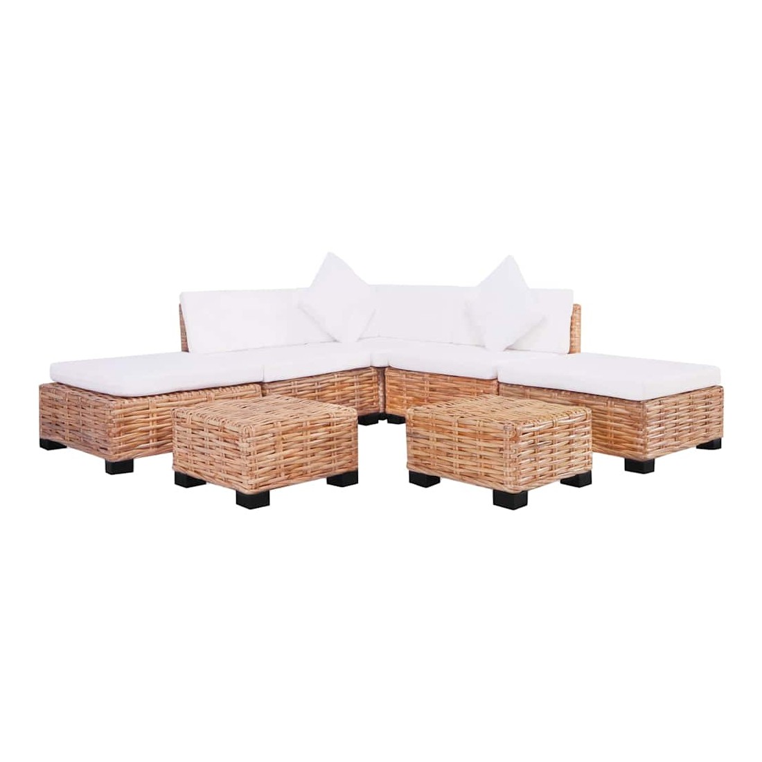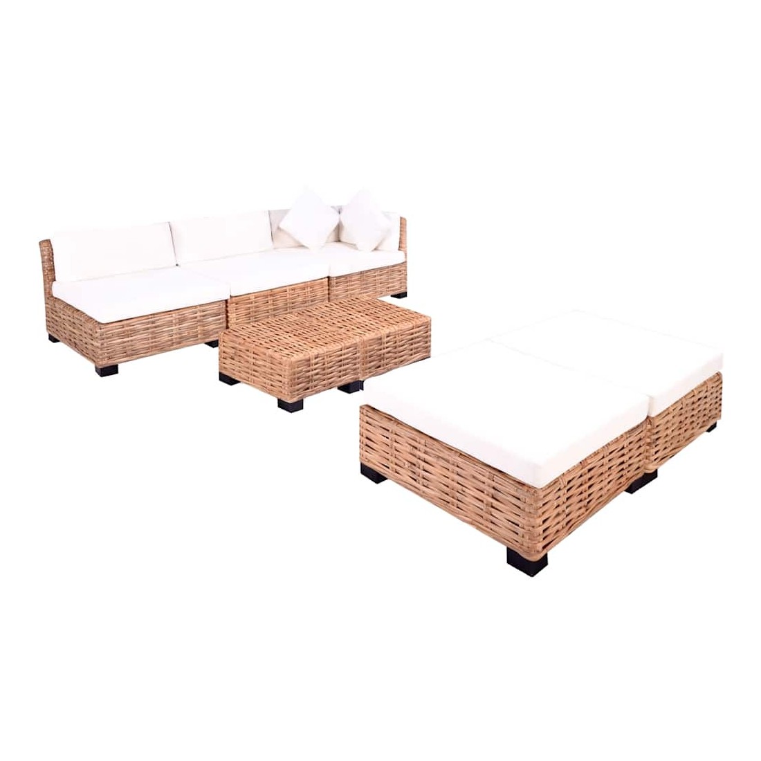 L'ensemble de canapés élégant et fonctionnel sera un excellent ajout à votre salon ! Le cadre est recouvert de rotin naturel, qui est non seulement attrayant avec son aspect naturel et ses motifs de tissage décoratifs, mais il est également durable concernant son utilisation. Les pieds du canapé sont en bois d'acajou de haute qualité. Les coussins ajoutent du confort et une sensation confortable. L'assemblage est facile. L'ensemble ajoutera un aperçu rustique à votre espace de vie ! La livraison inclut 1 segment de canapé d'angle, 2 segments de canapé central, 2 poufs, 2 tables basses, 3 coussins de siège, 4 coussins de dossier, 2 coussins de pouf et 2 oreillers.