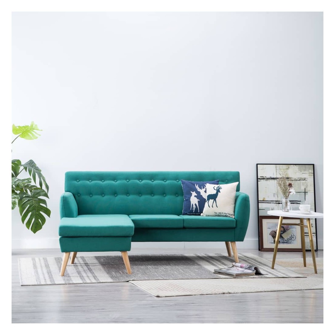 - Matériau : cadre en MDF avec revêtement en tissu et pieds en hévéa massif