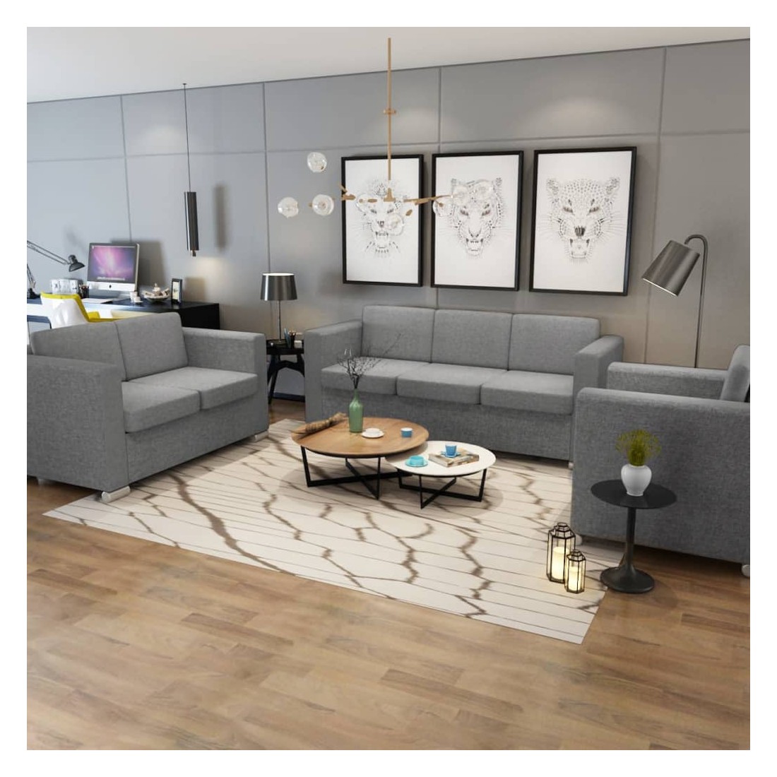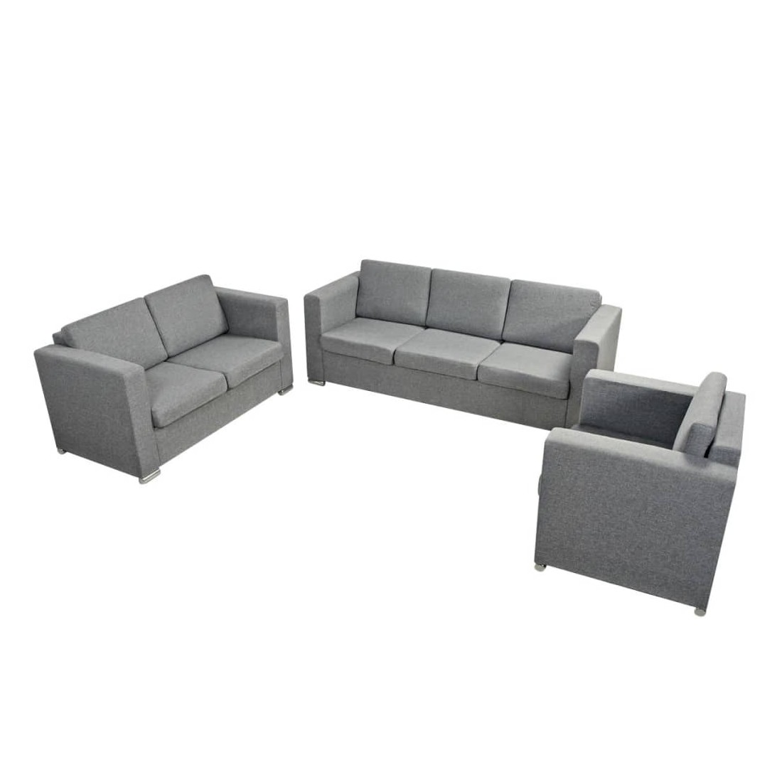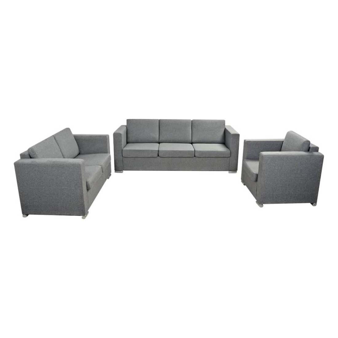 Cet ensemble élégant de canapés de 3 pièces sera un excellent accessoire à votre maison ou bureau. Que vous ayez besoin d'un espace d'assise confortable dans votre bureau, ou que vous souhaitiez un accessoire agréable et sophistiqué pour votre décor, cet ensemble de canapés sera un excellent choix ! L'ensemble de canapés dispose d'un large coin salon et de coussins épais et rembourrés pour un confort d'assise optimal. Il est tapissé en tissu de haute qualité qui est résistant à l'usure. Les housses de coussin sont faciles à nettoyer car elles sont amovibles et peuvent être lavées à la machine. Le cadre fort en bois et les pattes chromées contribuent à sa construction robuste. La livraison comprend 1 x canapé simple, 1 x canapé à 2 places et 1 x canapé à 3 places. L'assemblage est assez facile.