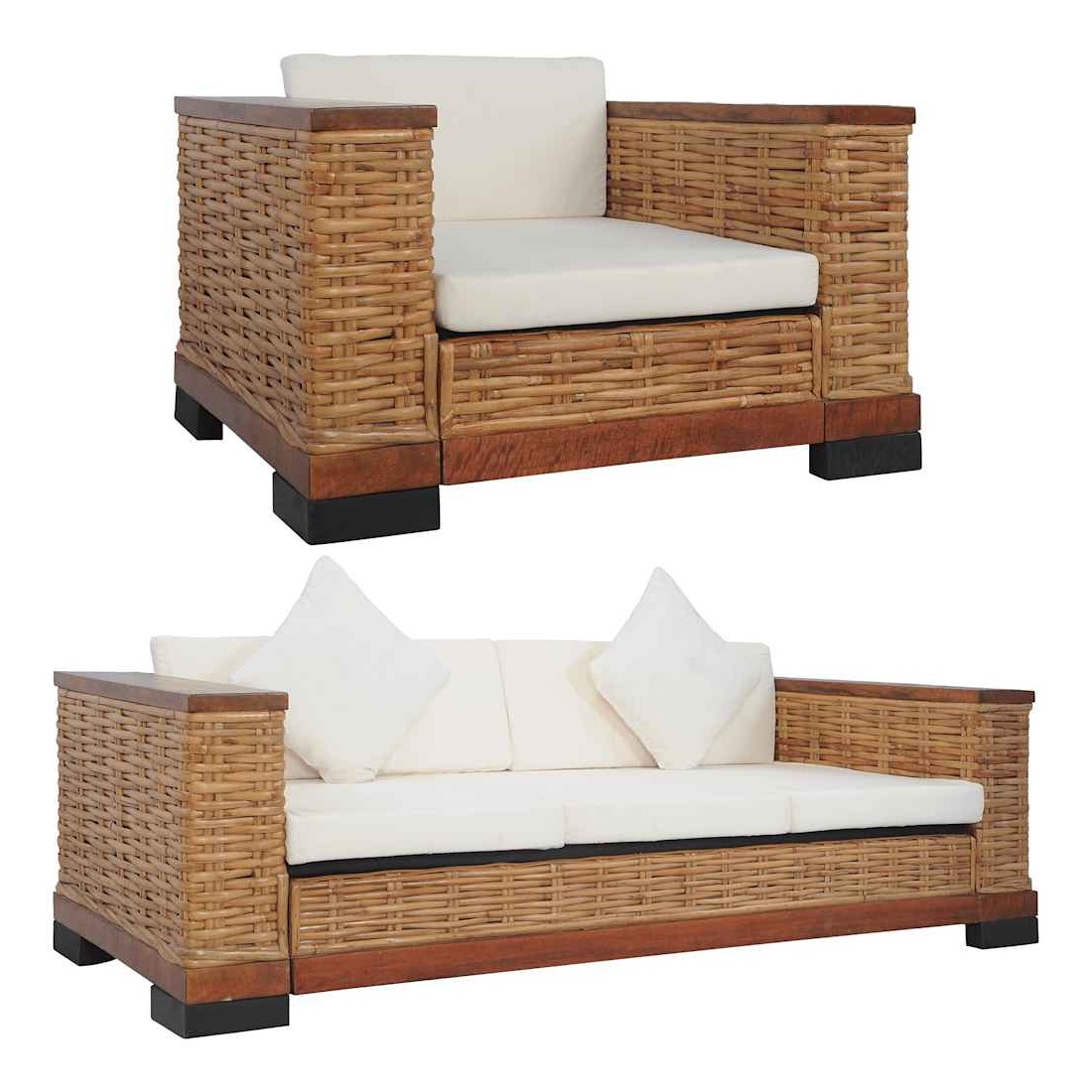 Cet ensemble de canapés en rotin associe style et fonctionnalité et sera un excellent ajout à votre maison. Grâce au matériau de rotin véritable, l'ensemble est facile à nettoyer, résistant à l'usure et adapté à une utilisation quotidienne. Il dispose d'un cadre en bois robuste, très durable et stable. Les coussins épais de dossier et de siège sont considérablement confortables et également lavables grâce à leurs housses amovibles. En outre, les accoudoirs larges s'ajoutent au confort de votre assise. La livraison inclut un fauteuil, un canapé à 3 places, 4 coussins de siège, 3 coussins de dossier et 2 oreillers.