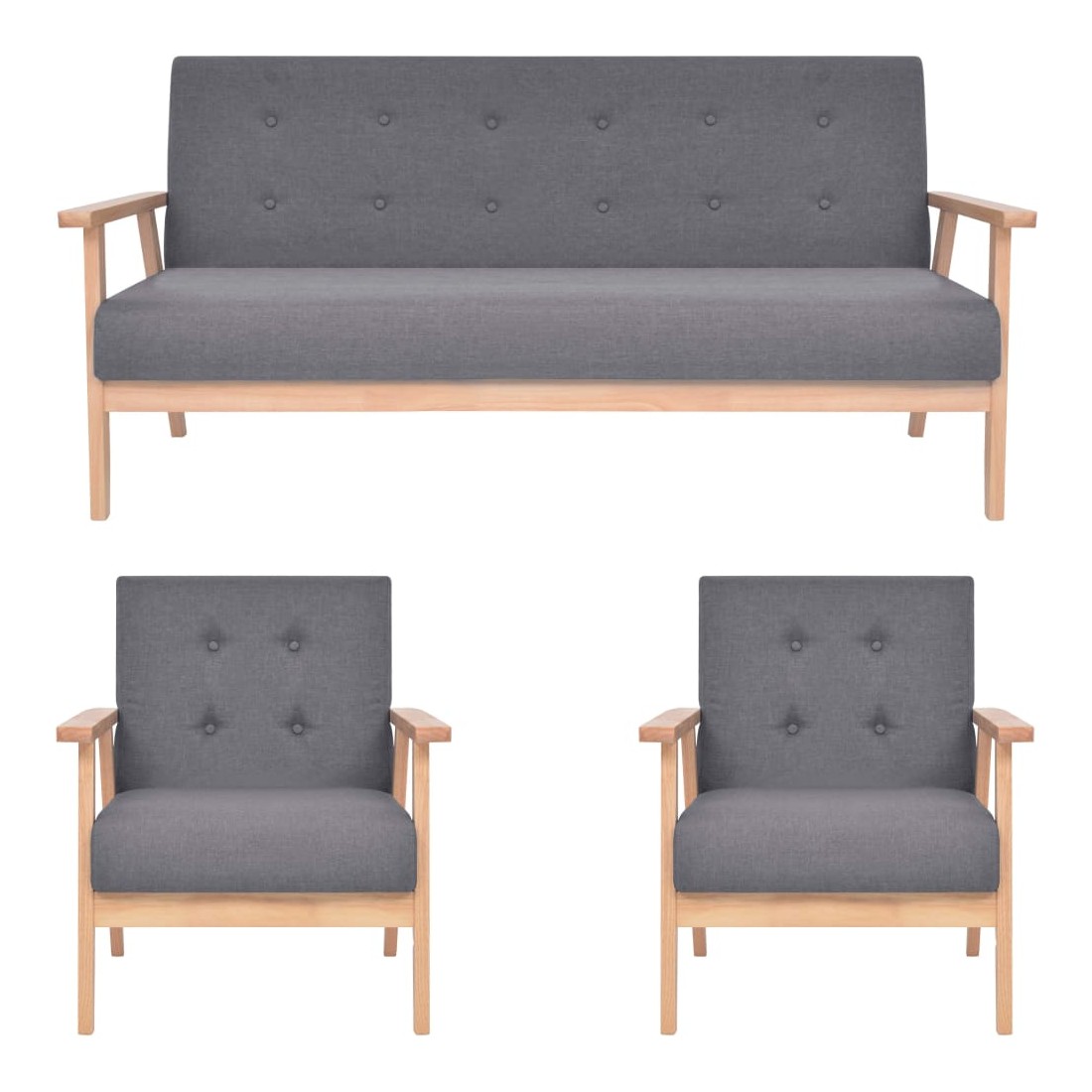 Cet ensemble de canapé très confortable, au design sobre, sera idéal pour lire, regarder la télévision ou simplement vous détendre. Le fauteuil et le canapé à 3 places sont tapissés d'un tissu polyester doux et rembourrés de mousse pour plus de confort. Avec un cadre en bois massif, le fauteuil est stable et durable. L'assemblage est vraiment facile. La livraison comprend 2 fauteuils et un canapé.