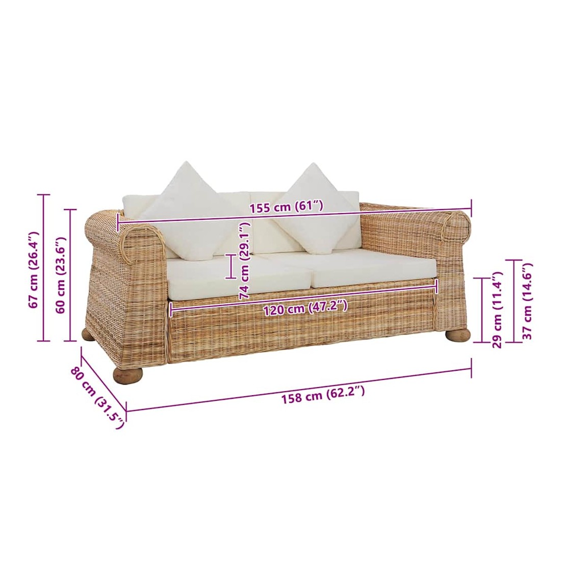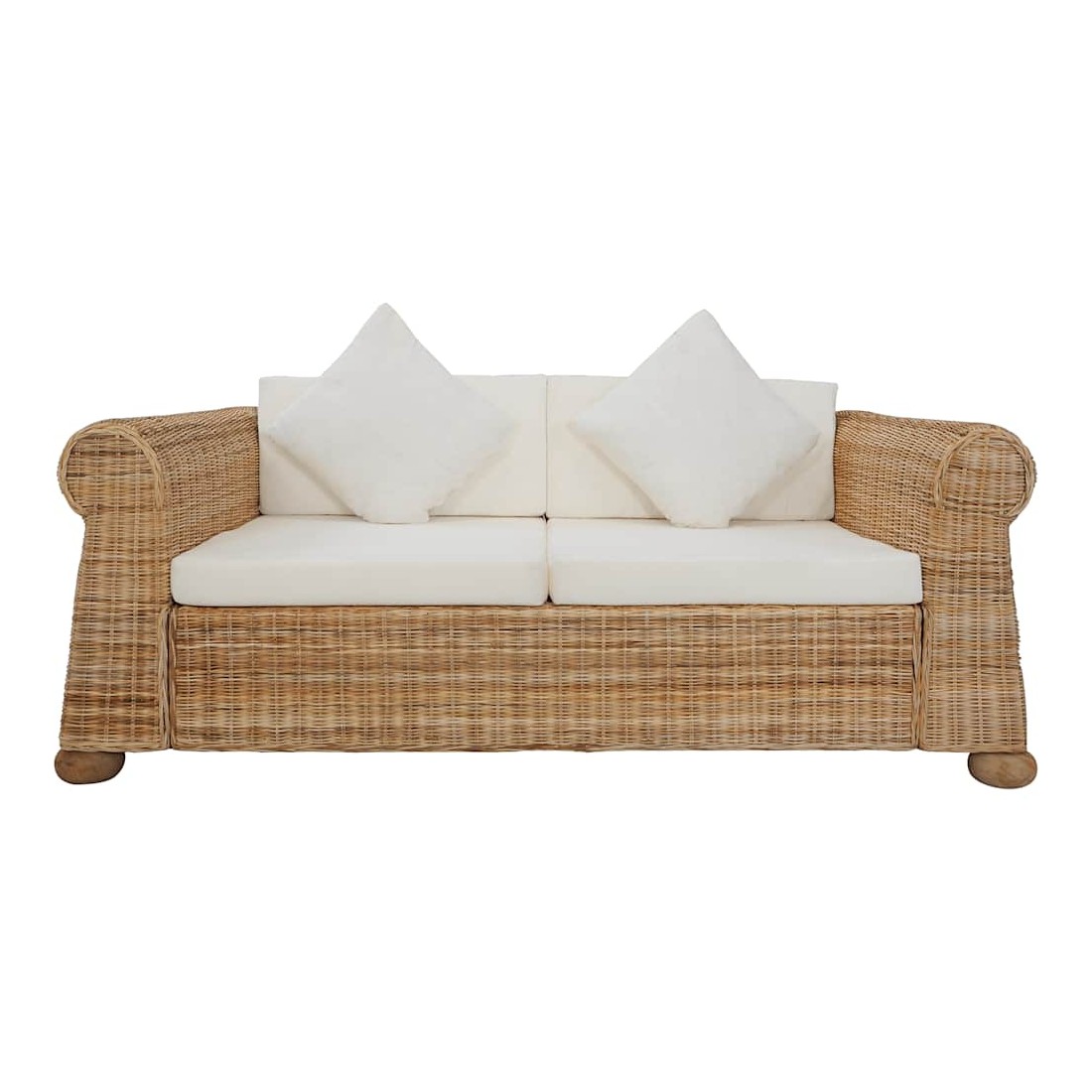 Ce canapé en rotin associe style et fonctionnalité et sera un excellent ajout à votre maison. Grâce au véritable matériau de rotin naturel, le canapé est facile à nettoyer, résistant à l'usure et adapté à une utilisation quotidienne. Il dispose d'un cadre en bois robuste, très durable et stable. Les coussins épais de dossier et de siège sont considérablement confortables et également lavables grâce à leurs housses amovibles. En outre, les accoudoirs larges s'ajoutent au confort de votre siège. La livraison comprend un canapé à 2 places, 2 coussins de siège, 2 coussins de dossier et 2 oreillers. Maximum 110 kg par siège. Soyez conscient du risque de feux ouverts et d'autres sources de forte chaleur à proximité du produit.
