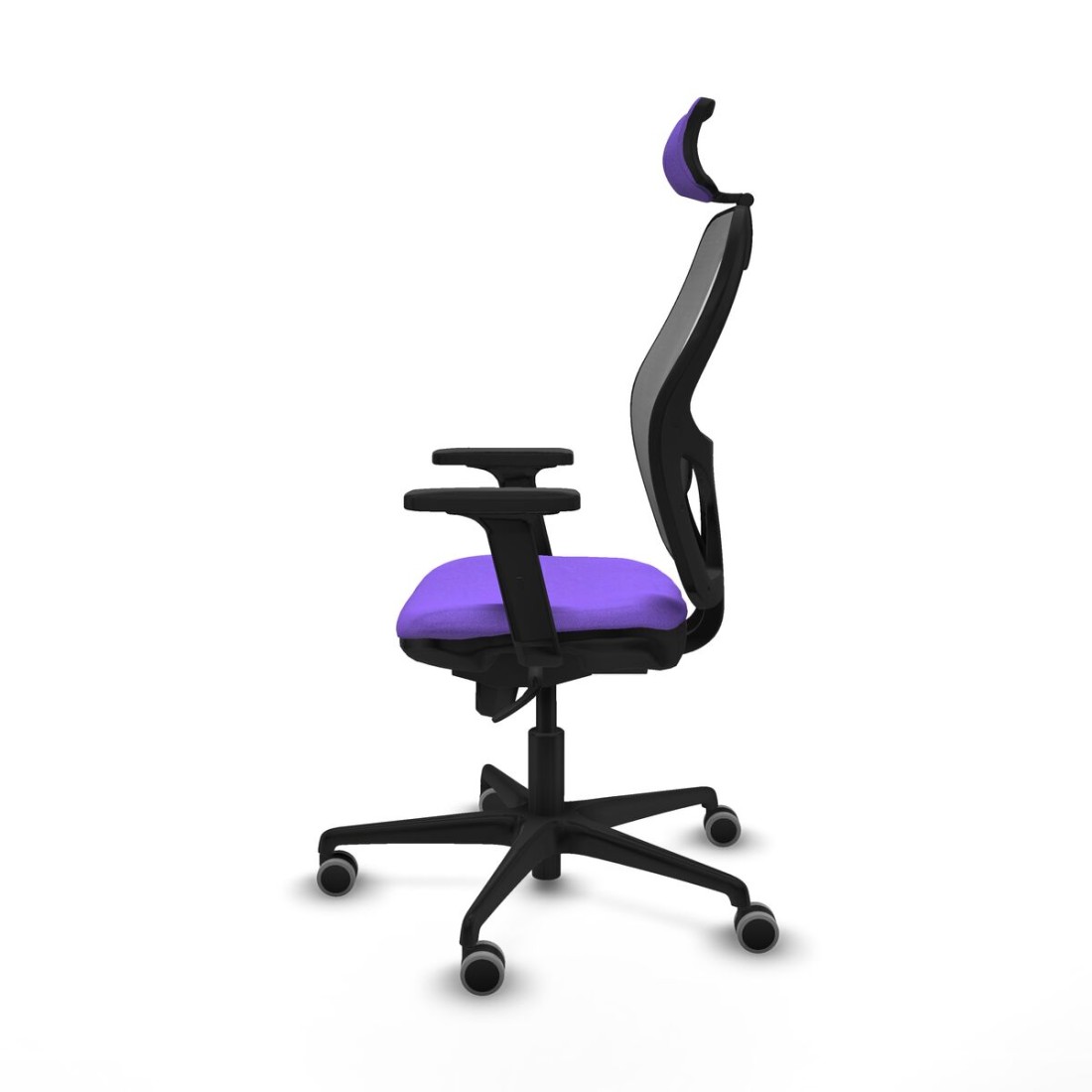 Piqueras y CrespoDer Bürostuhl mit Kopfstütze 2D036G2 von Piqueras y Crespo ist ein Modell, das Ergonomie und Widerstandsfähigkeit für anspruchsvolle professionelle Umgebungen bietet. Er ist für eine durchgehende Nutzung von bis zu 24 Stunden geeignet und trägt ein Maximalgewicht von 120 kg. Dieser Bürostuhl verfügt über eine 2D-verstellbare Kopfstütze, die eine individuelle Nackenstütze bietet, ergänzt durch eine verstellbare Lordosenstütze, die eine korrekte Körperhaltung fördert und Ermüdung bei langen Arbeitstagen reduziert. Die Rückenlehne ist fest, was Stabilität garantiert, während der Sitz aus hochdichtem Schaumstoff (50 kg/m³) mit einer Stärke von 50 mm gefertigt ist und so für angemessenen Komfort und gute Dämpfung sorgt. Zudem besitzt er 2D-Armlehnen, die sowohl in der Höhe als auch im Winkel verstellbar sind und zusätzliche Unterarmstütze bieten. Der Stuhl ist mit einem Synchro-Mechanismus mit fünf Positionen ausgestattet, der eine koordinierte Neigung von Rückenlehne und Sitz ermöglicht, sowie mit einer höhenverstellbaren Sitzfläche von 48 bis 61 cm, die sich an unterschiedliche Nutzer und Arbeitspräferenzen anpasst. Das atmungsaktive Design kombiniert Mesh und Stoff in lila und sorgt für gute Belüftung bei gleichzeitig ansprechender Optik. Für die Bewegung auf harten Böden sind 65 mm gummierte Nylonrollen montiert, die zudem empfindliche Böden wie Parkett schützen. Die Basis besteht aus einem schwarzen Nylon-Fünfstern, der Stabilität und Langlebigkeit gewährleistet. Der Stuhl erfüllt die europäische Norm UNE-EN-1335 sowie die BIFMA-Zertifizierung, die Qualität und ergonomisches Design bestätigen. Mit einer Gesamtbreite von 68 cm und einer Sitzbreite von 48 cm vereint der 2D036G2 Funktionalität, Anpassungsfähigkeit und ein elegantes Finish und ist somit eine ideale Lösung für alle, die einen ergonomischen, komfortablen und langlebigen Bürostuhl suchen – sowohl für professionelle Arbeitsplätze als auch für das Homeoffice.