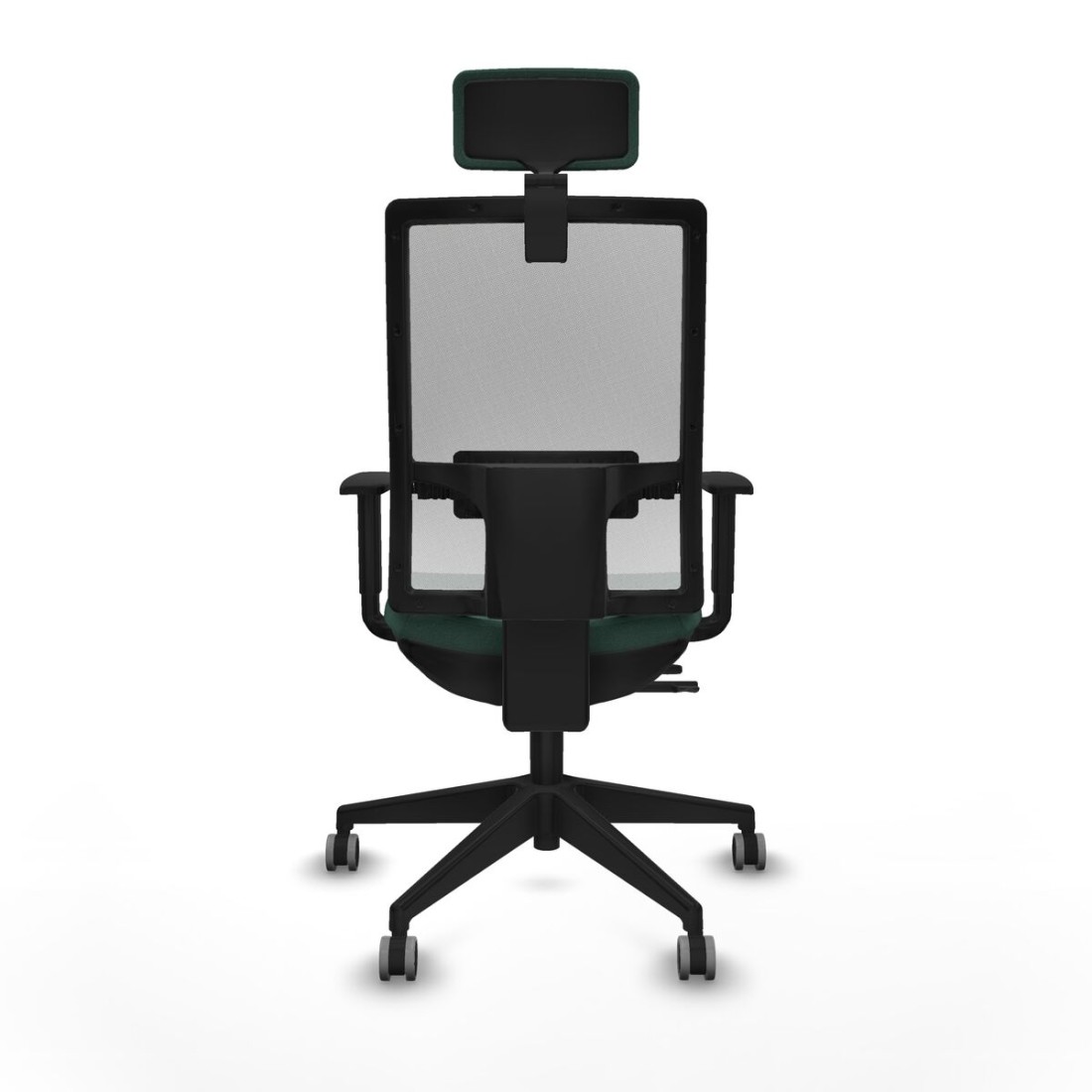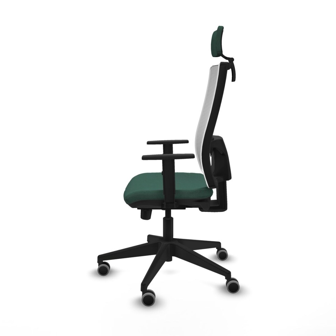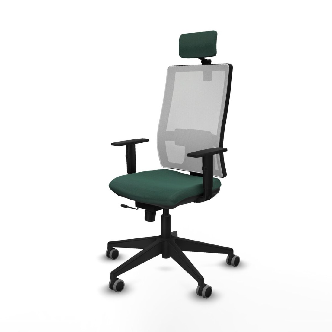 Piqueras y CrespoDer Bürostuhl mit Kopfstütze Horna von Piqueras y Crespo ist eine ergonomische Lösung, die Komfort und Langlebigkeit in anspruchsvollen Arbeitsumgebungen bietet. Er ist für eine durchgehende Nutzung von bis zu 24 Stunden und ein maximales empfohlenes Gewicht von 120 kg ausgelegt. Dieser Bürostuhl in flaschengrün besteht aus hochwertigen Materialien, darunter eine pyramidenförmige Basis aus glasfaserverstärktem Nylon mit fünf Speichen und einem Durchmesser von 640 mm, die Stabilität und Robustheit gewährleistet. Der Sitz kombiniert eine Laminatholzstruktur mit hochdichtem Polyurethanschaum (50 mm dick, 25 Kg/m³), der außen mit 1 mm Kunststoff überzogen ist, um die Haltbarkeit zu erhöhen. Die Rückenlehne besteht aus atmungsaktivem 100 % PES-Mesh, das für Belüftung sorgt und Wärmestau bei langen Arbeitstagen verhindert. Das Modell verfügt über 1D-Armlehnen für einstellbare Unterstützung in einer Ebene sowie eine 2D-verstellbare Kopfstütze, die zusammen mit der höhenverstellbaren Rückenlehne und der einstellbaren Lendenstütze eine vollständige ergonomische Unterstützung bietet, die eine korrekte Haltung fördert und Muskelermüdung reduziert. Der Sincro/Traslack-Mechanismus ermöglicht eine präzise Einstellung der Neigung von Sitz und Rückenlehne sowie eine horizontale Sitzverschiebung von bis zu 5 cm, was eine optimale Anpassung der Sitzposition erlaubt. Die 65 mm großen, gummierten Nylonrollen mit Stahlachsen sorgen für eine ruhige, sichere und sanfte Bewegung, besonders geeignet für Parkettböden. Das Design mit Mesh- und Stoffbezug verbindet Funktionalität mit modernem Stil und passt zu zeitgemäßen Büros und Arbeitsbereichen, die robuste und bequeme Möbel benötigen. Dieser Stuhl eignet sich sowohl für klassische Büros als auch für Arbeitsplätze mit hohen Tischen und bietet dank seiner ergonomischen und verstellbaren Komponenten eine besondere Anpassungsfähigkeit. Insgesamt stellt der Horna-Stuhl eine technisch fortschrittliche Option unter den guten Bürostühlen dar, die Komfort, Widerstandsfähigkeit und funktionales Design für intensiven professionellen Einsatz vereint.