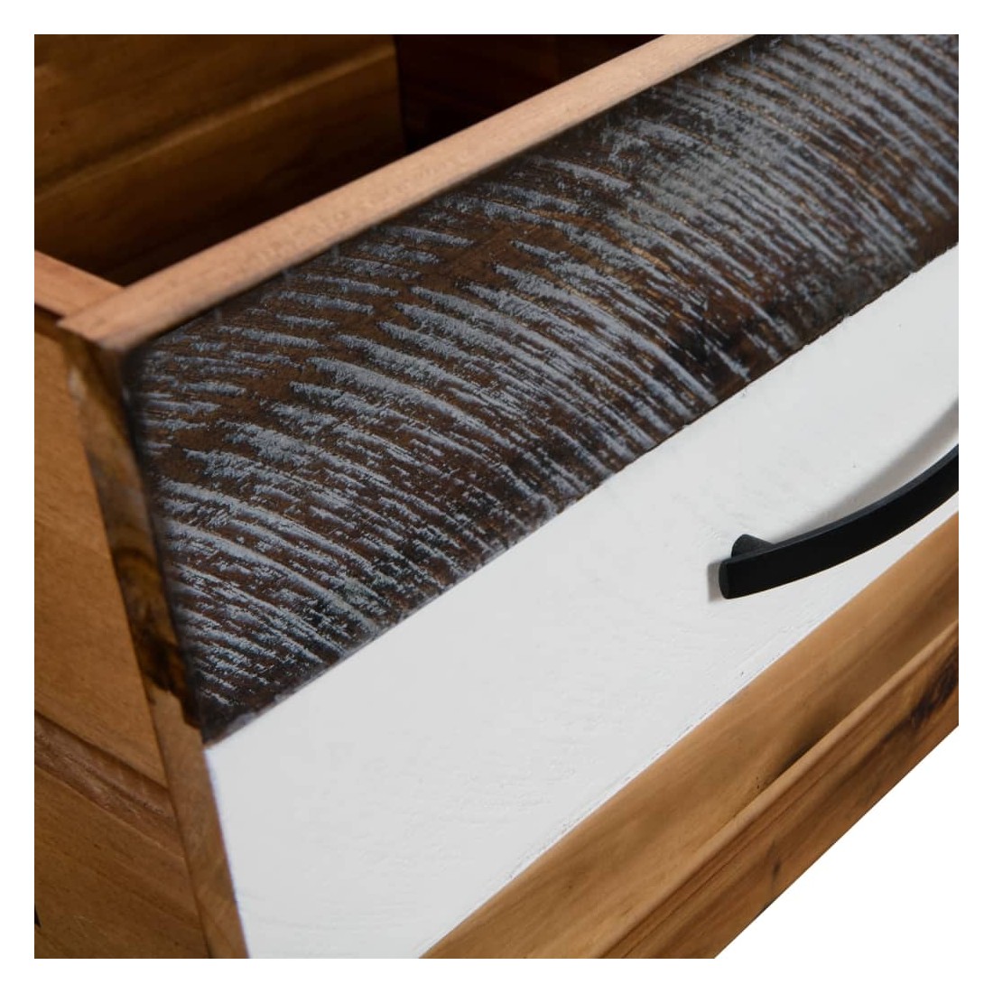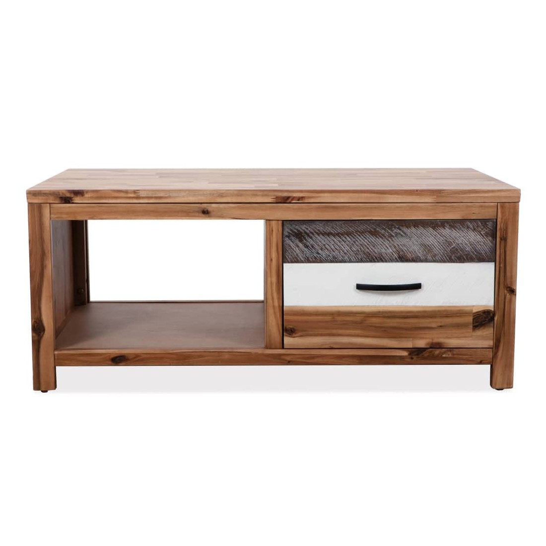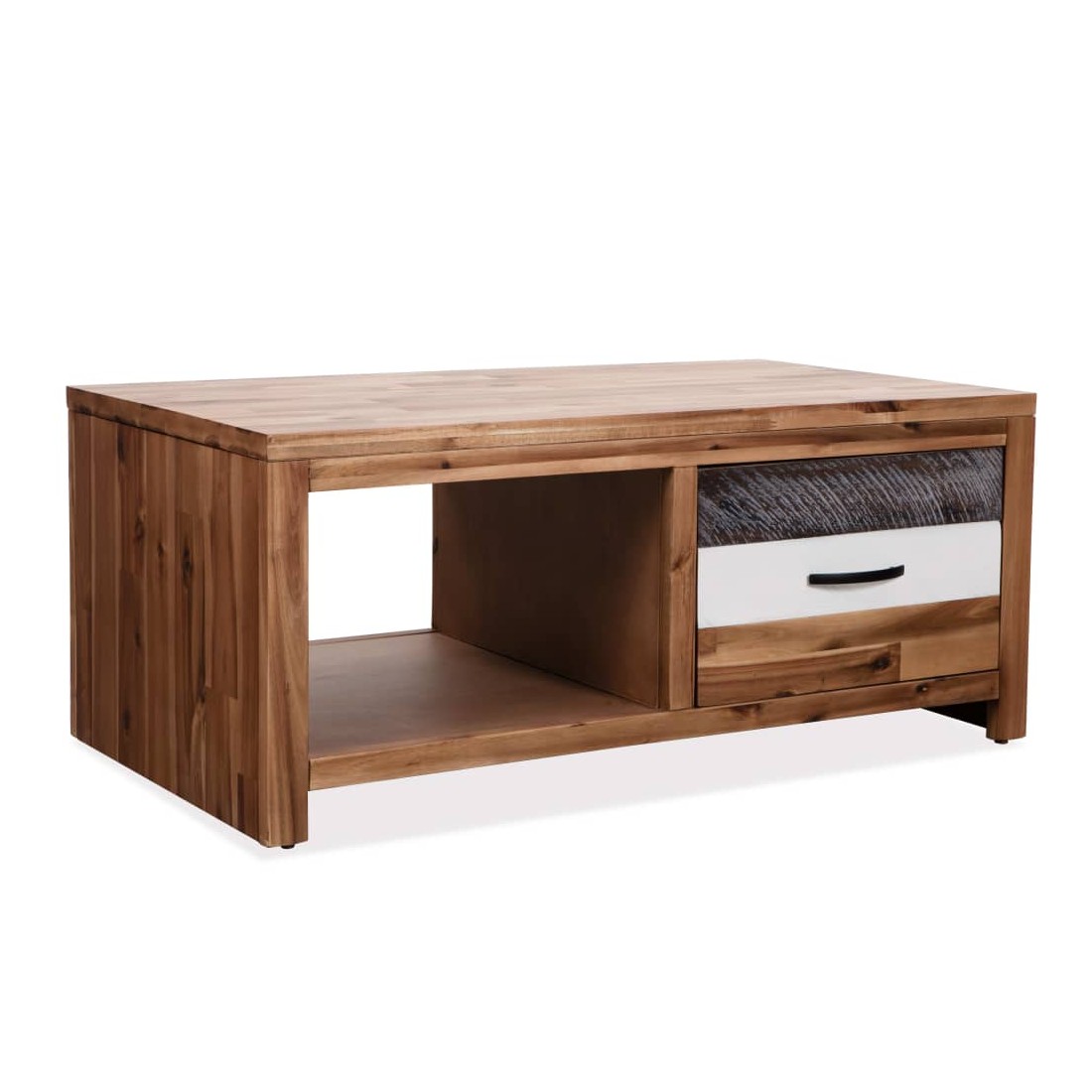 Cette table basse en bois sera un excellent supplément à la décoration de votre salon. La table est fabriquée en bois d'acacia massif, ce qui la rend très robuste et durable. La façade du tiroir a été peinte en noir et blanc contrasté, ce qui lui donne un aspect unique. Le couvercle robuste est idéal pour placer vos boissons, aliments, paniers de fruits ou autres objets décoratifs. Le tiroir et l'étagère offrent suffisamment d'espace pour ranger et mettre à portée de main toutes sortes d'objets, tels que livres, magazines et télécommandes. L'assemblage est facile. Remarque importante : Les couleurs et les grains de bois peuvent varier d'une pièce à l'autre, ce qui rend chaque article unique et légèrement différent l'un de l'autre. La livraison est aléatoire, ce qui garantit l'exclusivi