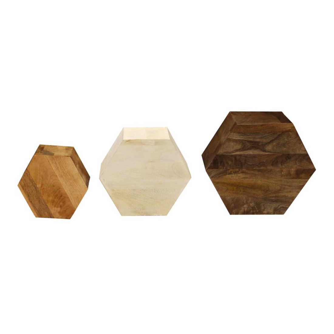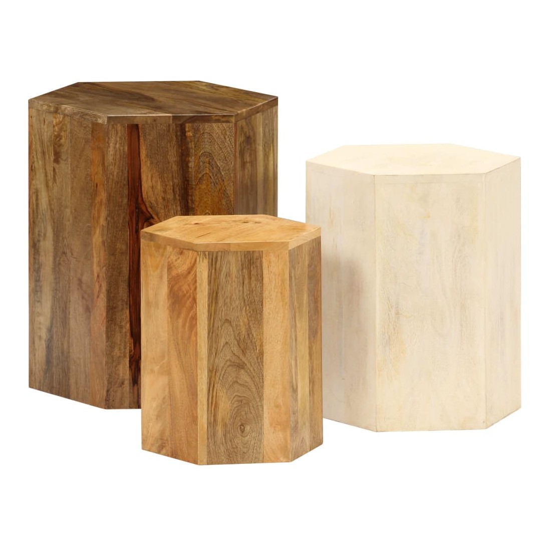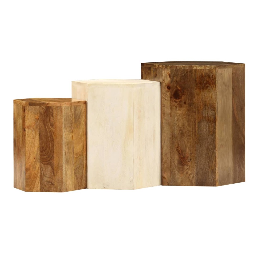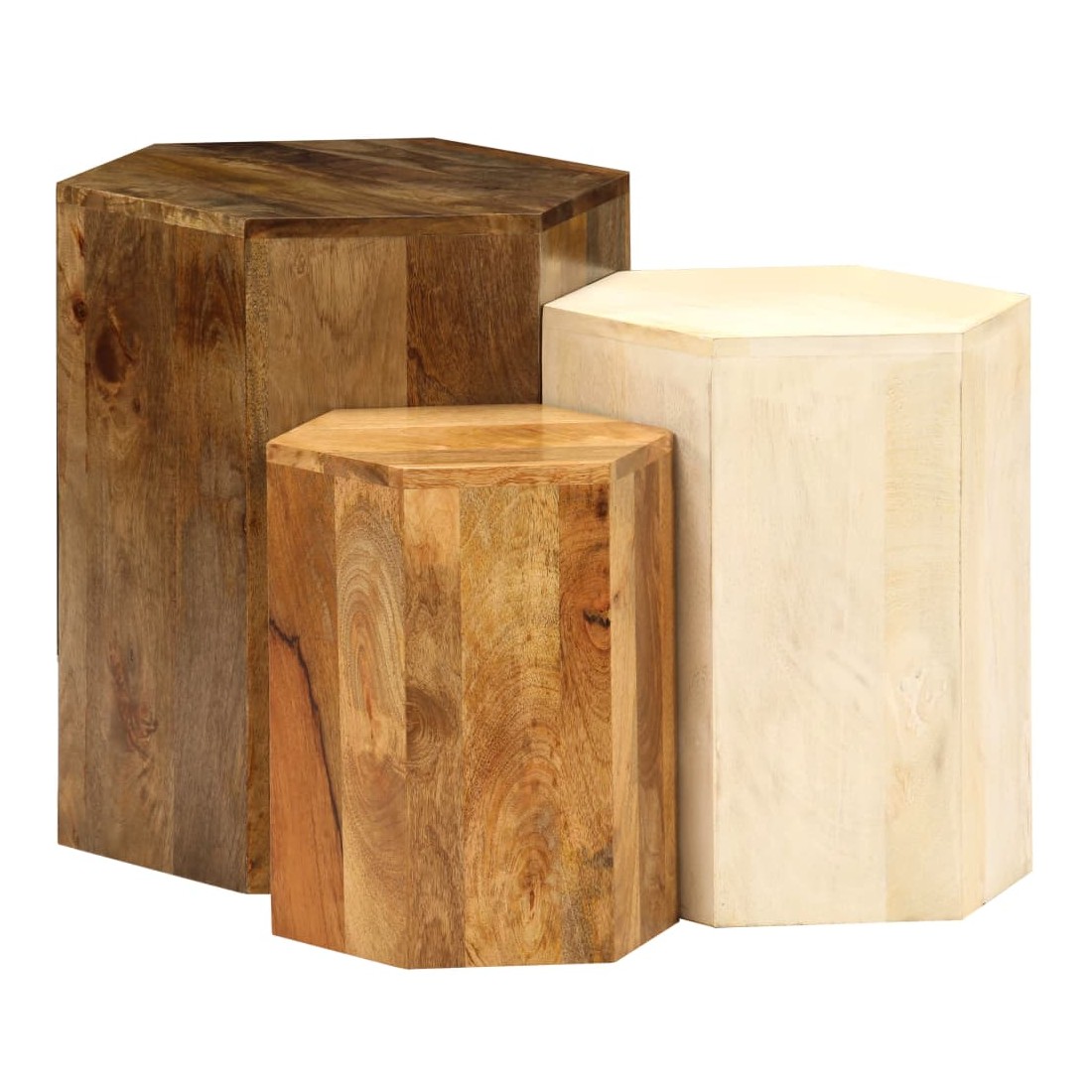 Cet ensemble de trois tables basses dégage un charme vintage et apportera une touche intemporelle à votre maison. Ces tables peuvent également être utilisées comme tables auxiliaires ou tables d'appoint. Ces tables d'appoint sont fabriquées à la main en bois de manguier massif, un bois stable, durable et esthétique. Leur savoir-faire artisanal contribue à leur style rétro spectaculaire. Chaque étape du processus de fabrication est réalisée avec le plus grand soin, que ce soit le polissage, la peinture ou le laquage. Le savoir-faire artisanal et les beaux grains de bois rendent chaque meuble unique et légèrement différent du suivant. Les articles sont déjà assemblés ; aucun assemblage n'est requis. La livraison inclut 3 tables basses de différentes tailles. Remarque importante : les grains et les couleurs varient d'une pièce à l'autre, ce qui rend chacune de nos armoires unique. La livraison est aléatoire, ce qui garantit l'exclusivité et l'individualité de votre produit.