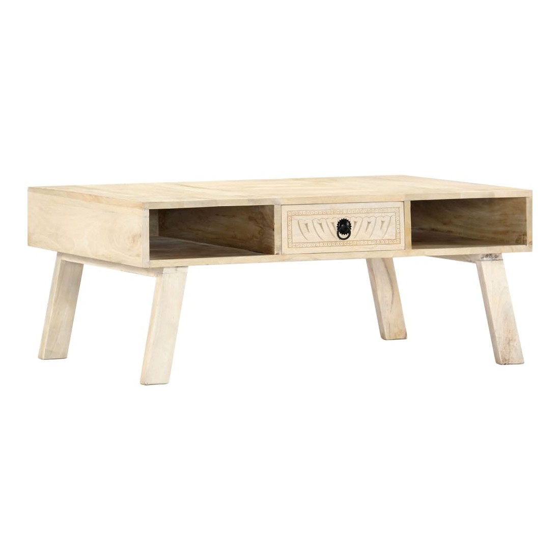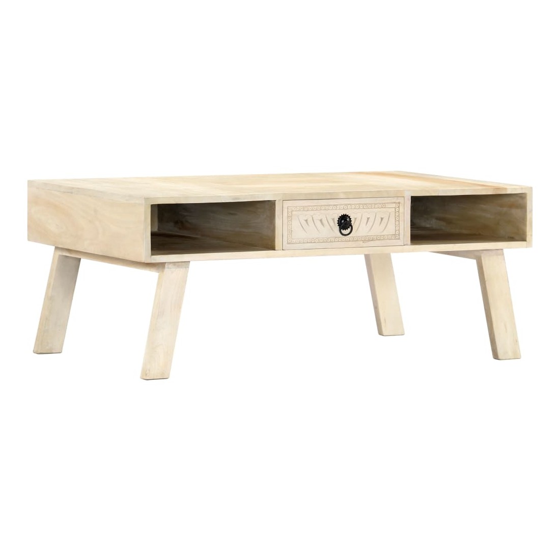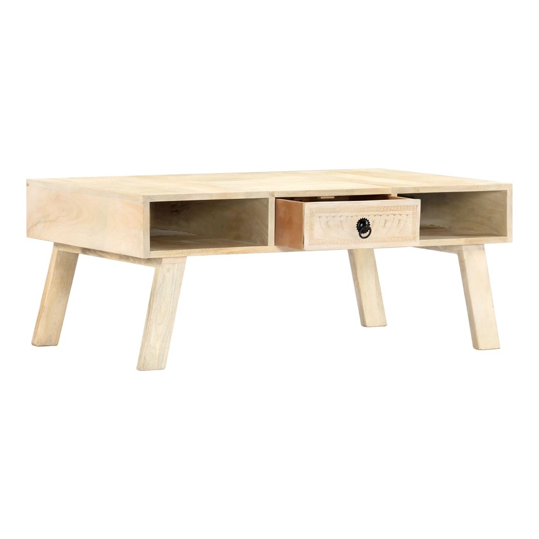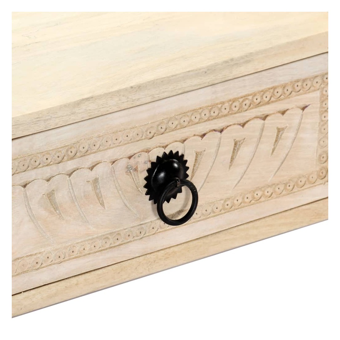 Cette table basse intemporelle en bois à sculpture à la main apportera une touche distinctive à votre décoration intérieure ! La table de canapé est fabriquée en bois de manguier solide, un bois dur à grains denses. Le bois brut de manguier a non seulement la force de supporter le poids, mais résiste également à l'usure du temps. Chaque étape du processus est réalisée avec le plus grand soin, que ce soit le polissage ou le laquage. Le savoir-faire exquis et la gravure à la main accrocheuse rendent chaque meuble distinctif et légèrement différent l'un de l'autre. De plus, avec 1 tiroir et 2 compartiments ouverts, cette table de salon offre un grand espace de rangement pour divers petits objets. La table est facile à assembler. Remarque importante : les couleurs peuvent varier d'une pièc