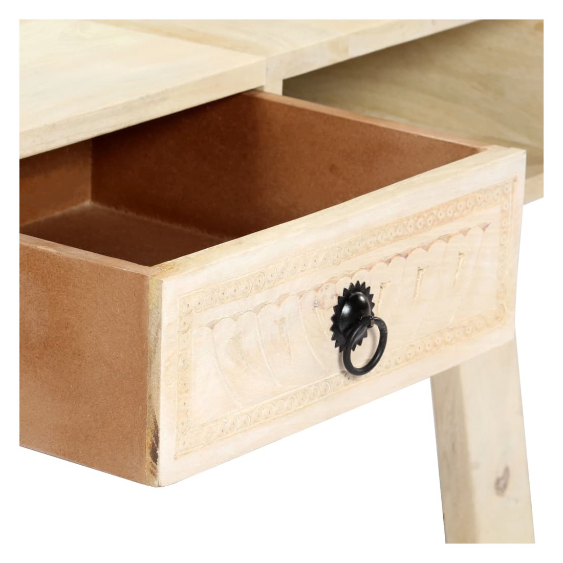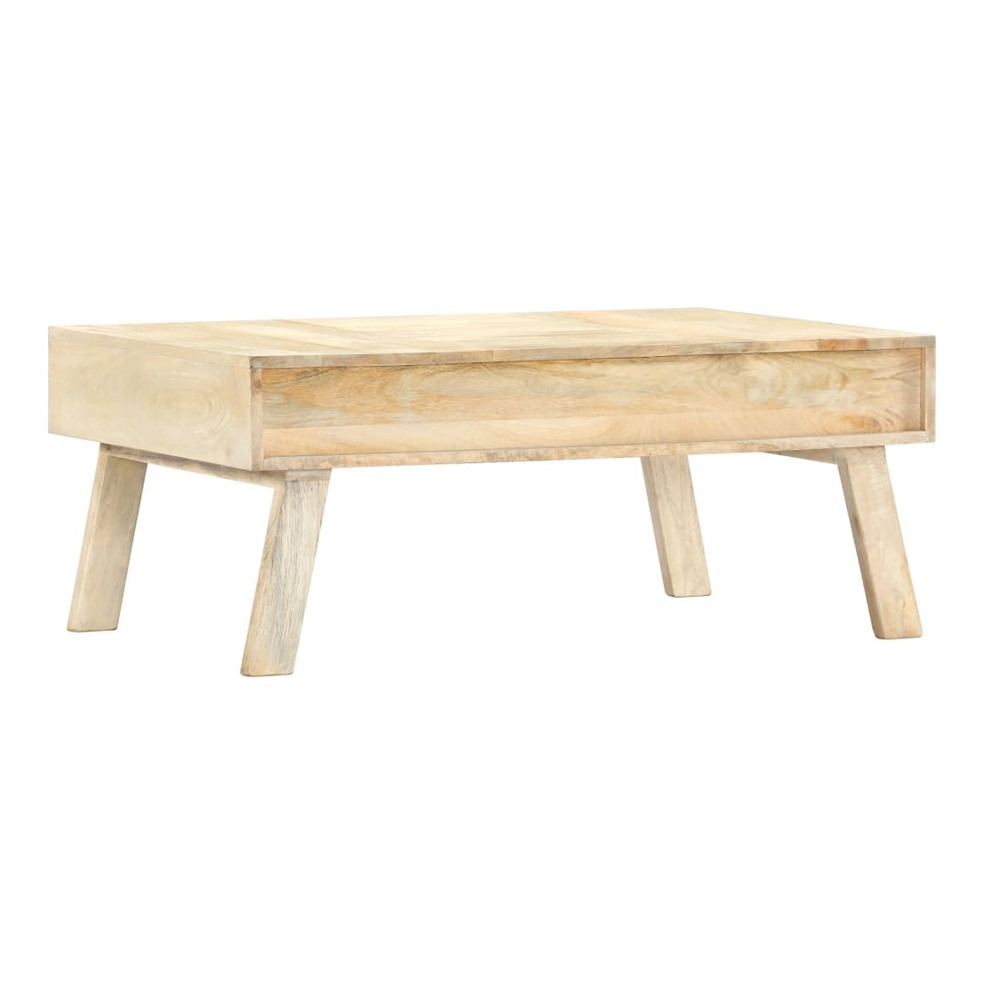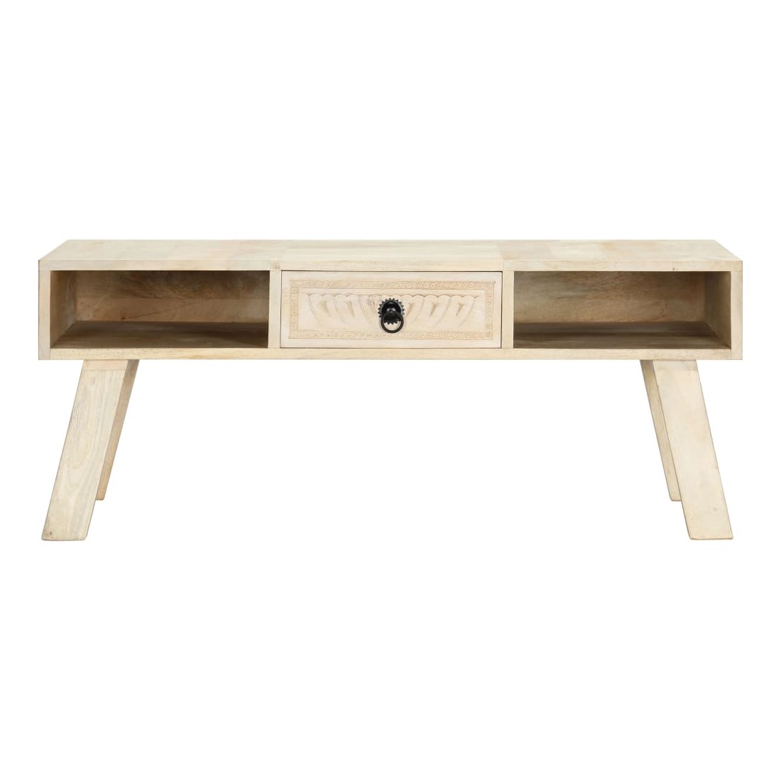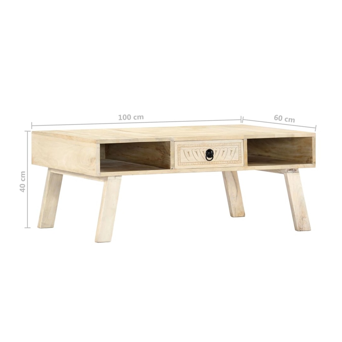 Cette table basse intemporelle en bois à sculpture à la main apportera une touche distinctive à votre décoration intérieure ! La table de canapé est fabriquée en bois de manguier solide, un bois dur à grains denses. Le bois brut de manguier a non seulement la force de supporter le poids, mais résiste également à l'usure du temps. Chaque étape du processus est réalisée avec le plus grand soin, que ce soit le polissage ou le laquage. Le savoir-faire exquis et la gravure à la main accrocheuse rendent chaque meuble distinctif et légèrement différent l'un de l'autre. De plus, avec 1 tiroir et 2 compartiments ouverts, cette table de salon offre un grand espace de rangement pour divers petits objets. La table est facile à assembler. Remarque importante : les couleurs peuvent varier d'une pièc