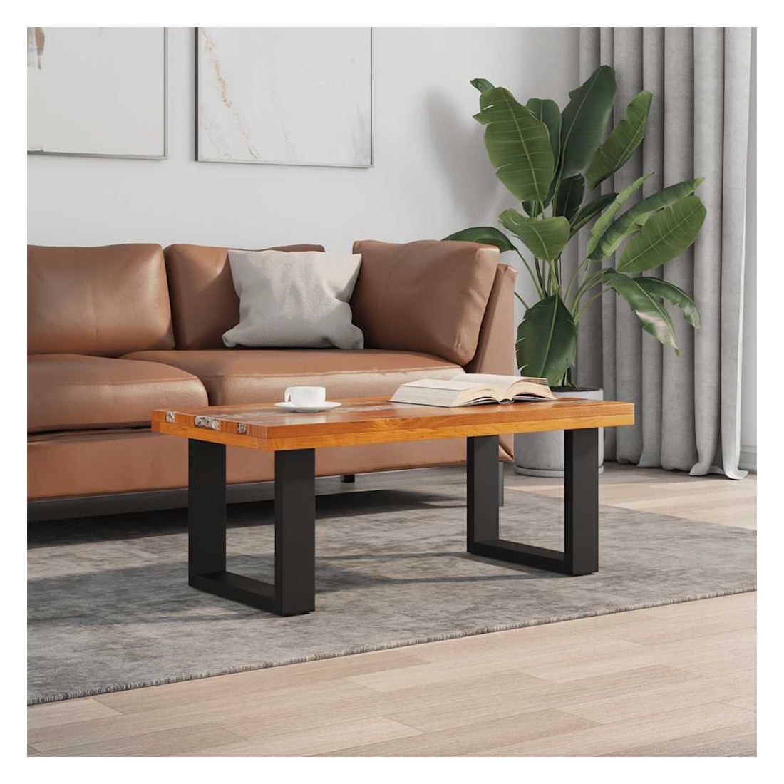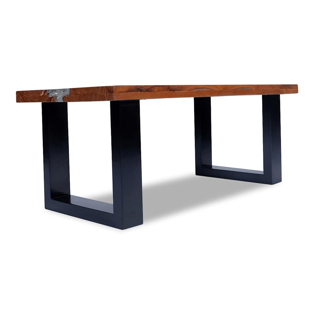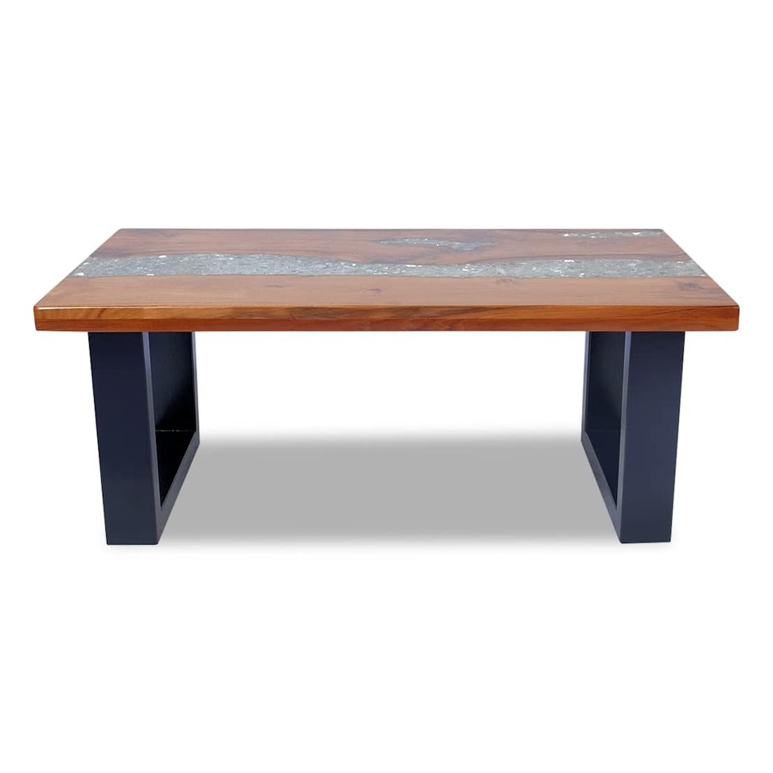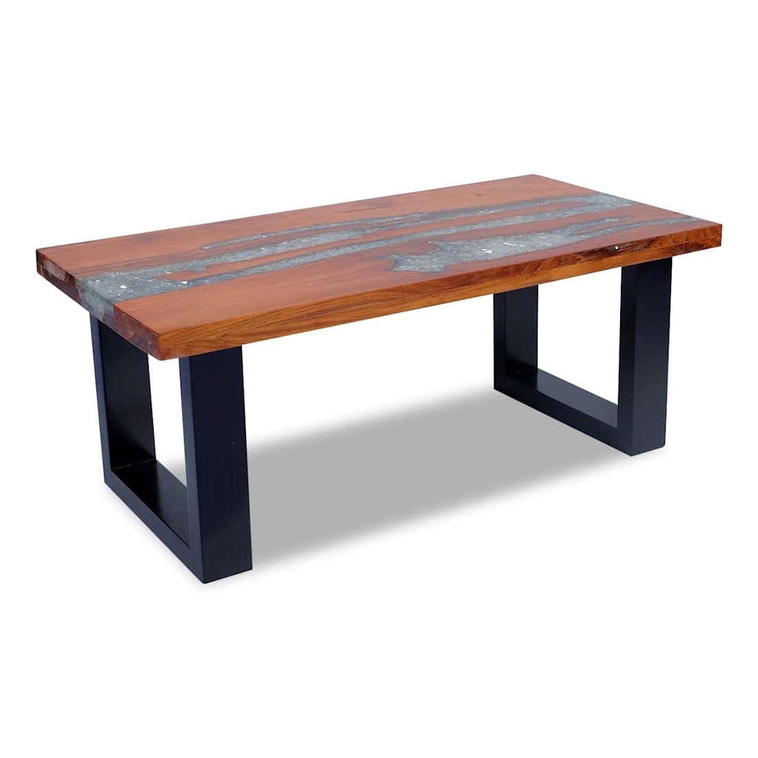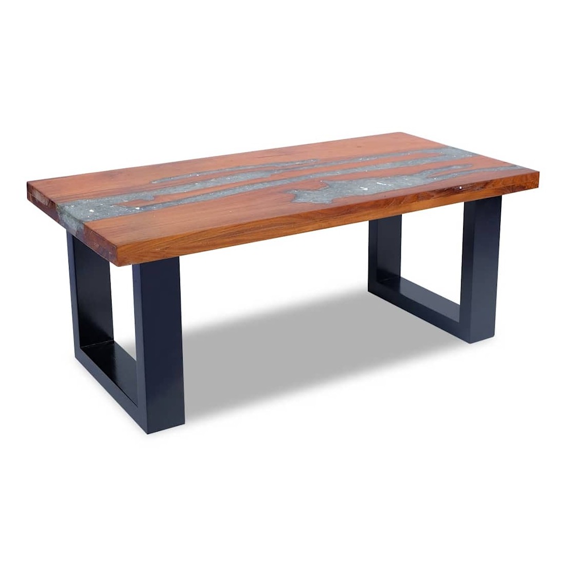 Cette table basse unique, en bois de teck et de manguier massif avec une décoration en résine transparente, exsude un charme rustique et est un véritable attrait. Son dessus de table rectangulaire offre une surface stable et sécurisée sur laquelle vous pouvez placer vos boissons, vases, bols de fruits ou ornements. La table basse peut également servir de table d'appoint. Le dessus de table est entièrement fait à la main et l'artisanat ajoute à son aspect luxueux. La base est faite de bois de manguier robuste avec une finition de peinture noire. L'assemblage est vraiment simple. Remarque importante : car le bois est un produit naturel, les couleurs et les formes des grains varient d'une pièce à l'autre, rendant chacun de nos tables basses unique et différente de l'autre. La livraison est aléatoire, ce qui garantit l'exclusivité et l'individualité de votre produit.