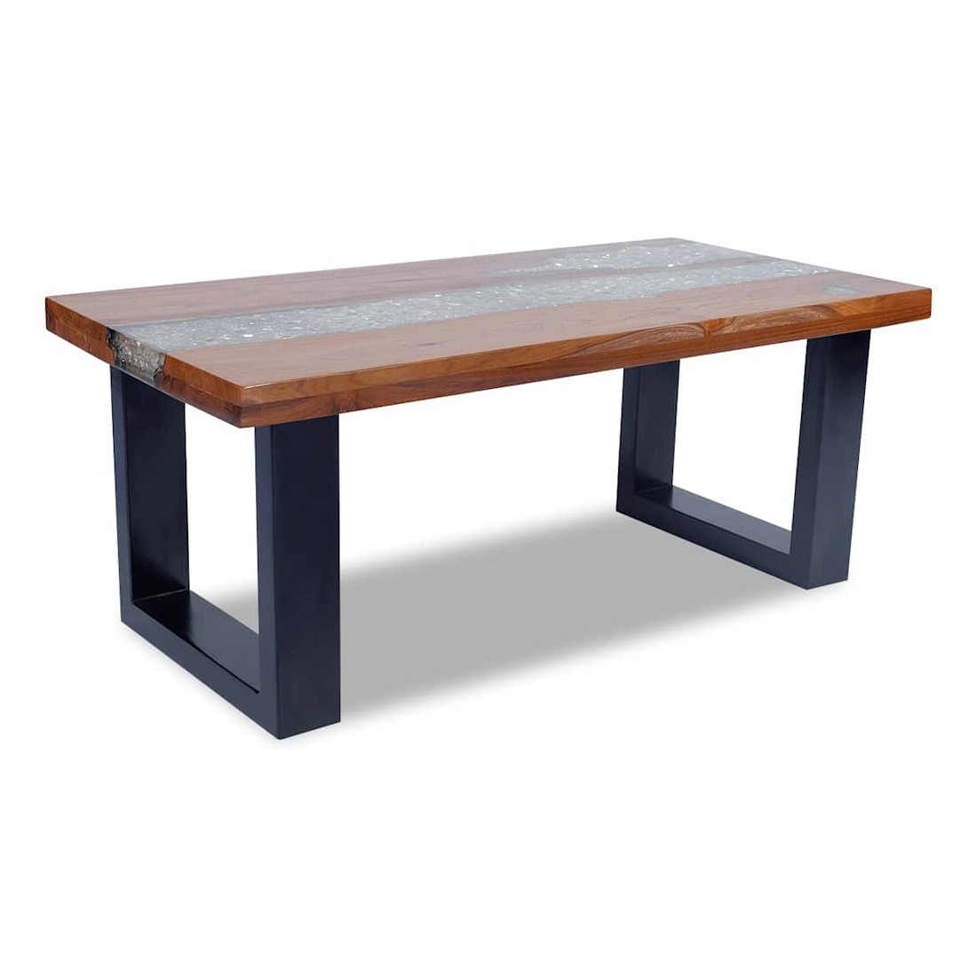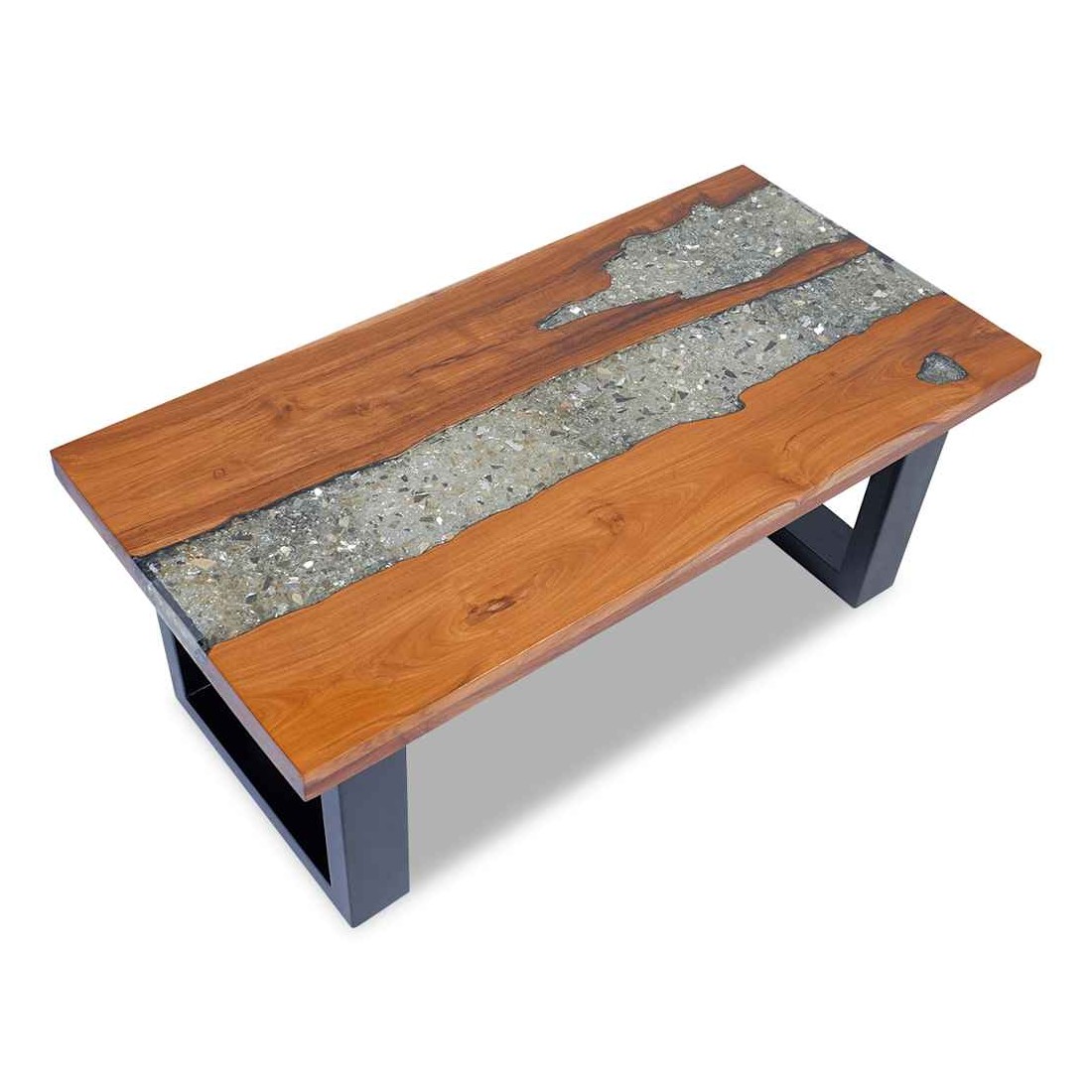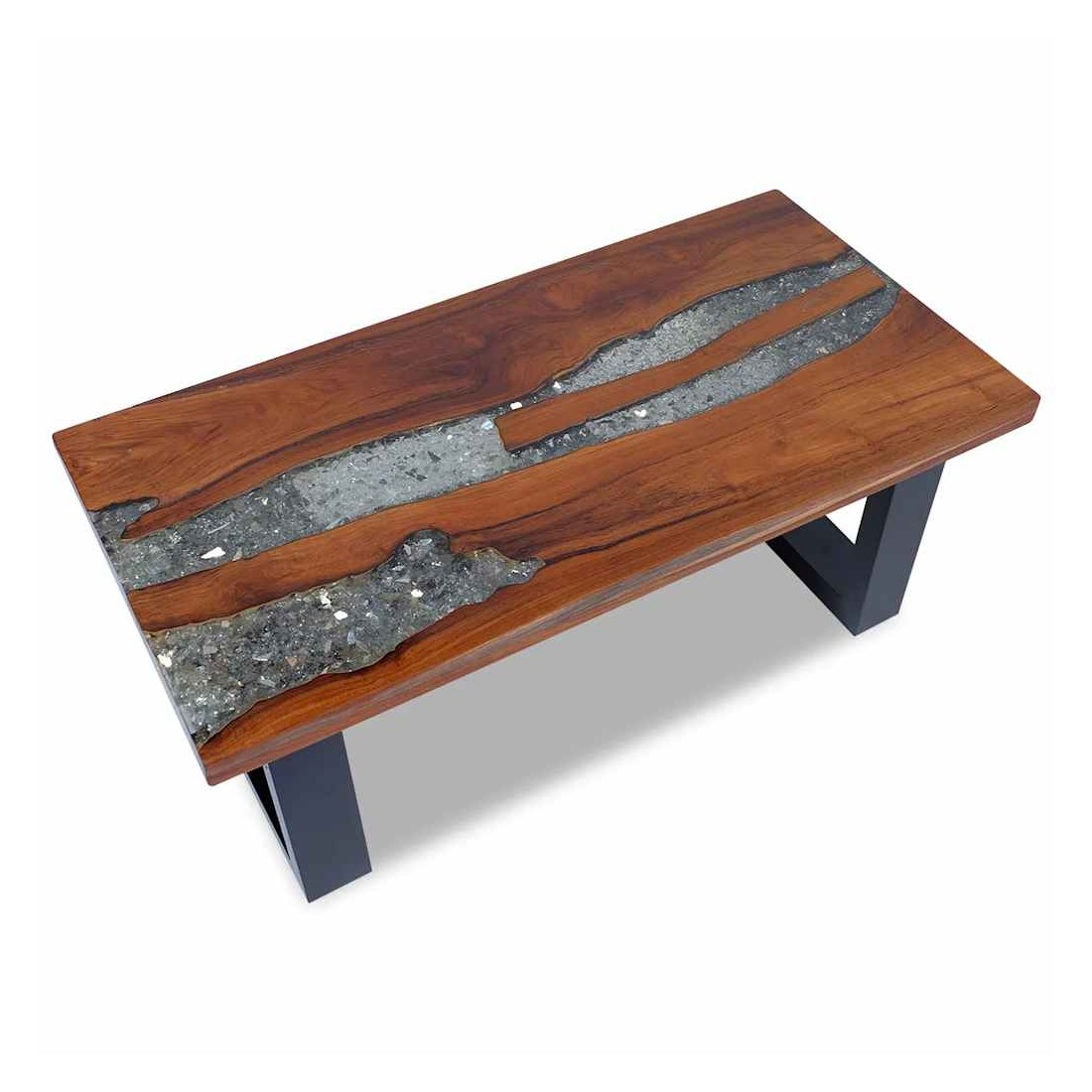 - Matériau du dessus de table : teck massif avec finition laquée transparente + résine transparente avec verre concassé