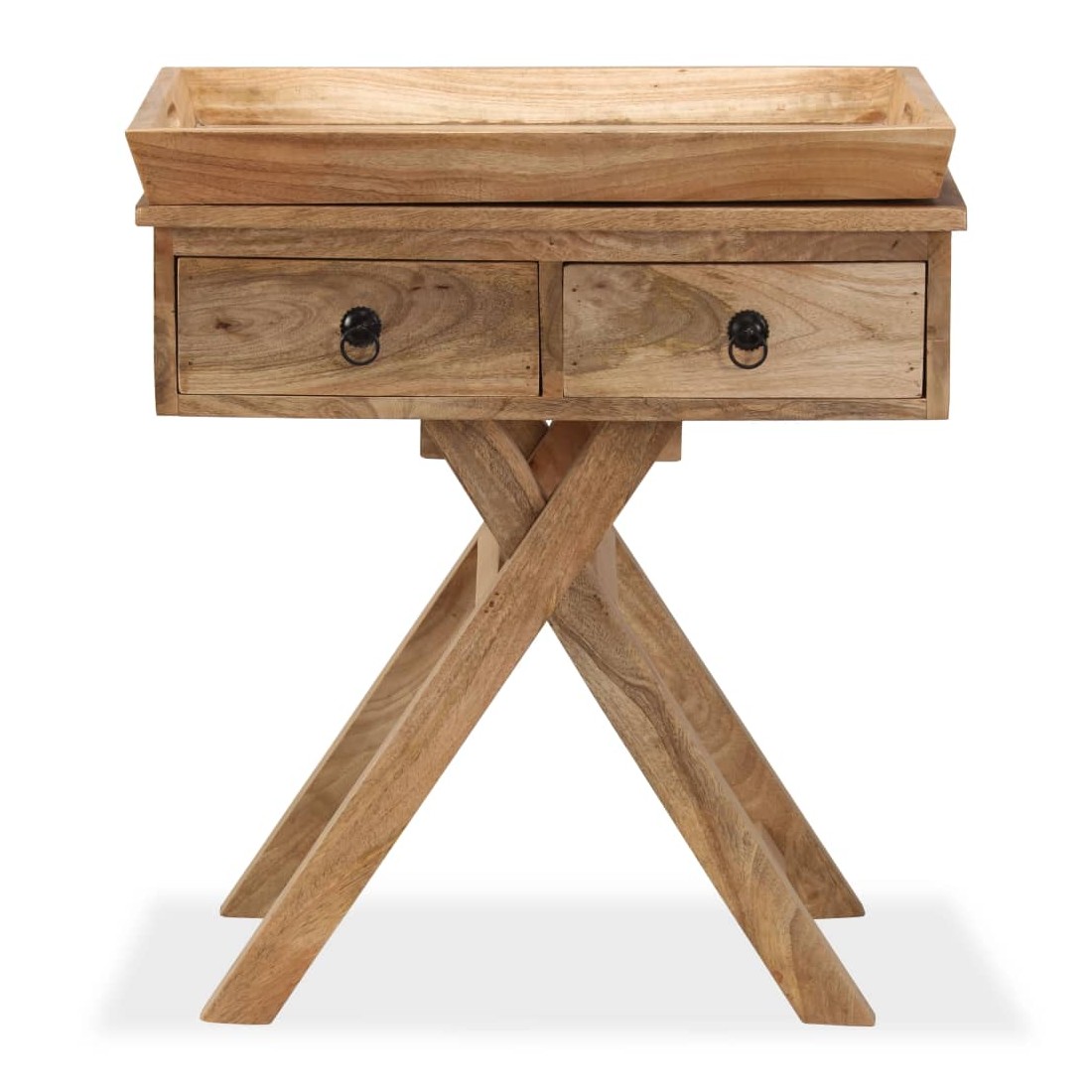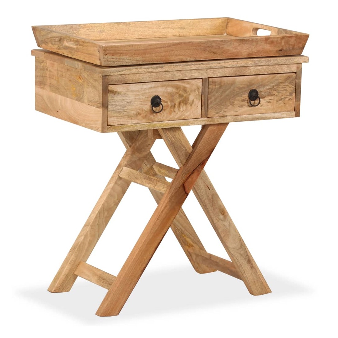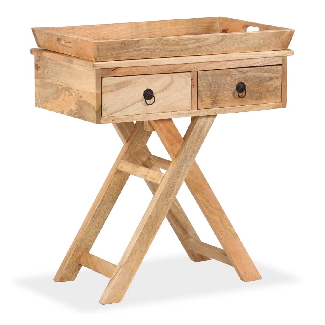 Cette table d'appoint rustique sera un supplément pratique et très décoratif à votre entrée, salon ou salle de séjour. Elle peut également être utilisée comme table console ou table auxiliaire et dispose d'un dessus de table avec un plateau très pratique. La table d'appoint est faite à la main en bois de manguier qui est solide, stable, durable et mangifique, et l'artisanat contribue à son style rétro spectaculaire. Chaque étape du processus est réalisée avec le plus grand soin, que ce soit le polissage, la peinture ou le laquage. Le travail artisanal et les mangifiques grains de bois rendent chaque meuble unique et légèrement différent des autres. Le dessus de table peut également servir de grand plateau de service qui peut être facilement enlevé pour une utilisation séparée en cas de besoin, et offre suffisamment d'espace pour des boissons ou des objets décoratifs comme des paniers de fruits ou des vases. Conçue avec deux tiroirs, la table d'appoint garde vos petits objets bien rangés et à portée de main. Les pieds en forme de X contribuent à sa robustesse ainsi qu'à son superbe style rétro. L'assemblage est facile. Remarque importante : les couleurs et les grains peuvent varier d'une pièce à l'autre, rendant chacune de nos tables consoles unique ; la livraison est aléatoire.
