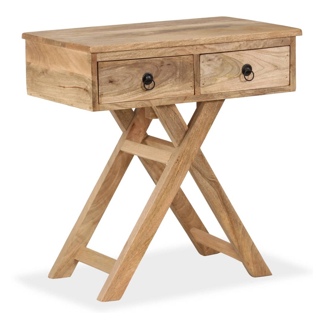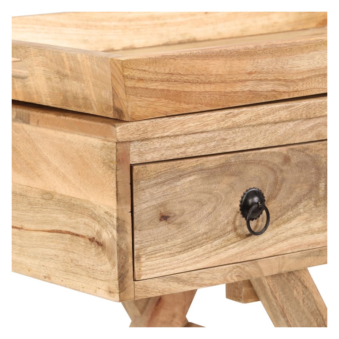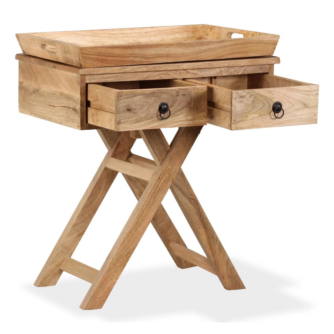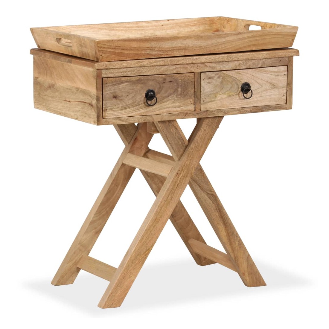 Cette table d'appoint rustique sera un supplément pratique et très décoratif à votre entrée, salon ou salle de séjour. Elle peut également être utilisée comme table console ou table auxiliaire et dispose d'un dessus de table avec un plateau très pratique. La table d'appoint est faite à la main en bois de manguier qui est solide, stable, durable et mangifique, et l'artisanat contribue à son style rétro spectaculaire. Chaque étape du processus est réalisée avec le plus grand soin, que ce soit le polissage, la peinture ou le laquage. Le travail artisanal et les mangifiques grains de bois rendent chaque meuble unique et légèrement différent des autres. Le dessus de table peut également servir de grand plateau de service qui peut être facilement enlevé pour une utilisation séparée en cas de besoin, et offre suffisamment d'espace pour des boissons ou des objets décoratifs comme des paniers de fruits ou des vases. Conçue avec deux tiroirs, la table d'appoint garde vos petits objets bien rangés et à portée de main. Les pieds en forme de X contribuent à sa robustesse ainsi qu'à son superbe style rétro. L'assemblage est facile. Remarque importante : les couleurs et les grains peuvent varier d'une pièce à l'autre, rendant chacune de nos tables consoles unique ; la livraison est aléatoire.