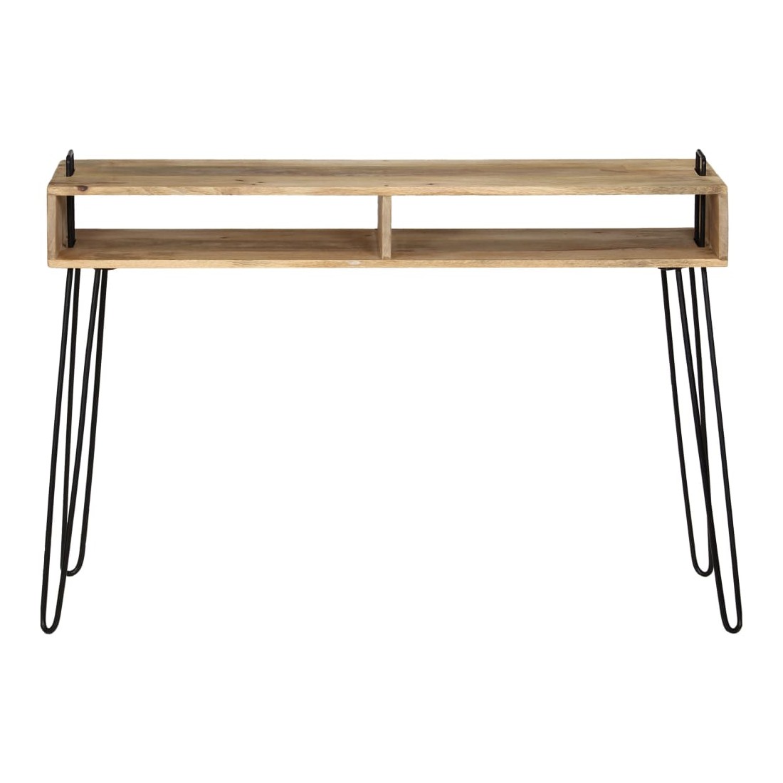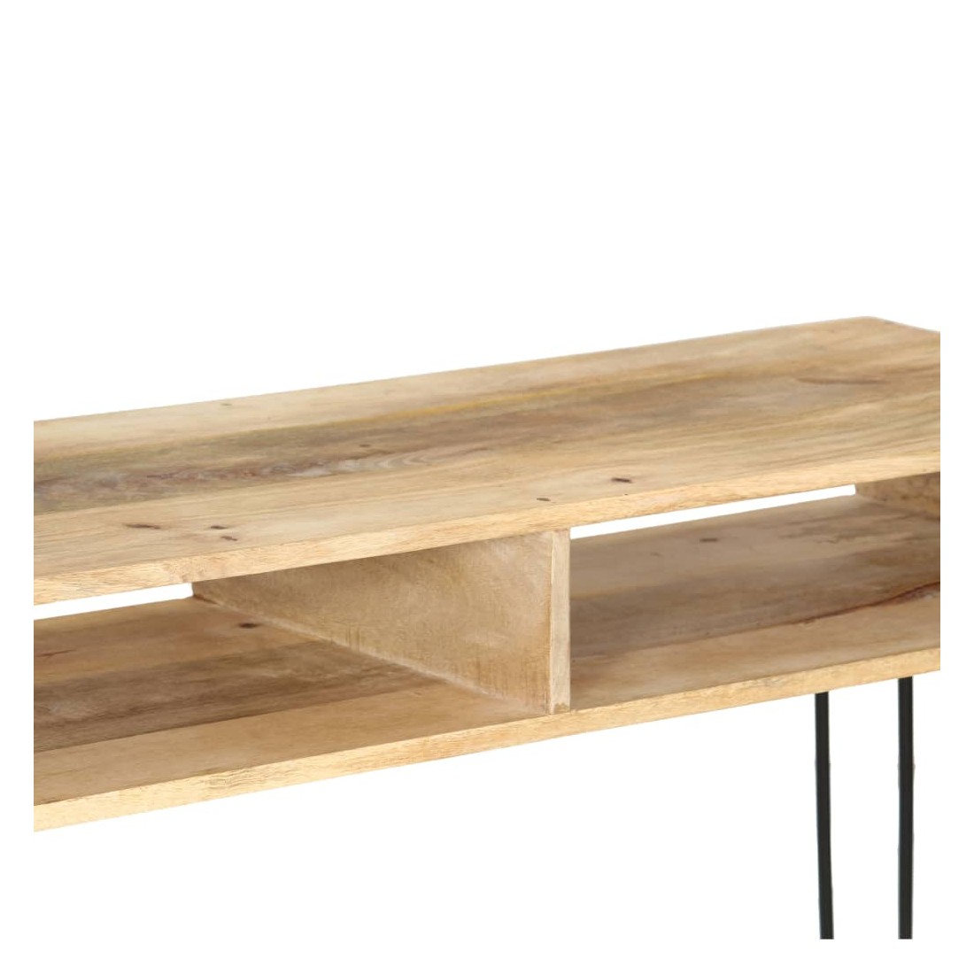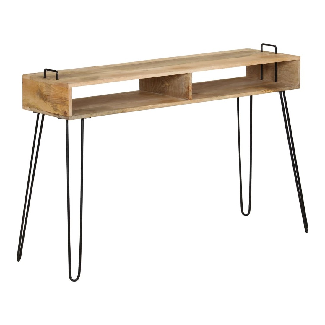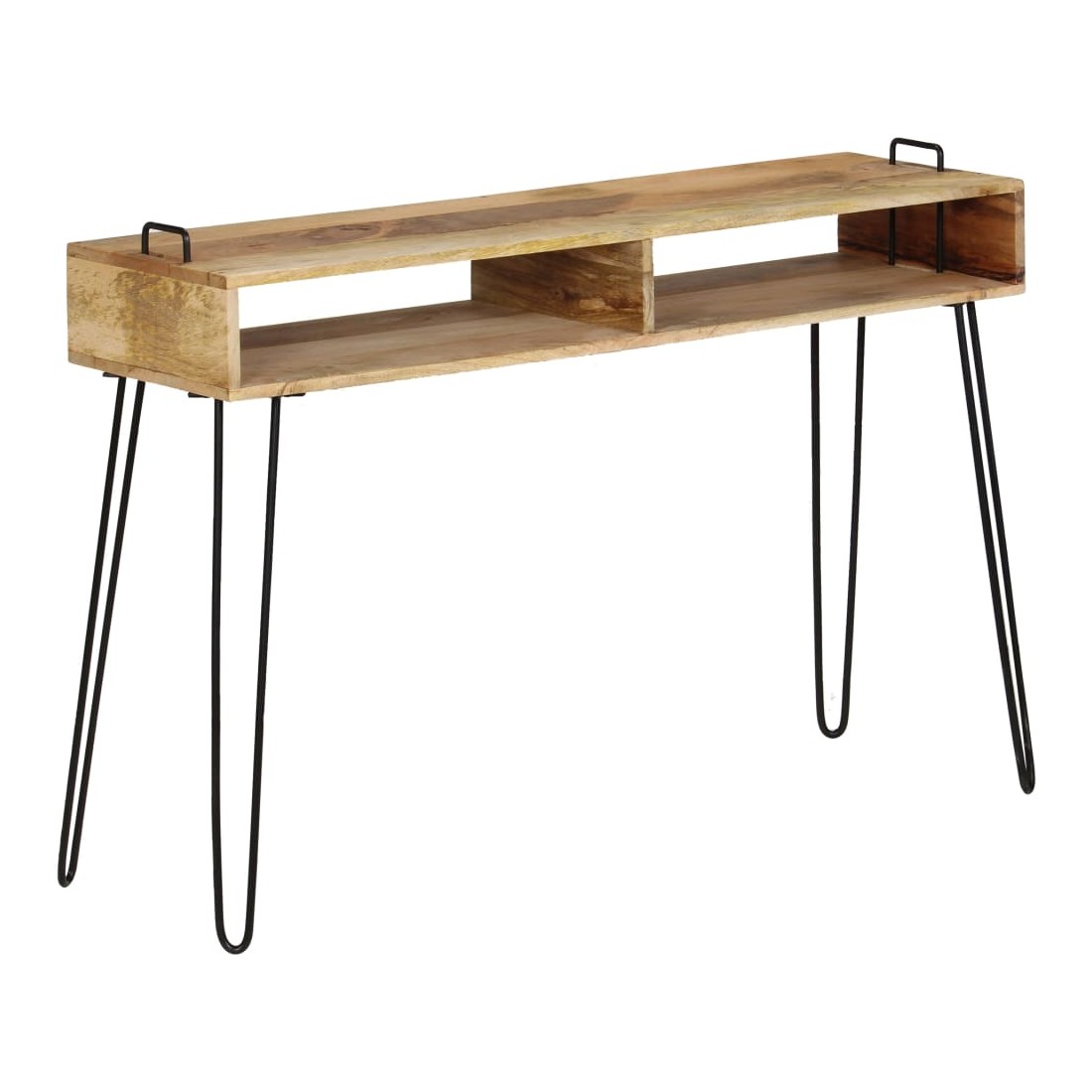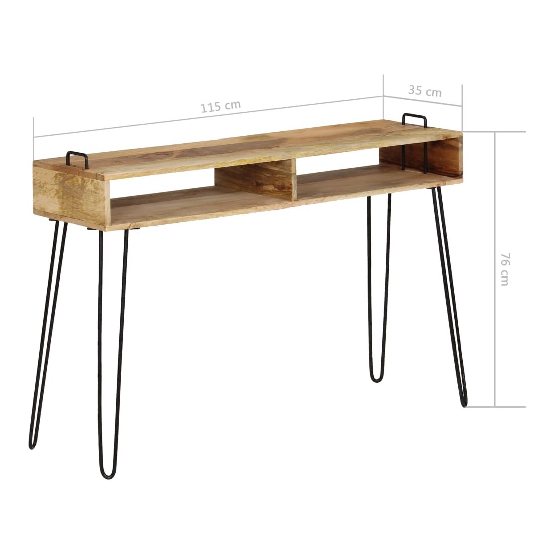 La table console sera un supplément indémodable à la décoration de votre salon. Fabriquée en bois de manguier massif et avec des cadres en acier robustes, la table est extrêmement stable et durable. Le dessus de table est idéal pour placer divers objets décoratifs comme des vases et des plantes en pot. Les étagères offrent un espace de rangement supplémentaire pour garder vos petits objets bien rangés. Les cadres en acier contribuent à la robustesse de la table et à son style industriel. Chaque étape du processus de fabrication est réalisée avec le plus grand soin, que ce soit le polissage ou le laquage. L'assemblage est facile. Remarque importante : les couleurs et les grains de bois peuvent varier d'une pièce à l'autre, ce qui rend chaque pièce unique et légèrement différente l'une de l'autre ; la livraison est aléatoire.