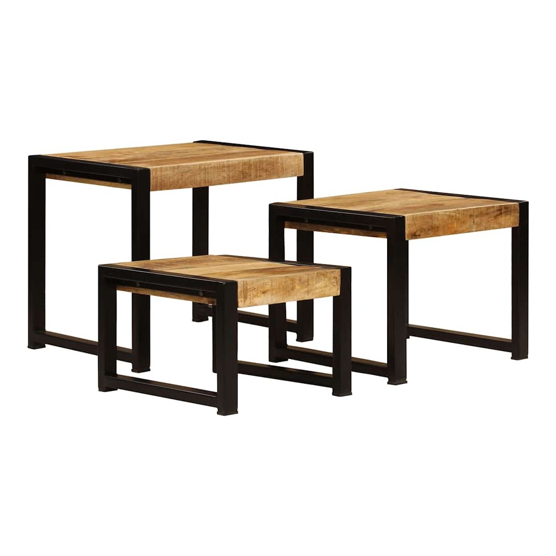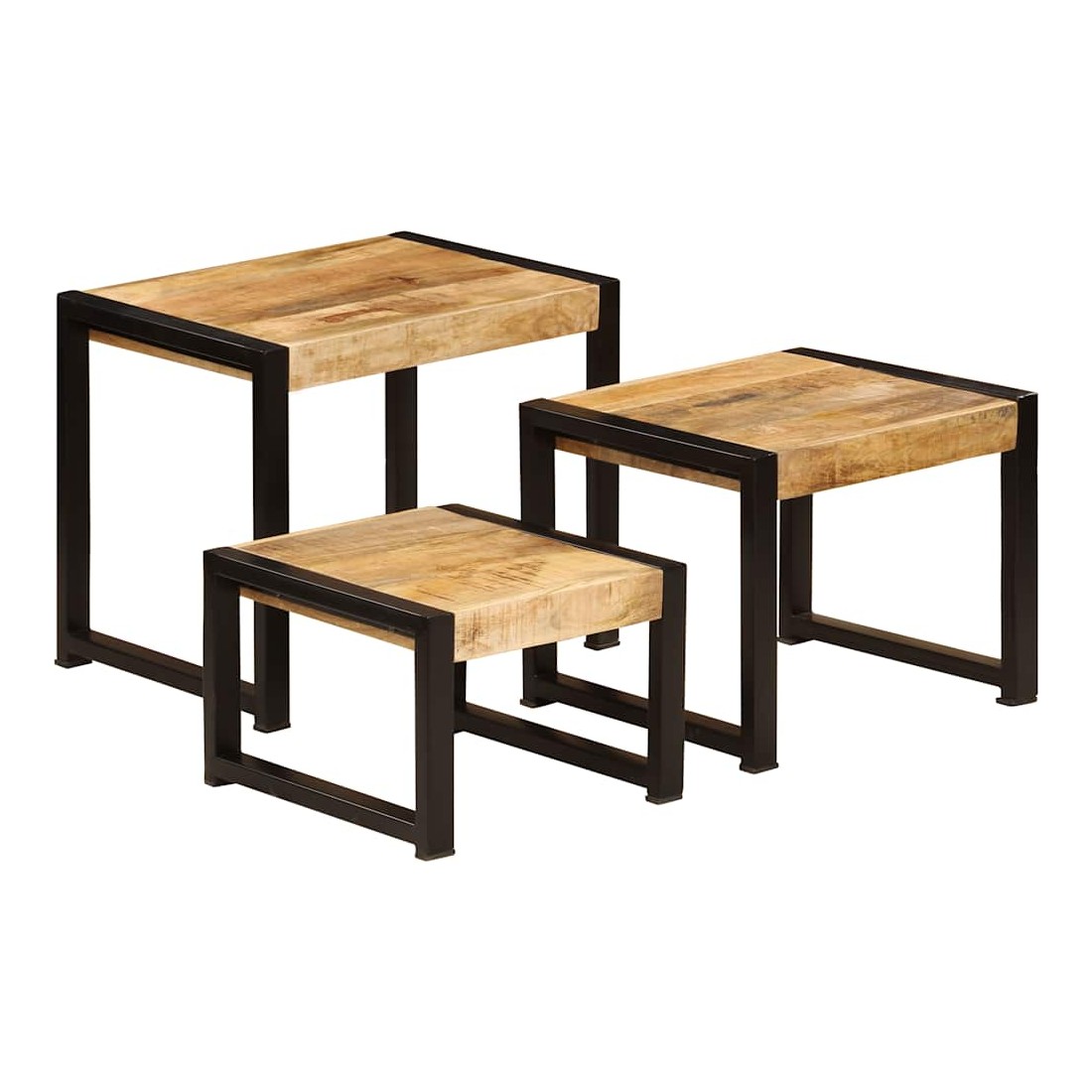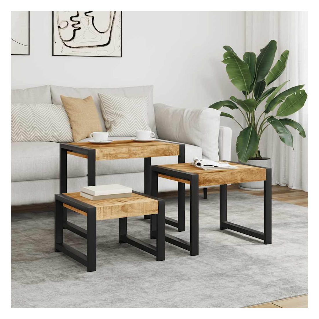 Ces tables en bois de manguier sont à la fois élégantes et pratiques et constitueront un élément central de votre pièce. Cet ensemble de 3 tables gigognes de style vintage est fait de bois de manguier solide, ce qui lui confère une grande stabilité et durabilité. Le bois de manguier est un bois dur dense et robuste qui présente des belles stries et des contours bruns ou dorés à la surface. Grâce au cadre en acier renforcé, les tables sont très stables et durables. Étant empilables, ces tables permettent d'économiser beaucoup d'espace lorsqu'elles ne sont pas utilisées. Le savoir-faire ajoute à ces tables un style rétro spectaculaire. Chaque étape du processus est réalisée avec le plus grand soin, que ce soit le polissage, la peinture ou le laquage. Remarque importante : les couleurs varient d'une pièce à l'autre, rendant chacune de nos tables unique ; la livraison est aléatoire.