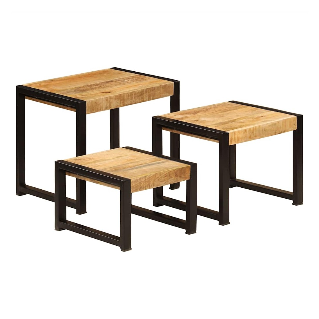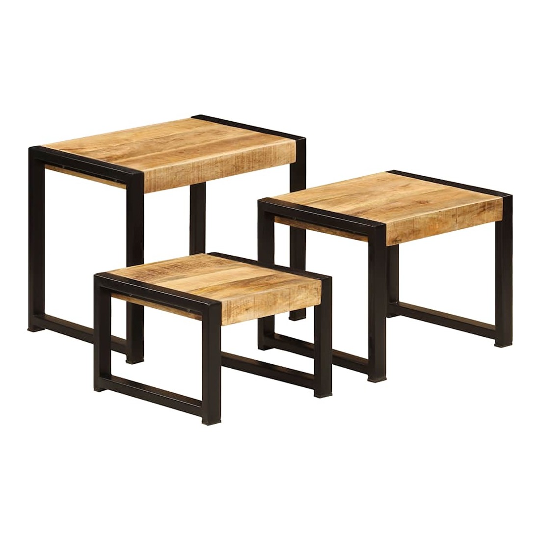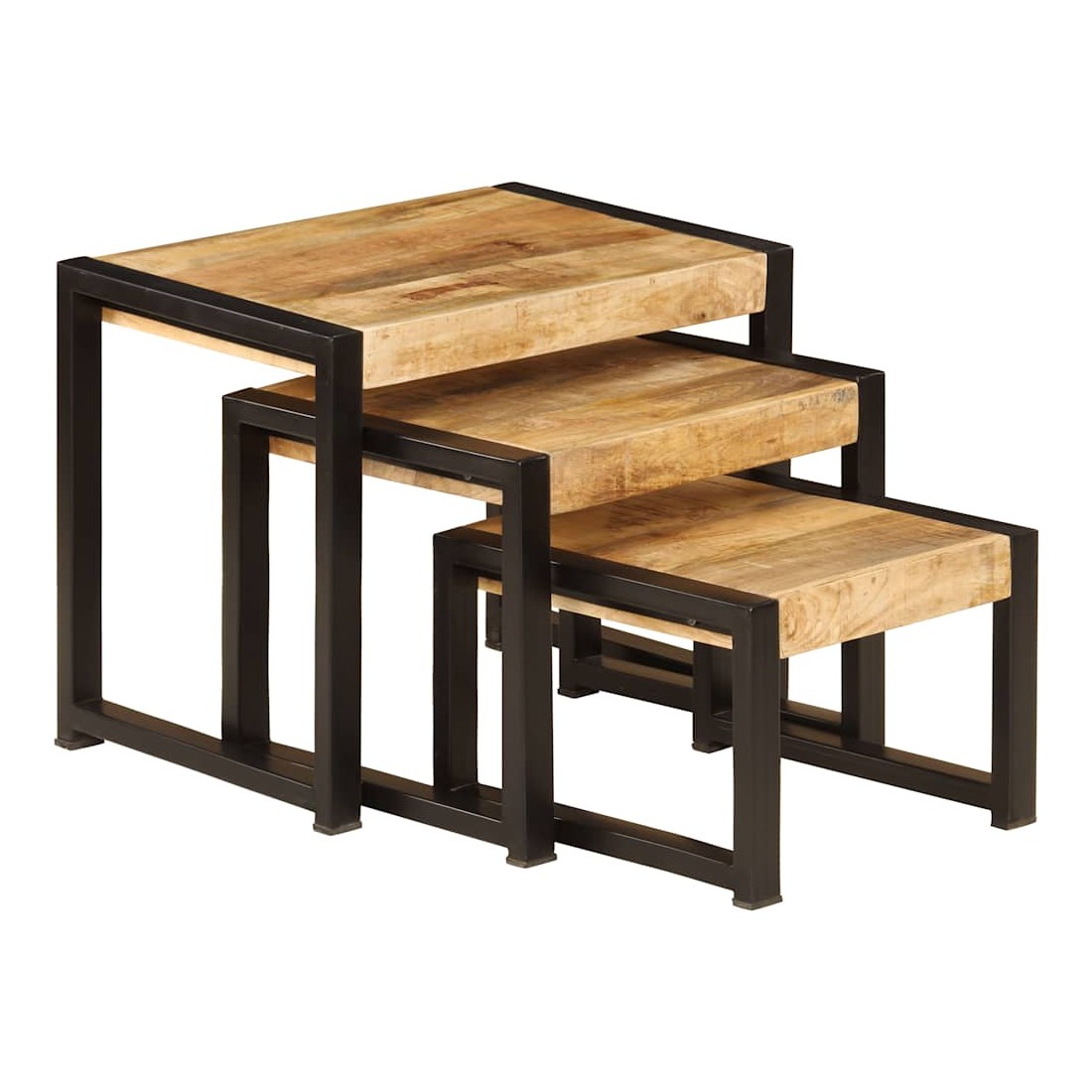 Ces tables en bois de manguier sont à la fois élégantes et pratiques et constitueront un élément central de votre pièce. Cet ensemble de 3 tables gigognes de style vintage est fait de bois de manguier solide, ce qui lui confère une grande stabilité et durabilité. Le bois de manguier est un bois dur dense et robuste qui présente des belles stries et des contours bruns ou dorés à la surface. Grâce au cadre en acier renforcé, les tables sont très stables et durables. Étant empilables, ces tables permettent d'économiser beaucoup d'espace lorsqu'elles ne sont pas utilisées. Le savoir-faire ajoute à ces tables un style rétro spectaculaire. Chaque étape du processus est réalisée avec le plus grand soin, que ce soit le polissage, la peinture ou le laquage. Remarque importante : les couleurs varient d'une pièce à l'autre, rendant chacune de nos tables unique ; la livraison est aléatoire.