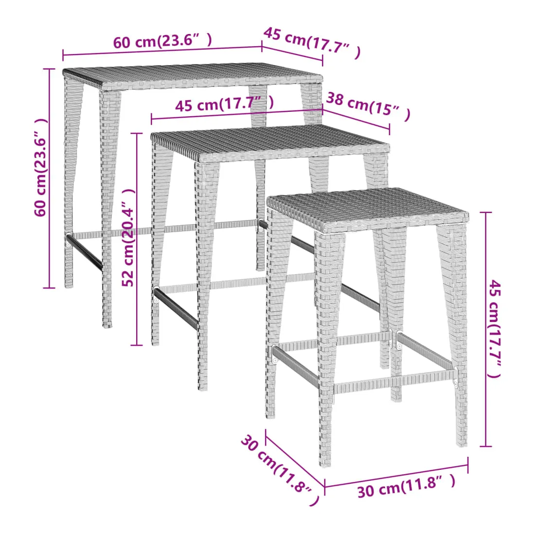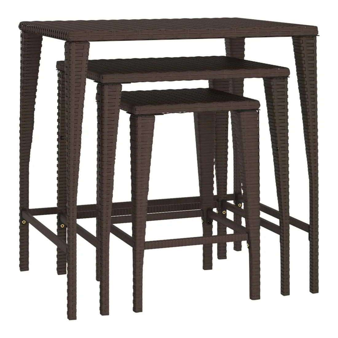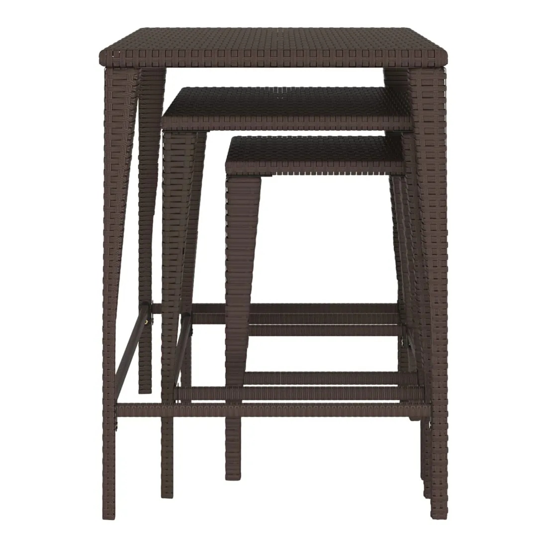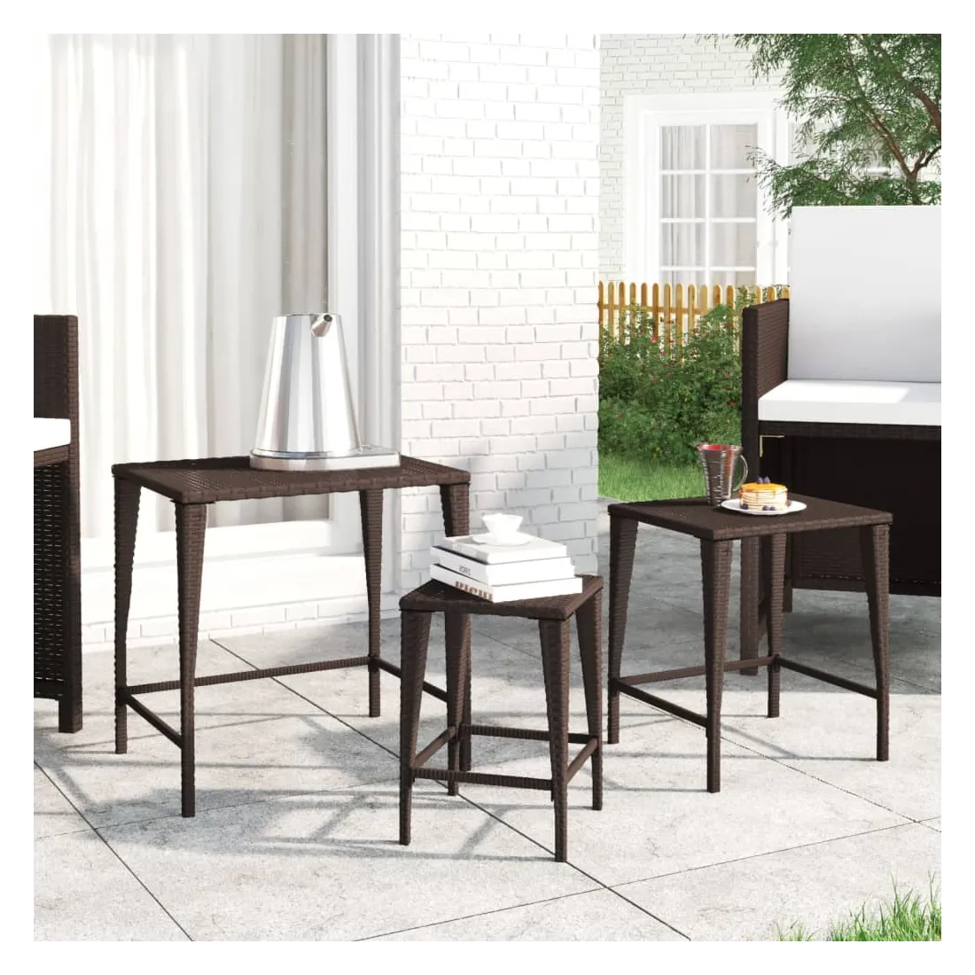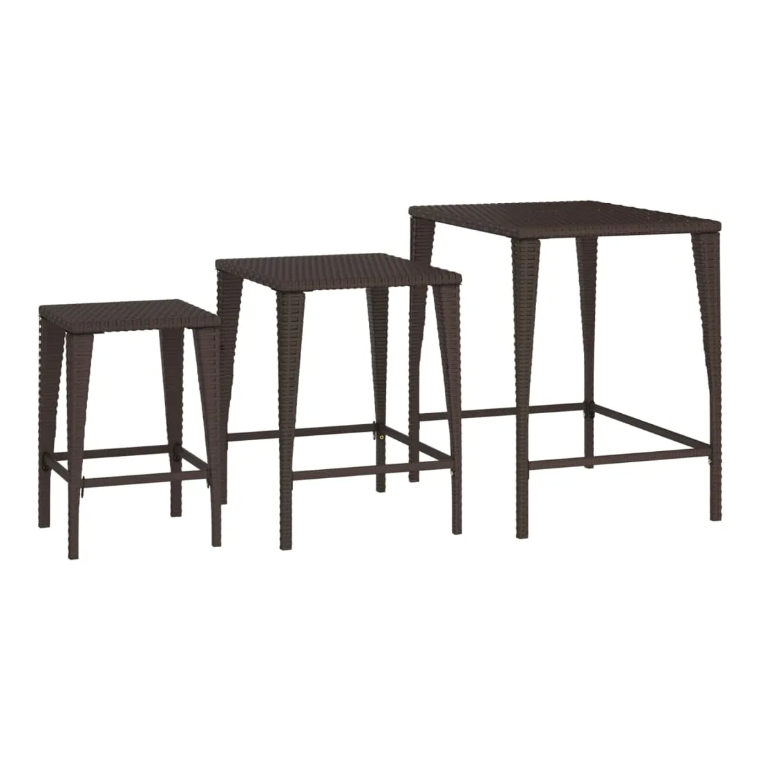 Ces tables gigognes de différentes tailles sont simples mais fonctionnelles, ce qui en fait un point central dans n'importe quel espace. Matériau durable : la résine tressée, également connue sous le nom de rotin poly, résiste aux intempéries et est facile à nettoyer. Elle reste belle à l'extérieur pendant une longue période. Elle est plus économique que d'autres matériaux, tout en offrant une excellente qualité, une commodité et un aspect esthétique.Cadre robuste : les cadres en acier enduit de poudre de ces tables basses gigognes offrent robustesse et stabilité.Design d'imbrication : grâce à la différence de taille, ces tables d'appoint gigognes peuvent non seulement répondre à vos multiples besoins, mais offrent également un espace supplémentaire et un rangement facile lorsque les plus petites tables sont cachées sous la plus grande.Dessus de table stable : le dessus de table robuste de l'ensemble de tables gigognes est idéal pour reposer vos boissons ou tout autre nécessaire dont vous avez besoin à portée de main. Bon à savoir :Pour faciliter au maximum le montage, chaque produit est livré avec des instructions. Remarque : Pour que vos meubles d'extérieur restent beaux, nous vous recommandons de les protéger avec une housse imperméable.