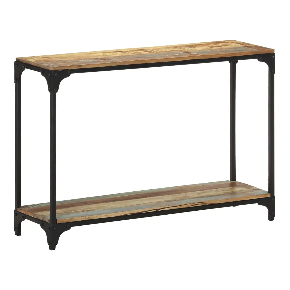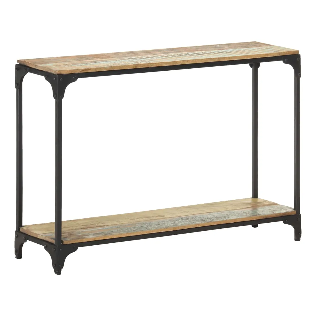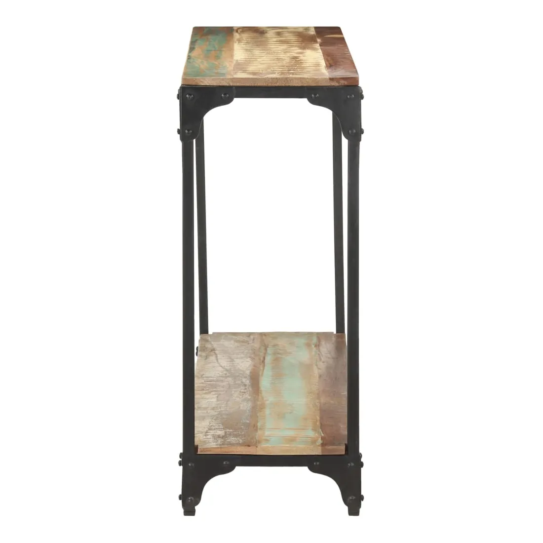 vidaXLCette table console en bois sera un complément pratique à votre salon, couloir, etc. Vous pouvez également la placer sous un miroir. Cette table de couloir est fabriquée en bois de récupération provenant de solives, de planchers et de poutres de soutènement de vieux bâtiments démolis et peut comprendre de différents types de bois comme le pin, le teck, le hêtre, le chêne, le cèdre, le bois de manguier, l'acacia, etc. Cela signifie que le bois de récupération conserve les caractéristiques de ces différents types de bois. Le bois de récupération est déjà vieilli, corrodé et séché, donc il ne rétrécit ni se plie. Cette table en bois est entièrement faite à la main et les beaux grains de bois rendent chaque meuble unique et légèrement différent l'un de l'autre. Avec son cadre en acier enduit de poudre noire, la table est stable et robuste. Le dessus robuste vous offre suffisamment d’espace pour mettre vos paniers de fruits, cadres photo ou autres objets décoratifs. L’étagère inférieure est idéale pour placer des magazines, des livres et d’autres petits essentiels bien organisés et à portée de main. Remarque importante : les couleurs varient d'une pièce à l'autre, rendant chaque pièce unique. La livraison est aléatoire.