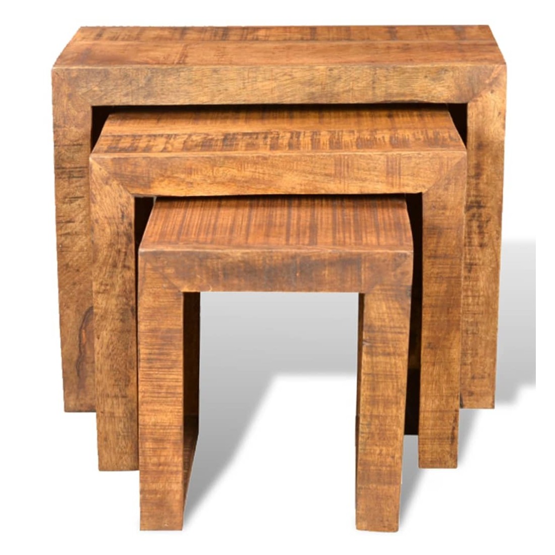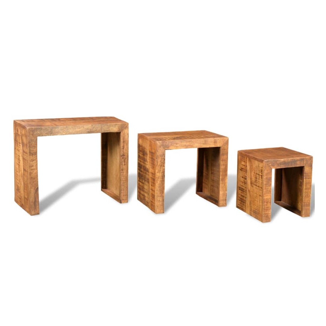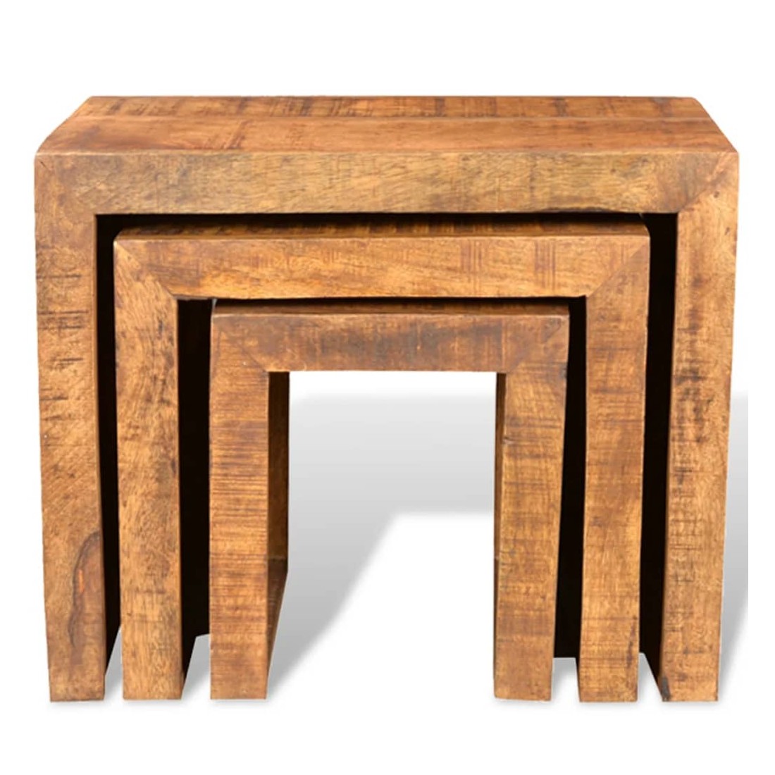 Cet ensemble de 3 tables gigognes de style antique est un accessoire intemporel pour votre maison. Elles peuvent être utilisées comme tables d'appoint, tables basses, supports de lampes / de plantes, etc. En outre, elles peuvent servir de tables de chevet uniques dans votre chambre à coucher. Étant empilables, ces tables économisent beaucoup d'espace lorsqu'elles ne sont pas utilisées.Cet ensemble de 3 tables gigognes est fait de bois de manguier de haute qualité, ce qui signifie que chaque meuble est solide, stable et durable. Les grains de bois à face claire les rendent uniques et légèrement différentes l'une de l'autre.En outre, chaque processus de coupe, de polissage et de peinture est minutieusement préparé.
