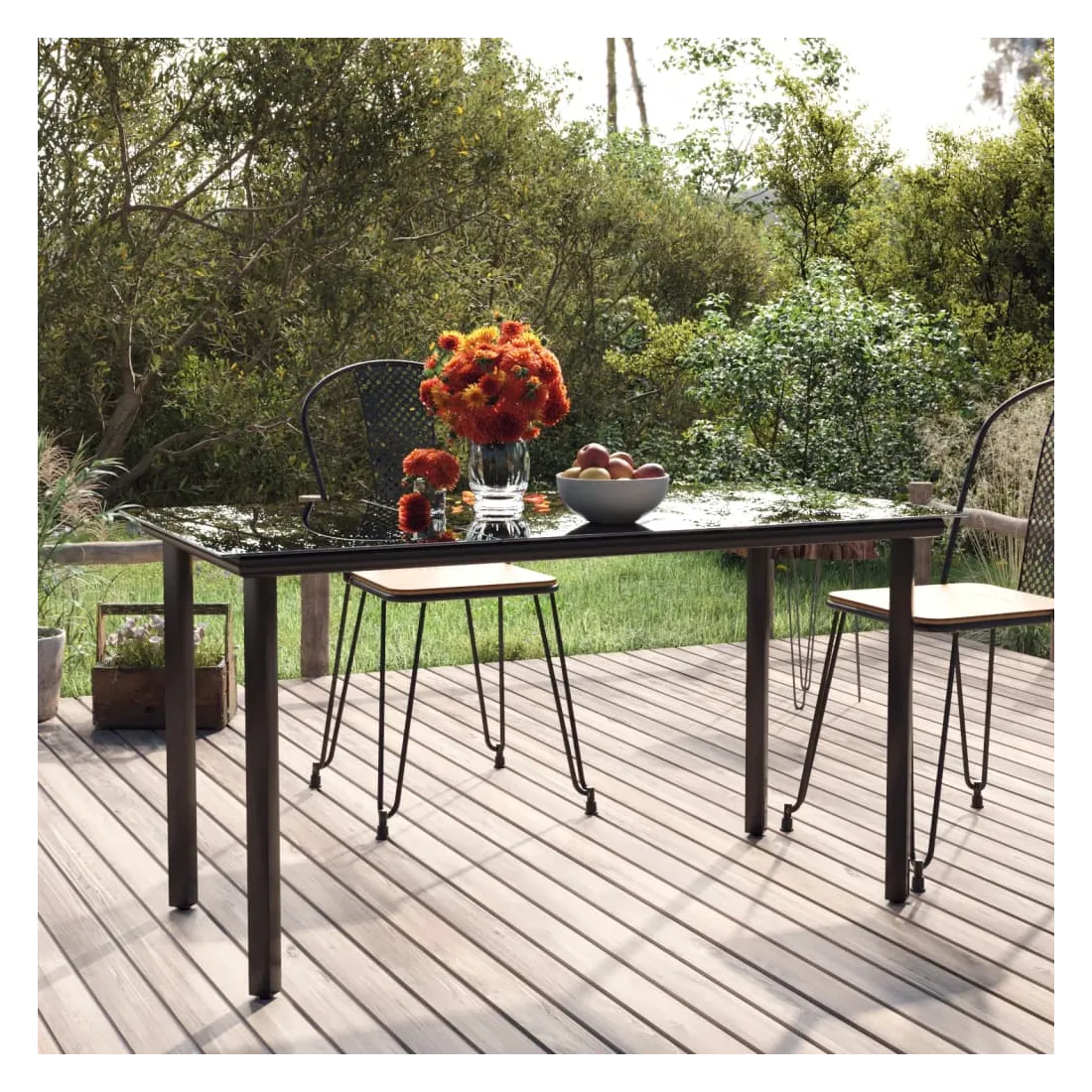 Renouvelez votre coin repas avec cette table à manger de jardin ! Elle ajoute à la fois un charme élégant et contemporain à votre espace de vie extérieur. Cadre robuste : cette table de repas est construite avec un cadre en acier enduit de poudre, qui assure la robustesse et la stabilité.Dessus de table pratique : le dessus lisse de la table est en verre trempé, facile à nettoyer avec un chiffon humide. De plus, le dessus robuste est parfait pour placer des repas, des boissons et d'autres objets décoratifs.Pieds en tube carré : cette table de jardin est équipée de pieds en acier enduit de poudre, ce qui la rend très stable et durable. Remarque :Afin de prolonger la durée de vie de votre mobilier d'extérieur, nous vous recommandons de le protéger avec une housse imperméable.Chaque produit est livré avec un manuel de montage dans la boîte pour un montage facile.