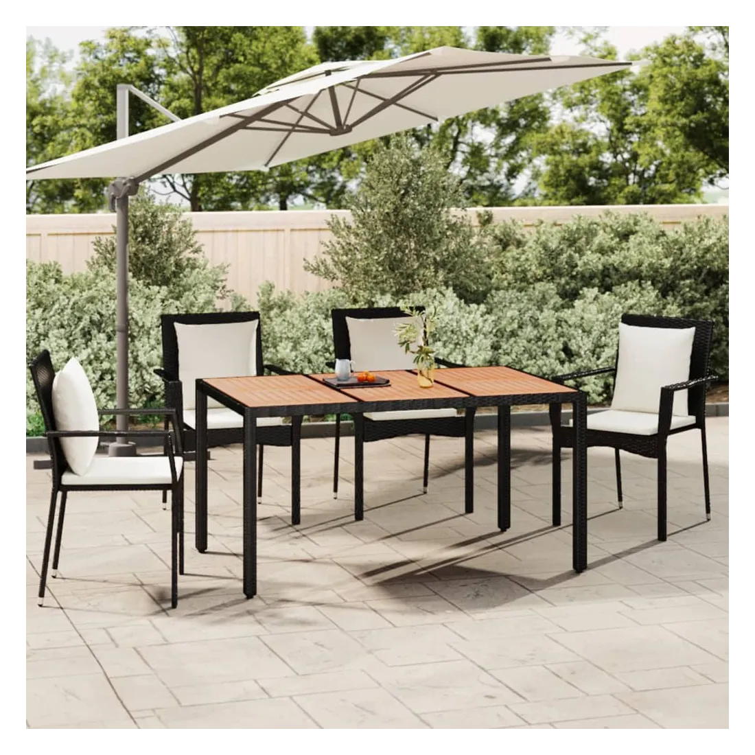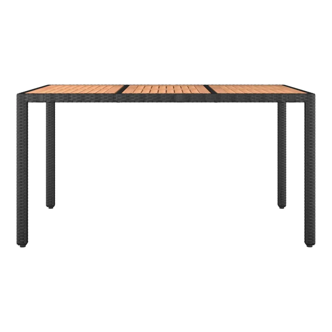 Cette table de jardin avec dessus en bois, conçue avec des lignes épurées et simples, est un excellent choix pour votre jardin, terrasse et tout autre espace extérieur. Matériau durable : la résine tressée, également connue sous le nom de rotin poly, résiste aux intempéries et est facile à nettoyer. Elle reste belle à l'extérieur pendant une longue période. Elle est plus économique que d'autres matériaux, tout en offrant une excellente qualité, une commodité et un aspect esthétique.Cadre stable : l'acier est un matériau exceptionnellement dur et résistant. Il offre robustesse et stabilité.Dessus de table en bois : le dessus de table en bois d'acacia massif est parfait pour placer des boissons, de la nourriture et des décorations. Il est beau en apparence et facile à nettoyer.Design résistant à l'eau : fabriqué en matériau résistant à l'eau, ce produit peut résister à l'humidité et au temps pluvieux. Il peut également être facilement nettoyé avec un chiffon humide en cas de besoin. Bon à savoir :Pour faciliter au maximum le montage, chaque produit est livré avec des instructions. Remarque :Pour que vos meubles d'extérieur restent beaux, nous vous recommandons de les protéger avec une housse imperméable.