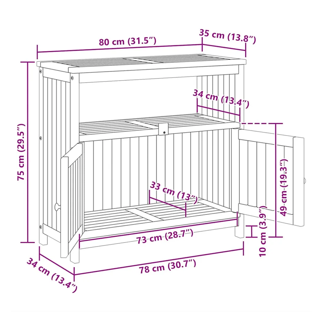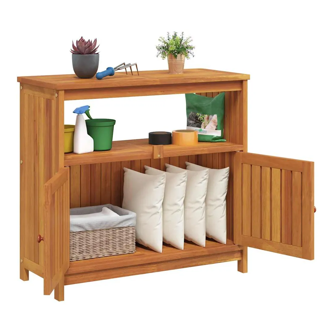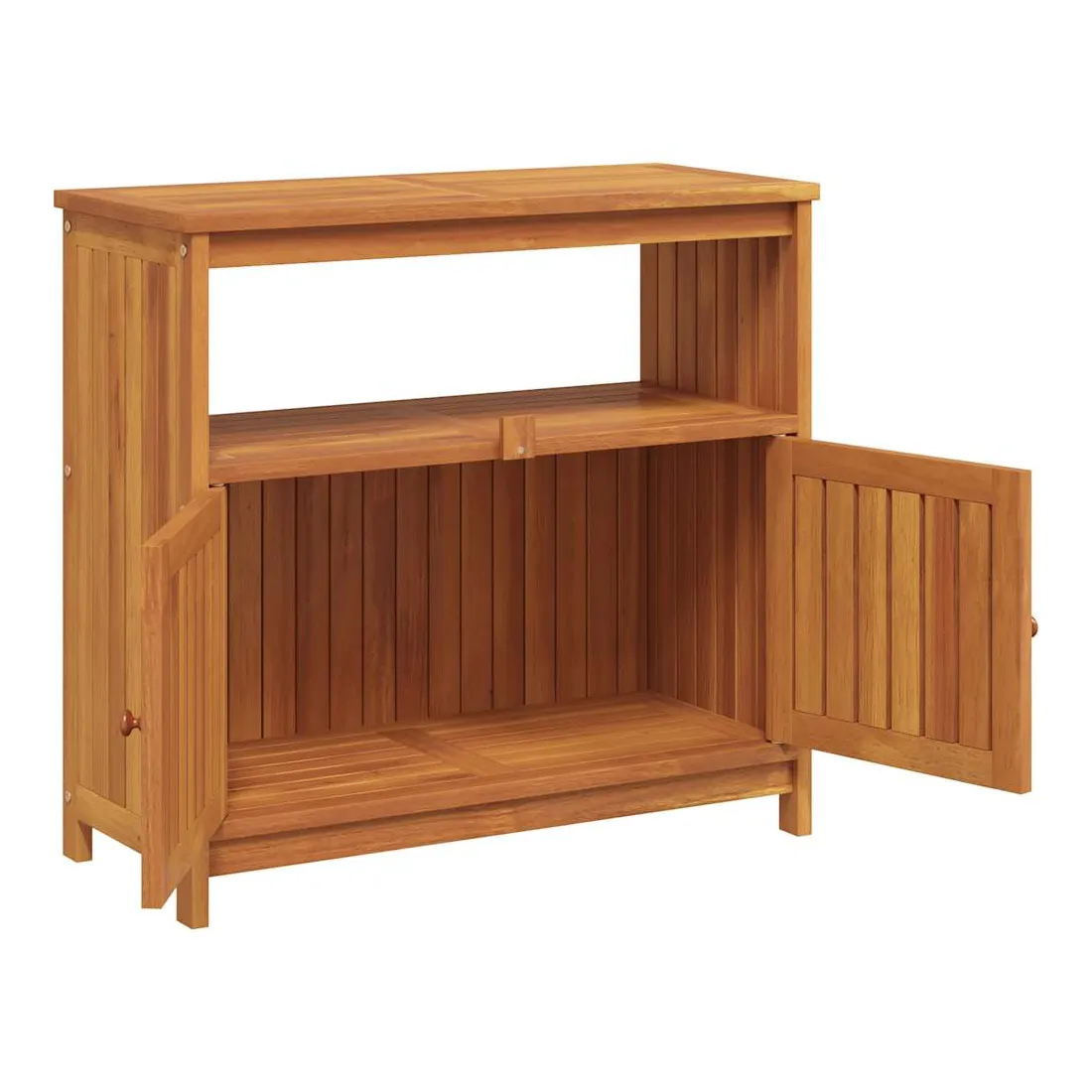 Cette table console de jardin en bois est conçue pour ajouter un style rustique unique à votre espace intérieur et extérieur. Matériau durable : le bois d'acacia massif est un matériau naturel magnifique. Le bois d'acacia un bois dur tropical, qui est dense, robuste et durable.Cadre stable : le cadre en bois de la table console assure robustesse et stabilité.Grand espace de rangement : la table d'extérieur est dotée d'une étagère et d'un compartiment avec des portes, offrant un grand espace de rangement pour garder vos différents articles essentiels quotidiens bien organisés et facilement accessibles.Portes pratiques : protégez vos objets essentiels de la poussière en les cachant derrière les portes de la table de jardin. Attention :Pour éviter qu'il ne soit renversé, ce produit doit être utilisé avec le dispositif de fixation au mur fourni. Bon à savoir :Pour que vos meubles d'extérieur restent beaux, nous vous recommandons de les protéger avec une housse imperméable.
