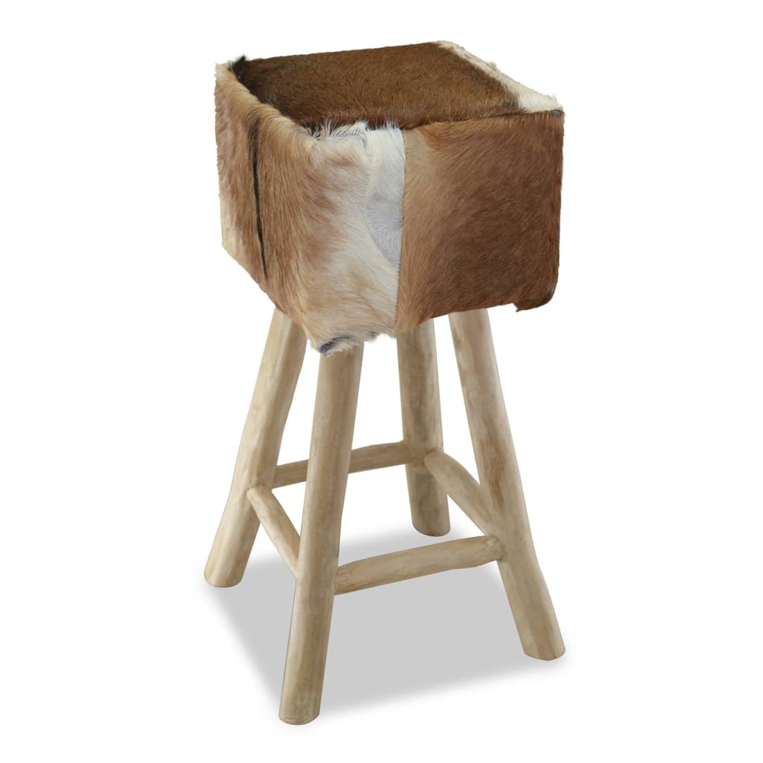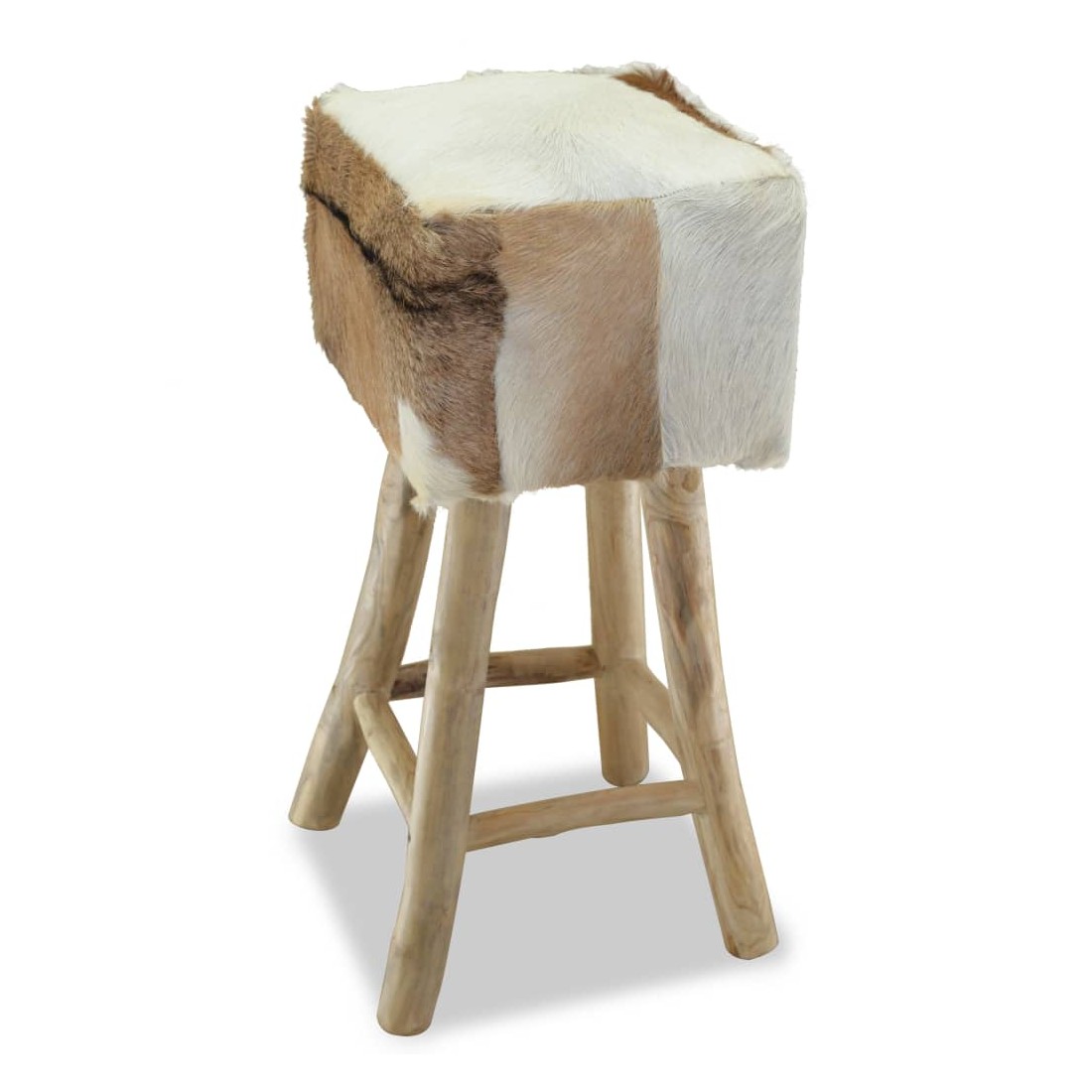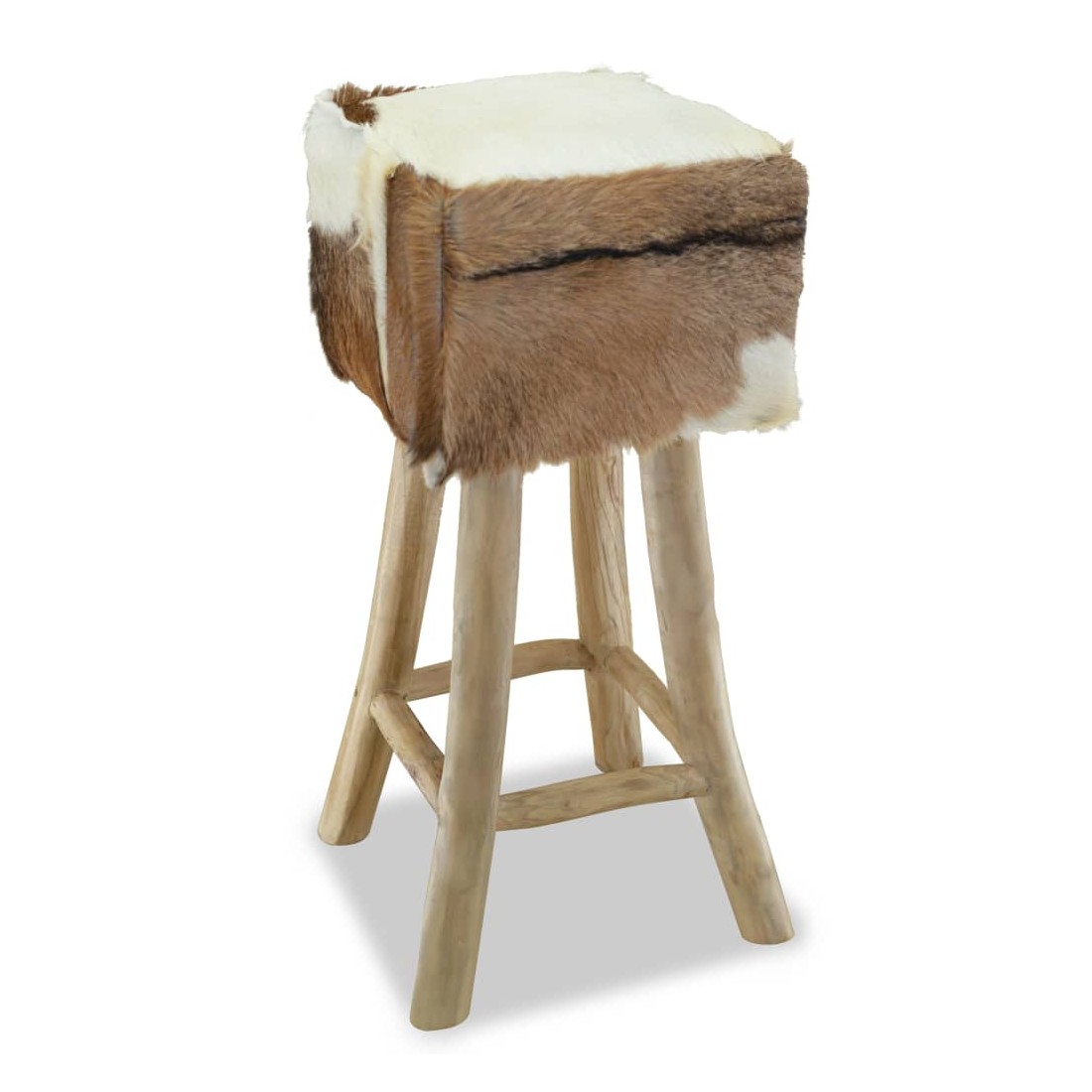 Ce tabouret de bar en cuir de chèvre véritable a un design unique et saisissant et ajoutera une touche de charme rustique aux restaurants ou aux bars, mais aussi à votre salon ou salle à manger à la maison. Le tabouret de bar a un cadre solide en teck, le rendant stable et très durable. Le siège est recouvert de cuir de chèvre 100 % véritable, résistant, durable et flexible, avec le motif de cuir de chèvre. Le cuir de chèvre poilu est doux au toucher et confortable. Le beau motif en cuir naturel rend chacune de nos chaises de bar unique et légèrement différente de la suivante. Grâce au rembourrage doux dans le siège, vous apprécierez le plus grand confort d'assise. Les pieds dans une couleur de bois naturel s'ajoutent à l'aspect rustique du tabouret. Remarque : Les couleurs et les motifs varient d'une pièce à l'autre. La livraison est aléatoire.