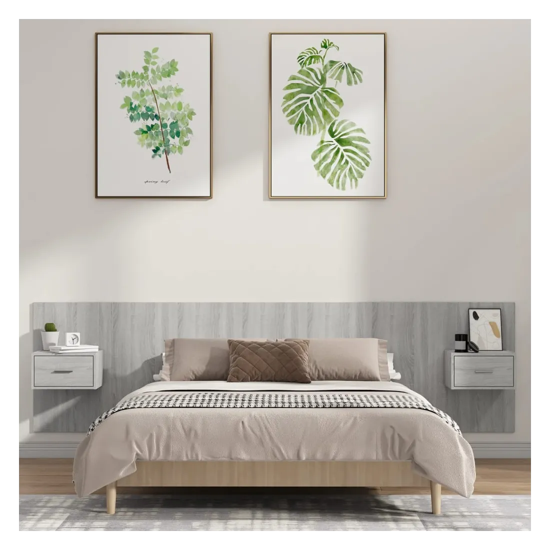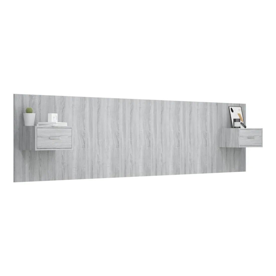 La tête de lit robuste avec armoires, au design classique, donne à votre cadre de lit un aspect complet et convient à toute chambre à coucher. Matériau robuste : le bois d'ingénierie est d'une qualité exceptionnelle avec une surface lisse et présente également résistance, stabilité et résistance à l'humidité.Design mural : les tables de chevet flottantes et la tête de lit peuvent être fixées au mur. De cette façon, vous pouvez maximiser votre espace au sol et garder la zone propre.Espace de rangement : l'unité de chevet dispose d'un espace de rangement spacieux qui vous permet de garder vos affaires organisées. ATTENTION :Les vis et les chevilles pour l'intérieur du mur ne sont pas incluses. Recherchez et utilisez des vis et des chevilles adaptées à vos murs. Si vous n'êtes pas sûr, demandez conseil à un professionnel. Lisez et suivez attentivement chaque étape des instructions.