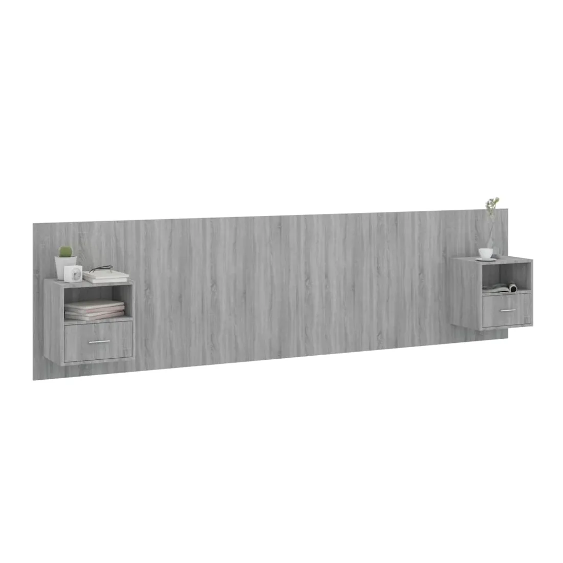 La tête de lit robuste avec armoires, au design classique, donne à votre cadre de lit un aspect complet et convient à toute chambre à coucher. Matériau robuste : le bois d'ingénierie est d'une qualité exceptionnelle avec une surface lisse et présente également résistance, stabilité et résistance à l'humidité.Design mural : les tables de chevet flottantes et la tête de lit peuvent être fixées au mur. De cette façon, vous pouvez maximiser votre espace au sol et garder la zone propre.Espace de rangement : l'unité de chevet dispose d'un espace de rangement spacieux qui vous permet de garder vos affaires organisées. ATTENTION :Les vis et les chevilles pour l'intérieur du mur ne sont pas incluses. Recherchez et utilisez des vis et des chevilles adaptées à vos murs. Si vous n'êtes pas sûr, demandez conseil à un professionnel. Lisez et suivez attentivement chaque étape des instructions.
