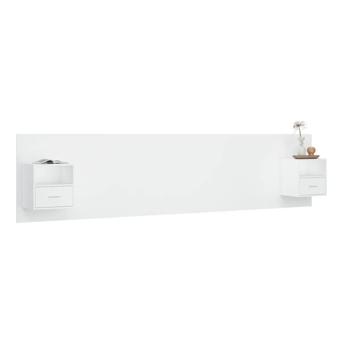 La tête de lit robuste avec armoires, au design classique, donne à votre cadre de lit un aspect complet et convient à toute chambre à coucher. Matériau robuste : le bois d'ingénierie est d'une qualité exceptionnelle avec une surface lisse et présente également résistance, stabilité et résistance à l'humidité.Design mural : les tables de chevet flottantes et la tête de lit peuvent être fixées au mur. De cette façon, vous pouvez maximiser votre espace au sol et garder la zone propre.Espace de rangement : l'unité de chevet dispose d'un espace de rangement spacieux qui vous permet de garder vos affaires organisées. ATTENTION :Les vis et les chevilles pour l'intérieur du mur ne sont pas incluses. Recherchez et utilisez des vis et des chevilles adaptées à vos murs. Si vous n'êtes pas sûr, demandez conseil à un professionnel. Lisez et suivez attentivement chaque étape des instructions.