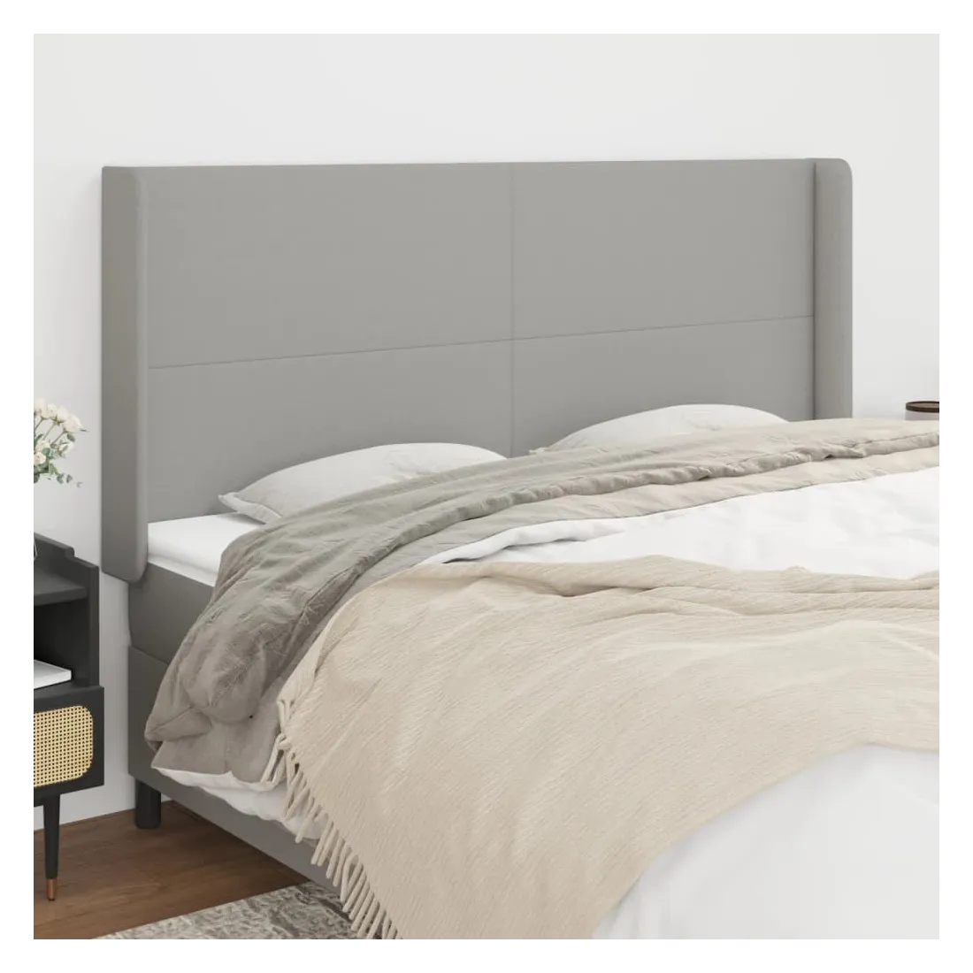 Cette tête de lit avec oreilles classique au design élégant donne à votre cadre de lit un aspect complet et convient à toute chambre à coucher. Tissu durable : le tissu présente un aspect simple et épuré, et il est respirant et durable.Pieds robustes et stables : les pieds en bois assurent la robustesse et la stabilité.Hauteur réglable : la tête de lit est réglable en hauteur selon vos préférences.Excellent soutien : la tête de lit vous offre un excellent soutien du dos lorsque vous êtes assis dans votre lit pour lire ou regarder la télévision. Remarque :La livraison comprend uniquement la tête de lit. Le cadre de lit et le matelas ne sont pas inclus. Vous pouvez consulter notre boutique pour les cadres et matelas assortis.Chaque produit est livré avec un manuel de montage dans la boîte pour un montage facile.