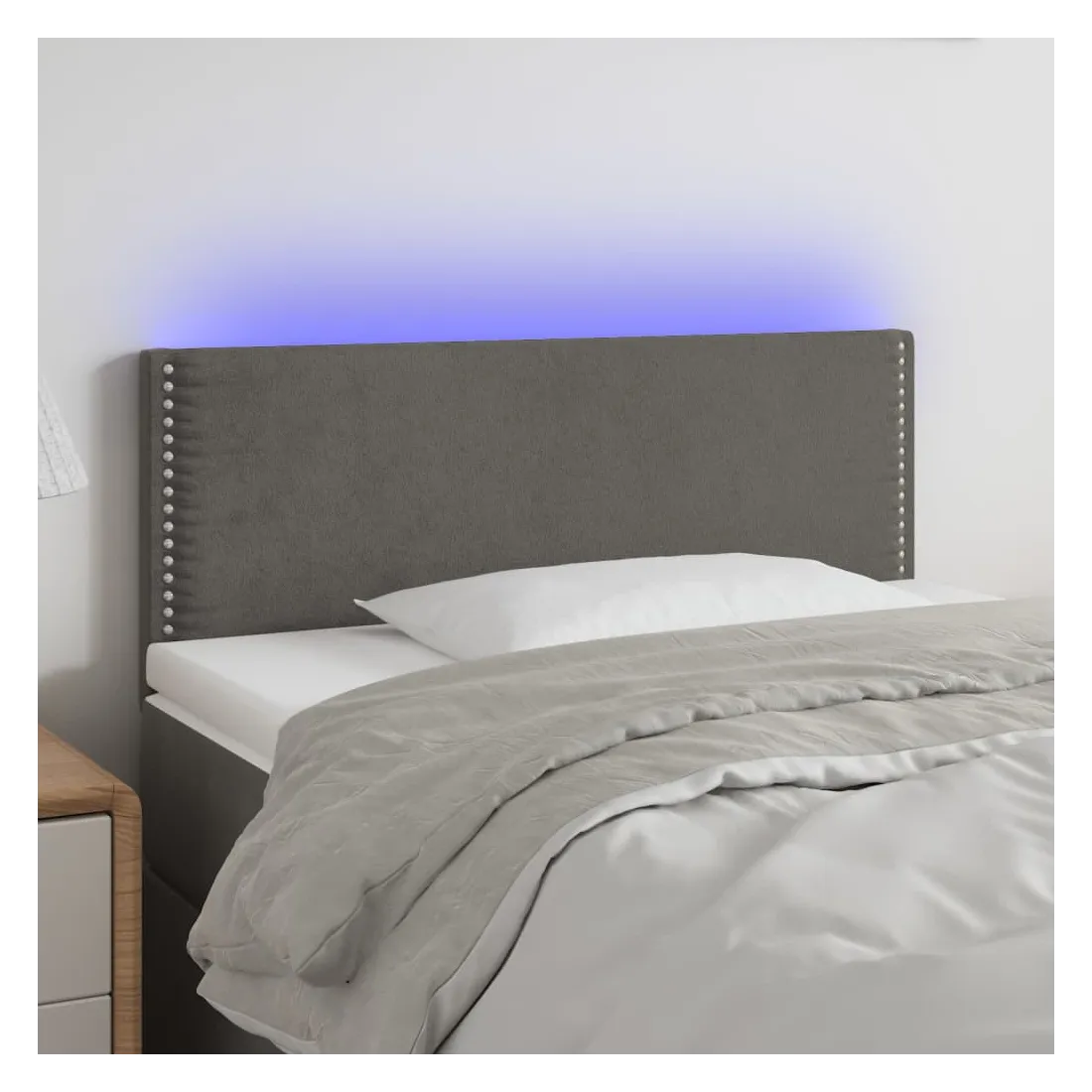 Cette tête de lit à LED classique, au design élégant, donne à votre cadre de lit une touche de modernité étonnante et convient parfaitement à toute chambre à coucher. Velours doux : le velours est un tissu doux et luxueux qui se reconnaît à son tas dense de fibres uniformément coupées qui ont une touche lisse. Le tissu en velours présente un toucher doux distinctif, ce qui le rend confortable au toucher.LED colorée : apportez de l'éclairage dans l'obscurité avec des lumières LED colorées !Hauteur réglable : la tête de lit est réglable en hauteur selon vos préférences.Excellent soutien : la tête de lit vous offre un excellent soutien du dos lorsque vous êtes assis dans votre lit pour lire ou regarder la télévision.Bande à LED découpable : cette bande à LED flexible peut être ajustée en longueur. Le symbole des ciseaux indique où la bande peut être coupée en toute sécurité sans l'endommager. Remarque :Seule la partie avec un symbole de ciseaux peut être coupée et seule la partie avec l'USB continuera à fonctionner comme avant.Chaque produit est livré avec un manuel de montage dans la boîte pour un montage facile.Ce produit est doté d'un connecteur USB, mais la source d'alimentation certifiée de USB 5V n'est pas incluse.