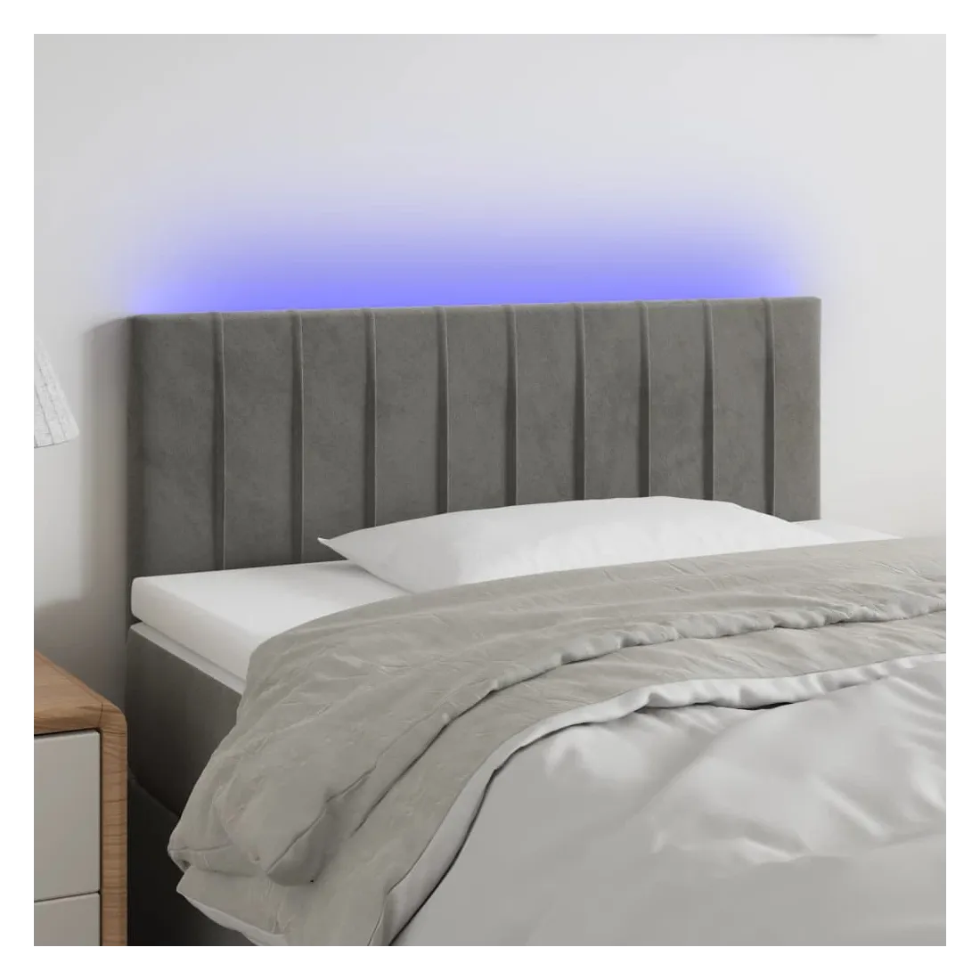 Cette tête de lit à LED classique, au design élégant, donne à votre cadre de lit une touche de modernité étonnante et convient parfaitement à toute chambre à coucher. Velours doux : le velours est un tissu doux et luxueux qui se reconnaît à son tas dense de fibres uniformément coupées qui ont une touche lisse. Le tissu en velours présente un toucher doux distinctif, ce qui le rend confortable au toucher.LED colorée : apportez de l'éclairage dans l'obscurité avec des lumières LED colorées !Hauteur réglable : la tête de lit est réglable en hauteur selon vos préférences.Excellent soutien : la tête de lit vous offre un excellent soutien du dos lorsque vous êtes assis dans votre lit pour lire ou regarder la télévision.Bande à LED découpable : cette bande à LED flexible peut être ajustée en longueur. Le symbole des ciseaux indique où la bande peut être coupée en toute sécurité sans l'endommager. Remarque :Seule la partie avec un symbole de ciseaux peut être coupée et seule la partie avec l'USB continuera à fonctionner comme avant.Chaque produit est livré avec un manuel de montage dans la boîte pour un montage facile.Ce produit est doté d'un connecteur USB, mais la source d'alimentation certifiée de USB 5V n'est pas incluse.