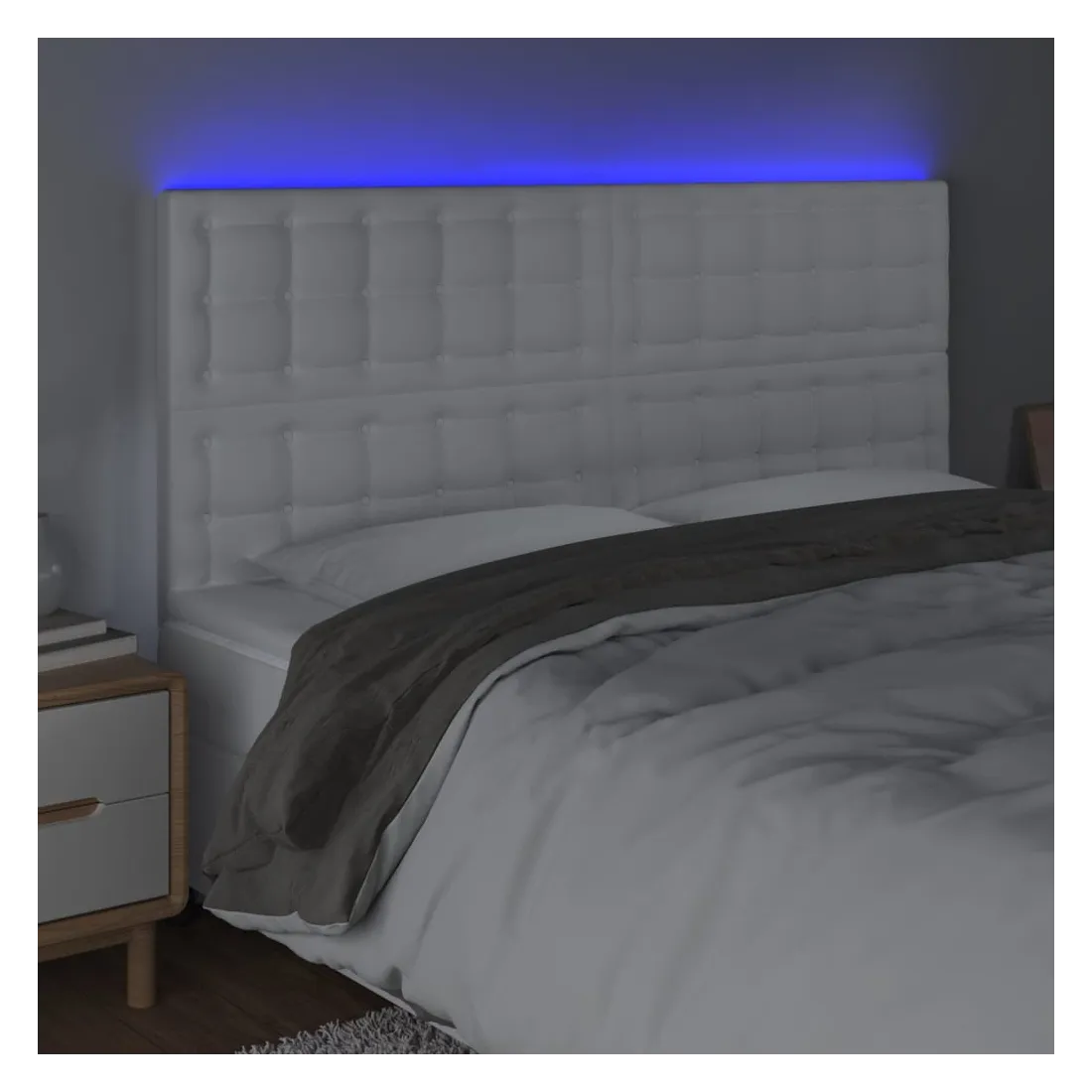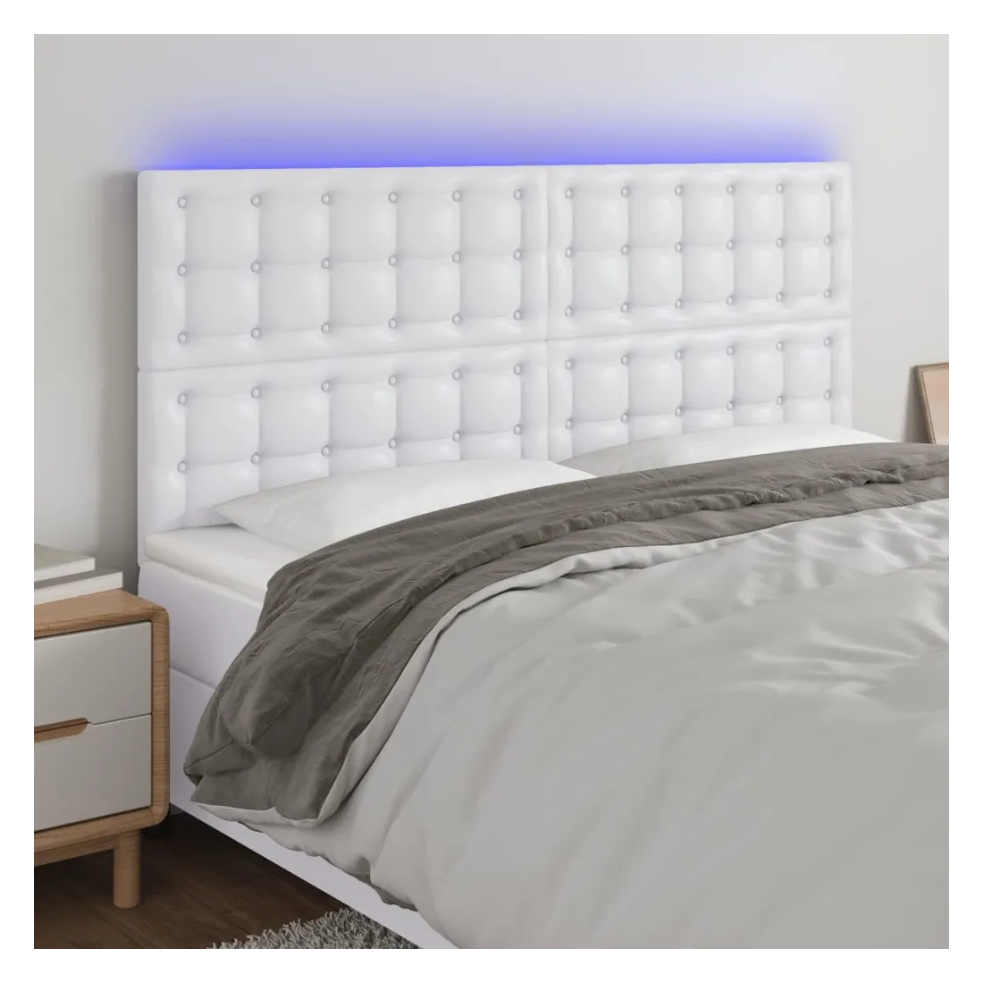 Cette tête de lit à LED classique, au design élégant, donne à votre cadre de lit une touche de modernité étonnante et convient parfaitement à toute chambre à coucher. Similicuir durable : le similicuir de qualité supérieure est un matériau très durable. Il est résistant aux taches, ce qui le rend facile à nettoyer avec un chiffon humide. La surface lisse donne également un aspect luxueux et la beauté du cuir véritable.LED colorée : apportez de l'éclairage dans l'obscurité avec des lumières LED colorées !Hauteur réglable : la tête de lit est réglable en hauteur selon vos préférences.Excellent soutien : la tête de lit vous offre un excellent soutien du dos lorsque vous êtes assis dans votre lit pour lire ou regarder la télévision.Bande à LED découpable : cette bande à LED flexible peut être ajustée en longueur. Le symbole des ciseaux indique où la bande peut être coupée en toute sécurité sans l'endommager. Remarque :Seule la partie avec un symbole de ciseaux peut être coupée et seule la partie avec l'USB continuera à fonctionner comme avant.Chaque produit est livré avec un manuel de montage dans la boîte pour un montage facile.Ce produit est doté d'un connecteur USB, mais la source d'alimentation certifiée de USB 5V n'est pas incluse.