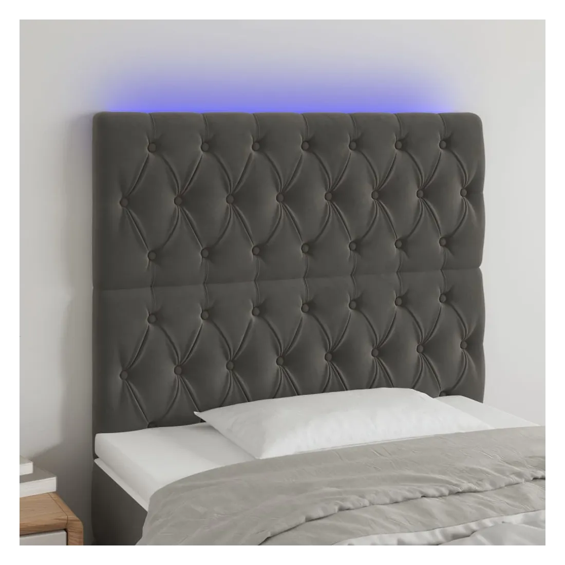Cette tête de lit à LED classique, au design élégant, donne à votre cadre de lit une touche de modernité étonnante et convient parfaitement à toute chambre à coucher. Velours doux : le velours est un tissu doux et luxueux qui se reconnaît à son tas dense de fibres uniformément coupées qui ont une touche lisse. Le tissu en velours présente un toucher doux distinctif, ce qui le rend confortable au toucher.LED colorée : apportez de l'éclairage dans l'obscurité avec des lumières LED colorées !Hauteur réglable : la tête de lit est réglable en hauteur selon vos préférences.Excellent soutien : la tête de lit vous offre un excellent soutien du dos lorsque vous êtes assis dans votre lit pour lire ou regarder la télévision.Bande à LED découpable : cette bande à LED flexible peut être ajustée en longueur. Le symbole des ciseaux indique où la bande peut être coupée en toute sécurité sans l'endommager. Remarque :Seule la partie avec un symbole de ciseaux peut être coupée et seule la partie avec l'USB continuera à fonctionner comme avant.Chaque produit est livré avec un manuel de montage dans la boîte pour un montage facile.Ce produit est doté d'un connecteur USB, mais la source d'alimentation certifiée de USB 5V n'est pas incluse.
