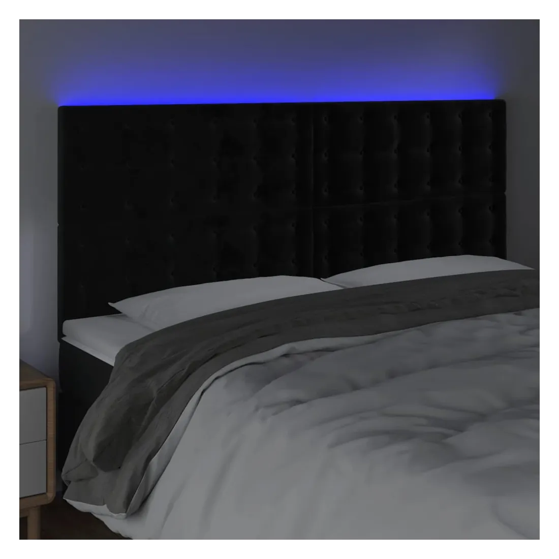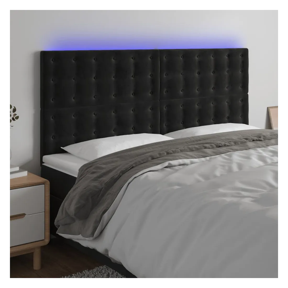 Cette tête de lit à LED classique, au design élégant, donne à votre cadre de lit une touche de modernité étonnante et convient parfaitement à toute chambre à coucher. Velours doux : le velours est un tissu doux et luxueux qui se reconnaît à son tas dense de fibres uniformément coupées qui ont une touche lisse. Le tissu en velours présente un toucher doux distinctif, ce qui le rend confortable au toucher.LED colorée : apportez de l'éclairage dans l'obscurité avec des lumières LED colorées !Hauteur réglable : la tête de lit est réglable en hauteur selon vos préférences.Excellent soutien : la tête de lit vous offre un excellent soutien du dos lorsque vous êtes assis dans votre lit pour lire ou regarder la télévision.Bande à LED découpable : cette bande à LED flexible peut être ajustée en longueur. Le symbole des ciseaux indique où la bande peut être coupée en toute sécurité sans l'endommager. Remarque :Seule la partie avec un symbole de ciseaux peut être coupée et seule la partie avec l'USB continuera à fonctionner comme avant.Chaque produit est livré avec un manuel de montage dans la boîte pour un montage facile.Ce produit est doté d'un connecteur USB, mais la source d'alimentation certifiée de USB 5V n'est pas incluse.