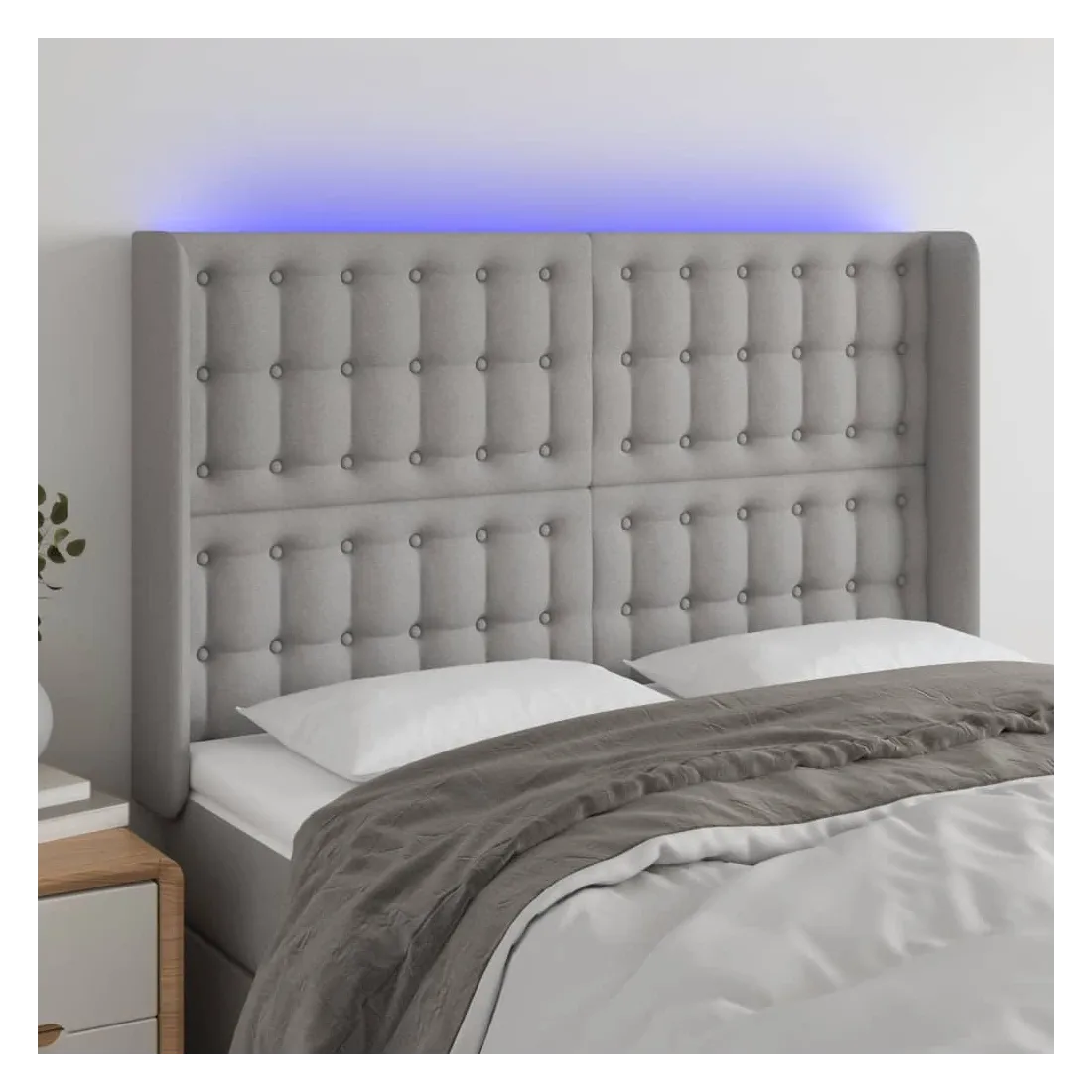 Cette tête de lit à LED classique, au design élégant, donne à votre cadre de lit une touche de modernité étonnante et convient parfaitement à toute chambre à coucher. Tissu durable : le tissu présente un aspect simple et épuré, et il est respirant et durable. LED colorée : apportez de l'éclairage dans l'obscurité avec des lumières LED colorées ! Hauteur réglable : la tête de lit est réglable en hauteur selon vos préférences. Excellent soutien : la tête de lit vous offre un excellent soutien du dos lorsque vous êtes assis dans votre lit pour lire ou regarder la télévision. Bande à LED découpable : cette bande à LED flexible peut être ajustée en longueur. Le symbole des ciseaux indique où la bande peut être coupée en toute sécurité sans l'endommager. Remarque : Seule la partie avec un sy