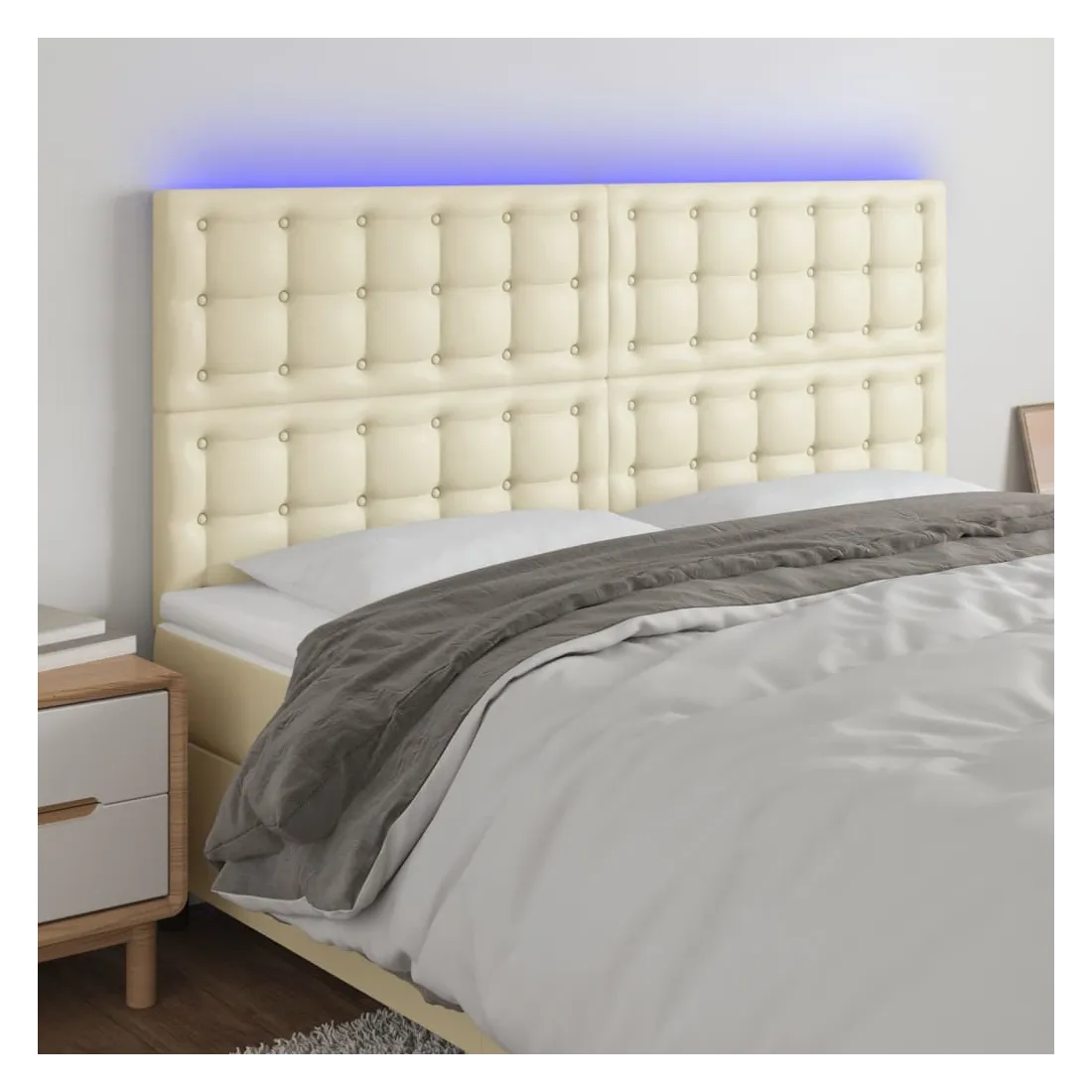 Cette tête de lit à LED classique, au design élégant, donne à votre cadre de lit une touche de modernité étonnante et convient parfaitement à toute chambre à coucher. Similicuir durable : le similicuir de qualité supérieure est un matériau très durable. Il est résistant aux taches, ce qui le rend facile à nettoyer avec un chiffon humide. La surface lisse donne également un aspect luxueux et la beauté du cuir véritable.LED colorée : apportez de l'éclairage dans l'obscurité avec des lumières LED colorées !Hauteur réglable : la tête de lit est réglable en hauteur selon vos préférences.Excellent soutien : la tête de lit vous offre un excellent soutien du dos lorsque vous êtes assis dans votre lit pour lire ou regarder la télévision.Bande à LED découpable : cette bande à LED flexible peut être ajustée en longueur. Le symbole des ciseaux indique où la bande peut être coupée en toute sécurité sans l'endommager. Remarque :Seule la partie avec un symbole de ciseaux peut être coupée et seule la partie avec l'USB continuera à fonctionner comme avant.Chaque produit est livré avec un manuel de montage dans la boîte pour un montage facile.Ce produit est doté d'un connecteur USB, mais la source d'alimentation certifiée de USB 5V n'est pas incluse.