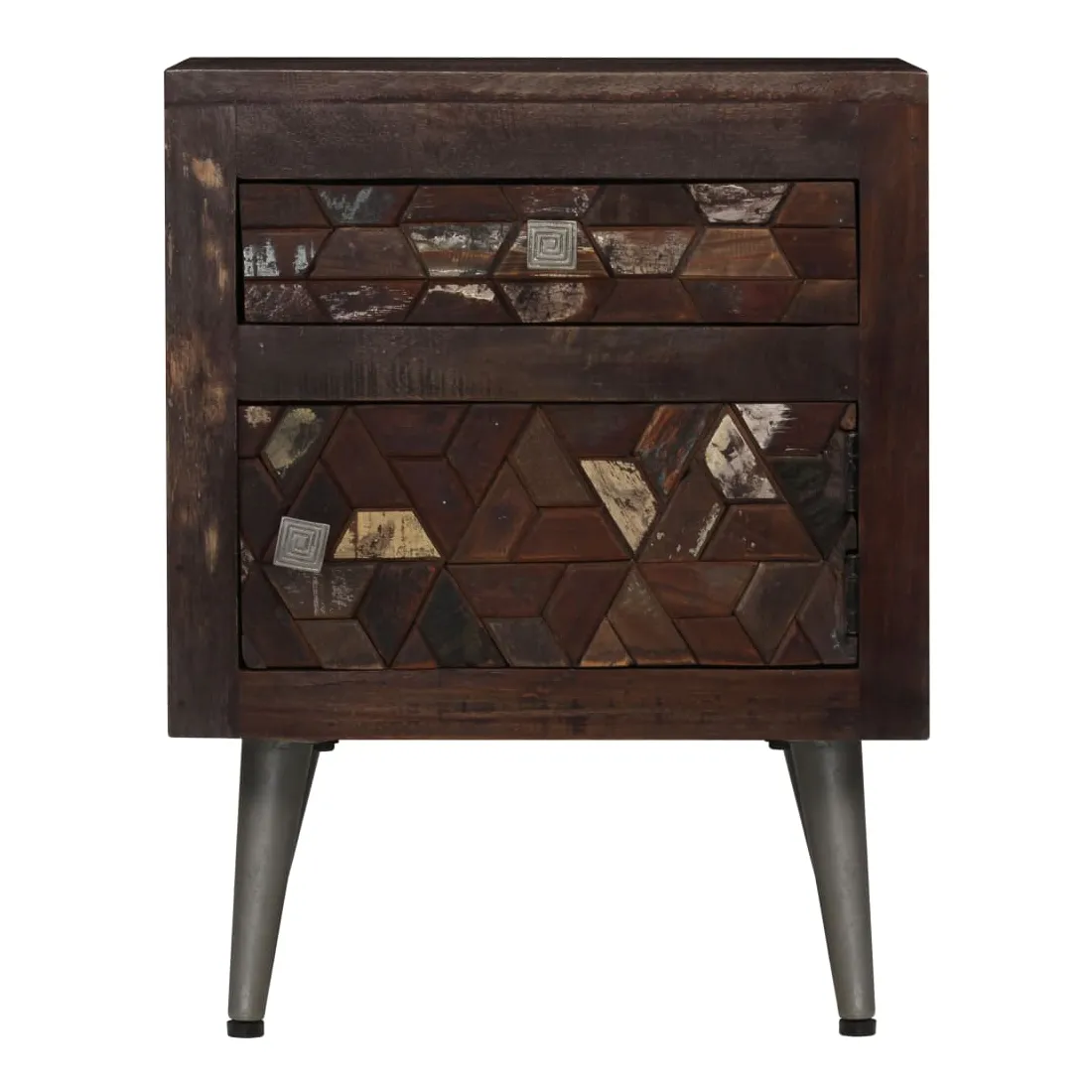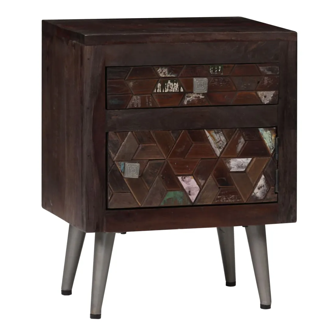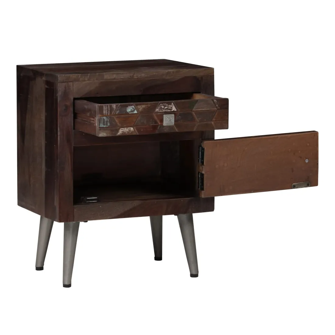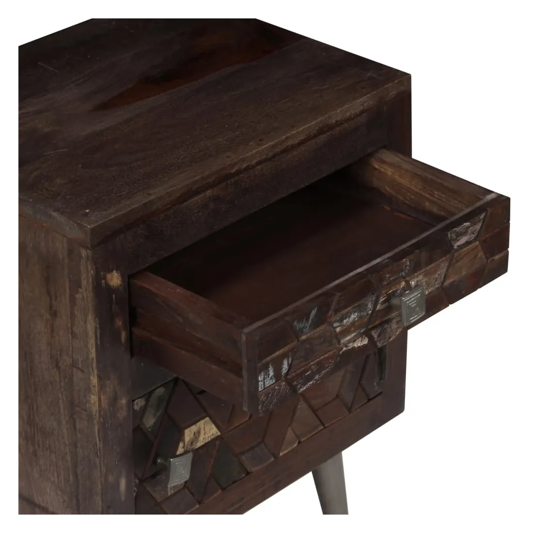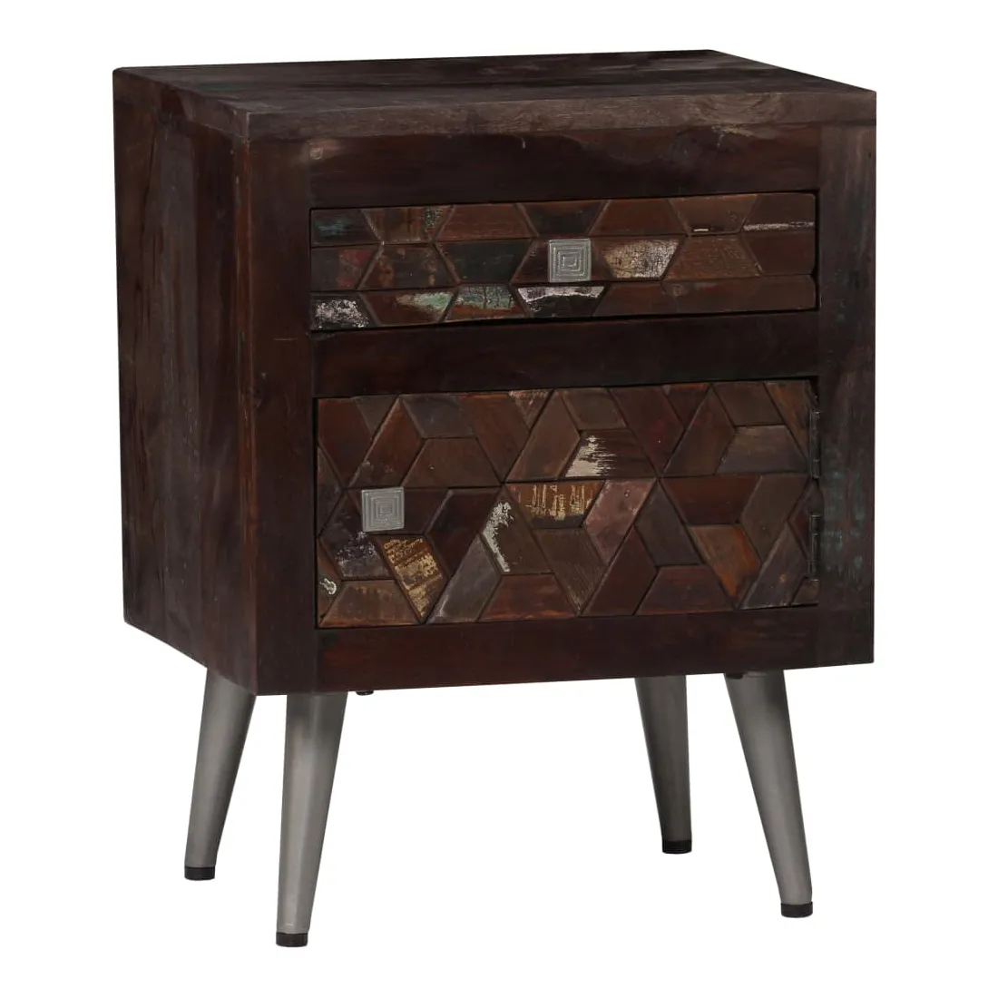 Cette table de chevet en bois solide apportera une touche décorative et pratique à votre décoration. Elle peut également être utilisée comme armoire latérale, support de téléphone ou de plantes. Le meuble est fait de bois massif de récupération provenant de solives, de planchers et de poutres de soutien de vieux bâtiments démolis et peut être composée de différents types de bois comme pin, teck, hêtre, chêne, cèdre, bois de manguier, acacia, etc. Cela signifie que le bois de récupération conserve les caractéristiques de ces différents types de bois. Le bois de récupération est déjà vieilli, patiné et séché, donc il ne rétrécit pas et ne se plie pas. Les belles veines de bois rendent chaque meuble unique et légèrement différent l'un de l'autre. Les signes d'usure et la structure du grain visible témoignent de la riche histoire du bois et donnent au meuble un aspect chaleureux et authentique. Chaque étape du processus est réalisée avec le plus grand soin, que ce soit le polissage, la peinture ou le laquage. Conçue avec un grand espace de rangement, la table de chevet garde vos petits objets bien rangés et à portée de main. Vous pouvez placer votre réveil et un verre d'eau, mais aussi des objets décoratifs comme des cadres photo sur la surface du meuble. Ses pieds en acier ajoutent à sa robustesse et à son style industriel époustouflant. L'assemblage est facile. Remarque importante : Les couleurs et les grains varient d'une pièce à l'autre, rendant chacune de nos tables de chevet unique. La livraison est aléatoire, ce qui garantit l'exclusivité et l'individualité de votre produit.