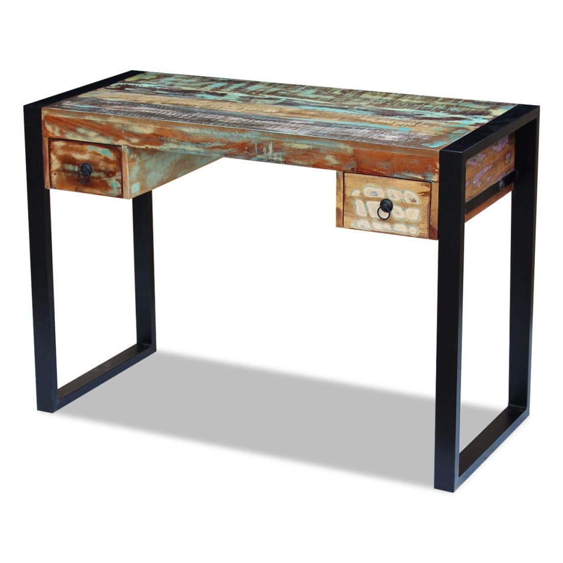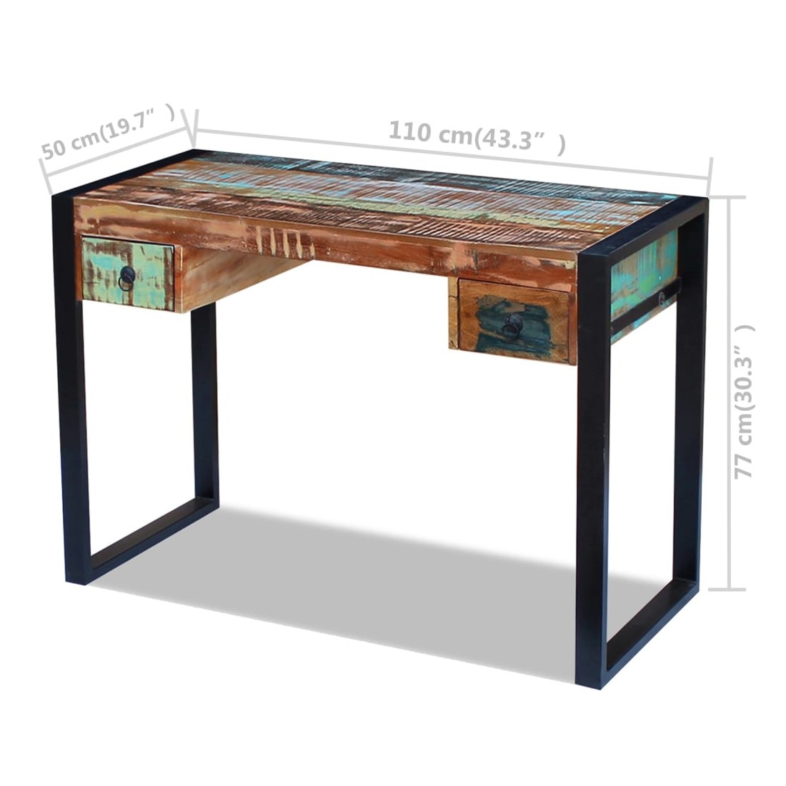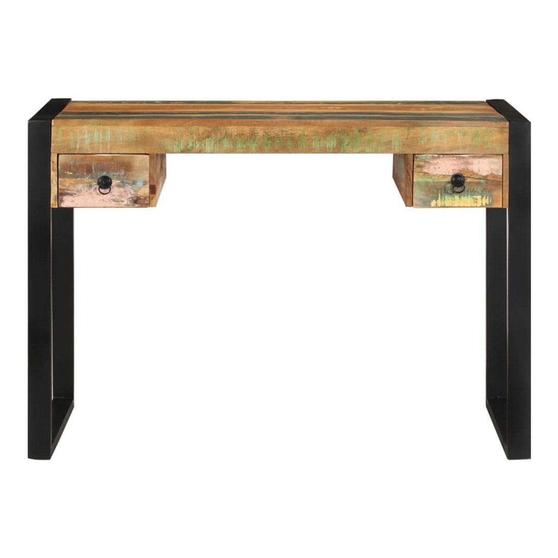 Ce bureau en bois de style vintage, fait en bois de récupération massif, sera un supplément indémodable à votre maison. Grâce à sa structure robuste, le bureau est très stable et durable. Le dessus offre une surface stable et robuste pour que vous puissiez y poser vos verres, un panier de fruits, un vase ou d'autres objets décoratifs. Il est doté de deux tiroirs qui vous offrent assez d'espace pour y ranger des petits objets comme des clés, des carnets et d'autres babioles. Ce bureau peut être utilisé comme bureau d'ordinateur, table de travail, table pour lire ou étudier, etc. Il peut également être utilisé comme buffet ou comme table console. Le bureau est fait en bois de récupération, ce qui signifie que chaque meuble est unique et légèrement différent l'un de l'autre. Les meubles f
