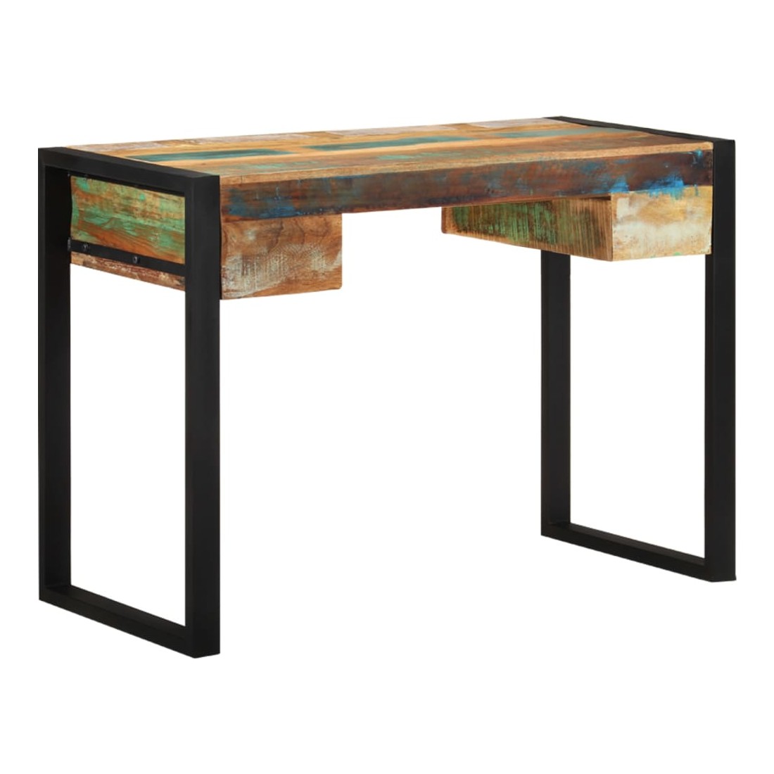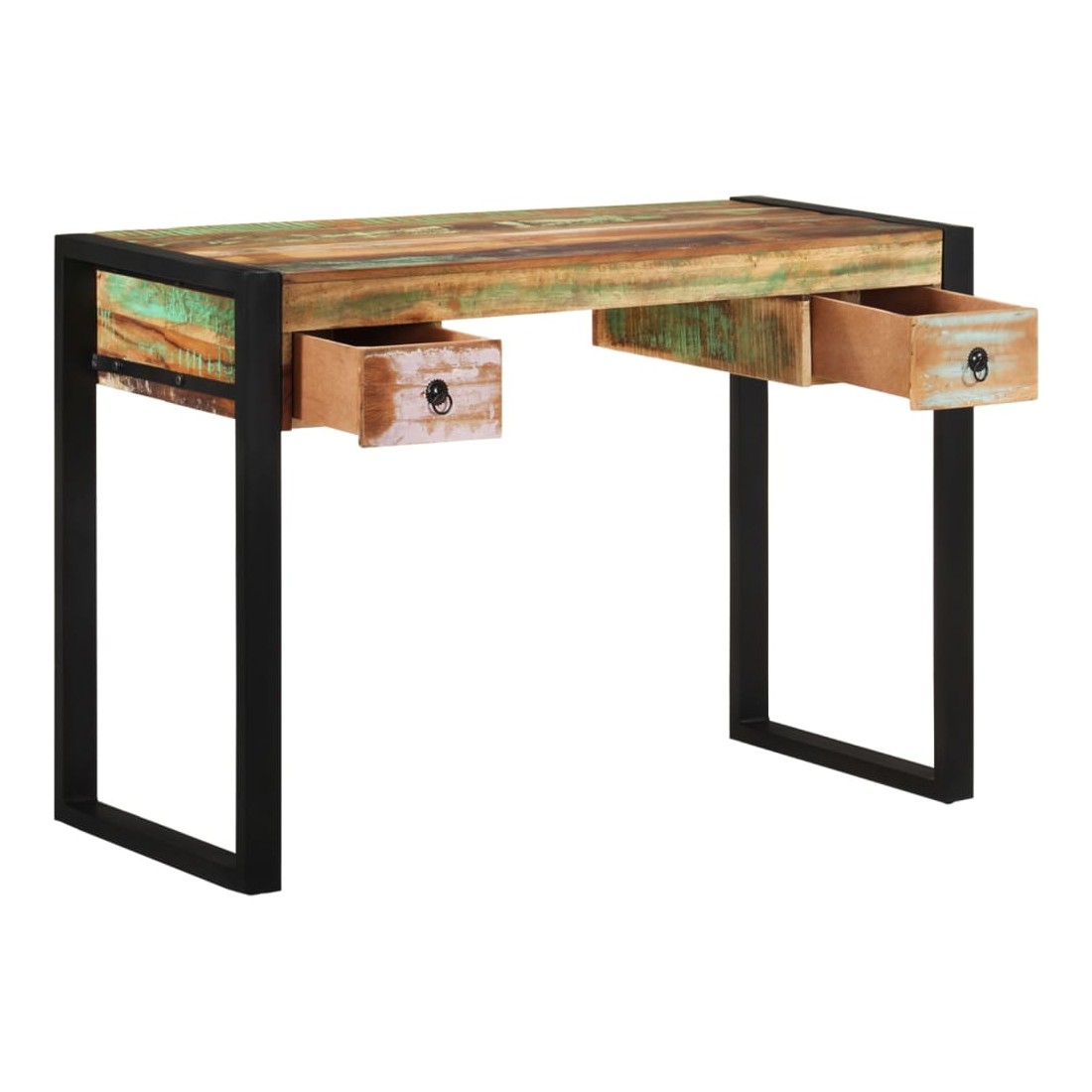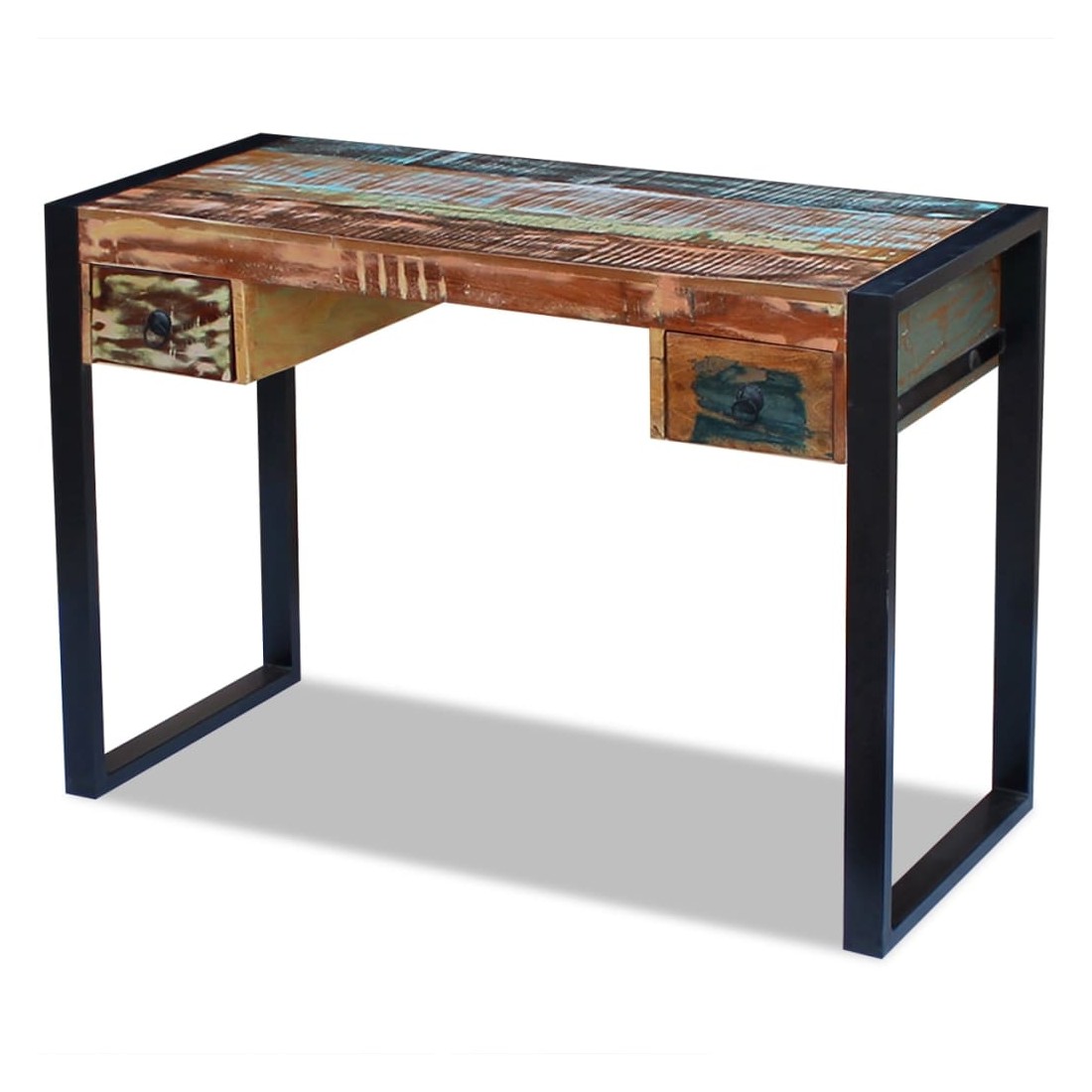 Ce bureau en bois de style vintage, fait en bois de récupération massif, sera un supplément indémodable à votre maison. Grâce à sa structure robuste, le bureau est très stable et durable. Le dessus offre une surface stable et robuste pour que vous puissiez y poser vos verres, un panier de fruits, un vase ou d'autres objets décoratifs. Il est doté de deux tiroirs qui vous offrent assez d'espace pour y ranger des petits objets comme des clés, des carnets et d'autres babioles. Ce bureau peut être utilisé comme bureau d'ordinateur, table de travail, table pour lire ou étudier, etc. Il peut également être utilisé comme buffet ou comme table console. Le bureau est fait en bois de récupération, ce qui signifie que chaque meuble est unique et légèrement différent l'un de l'autre. Les meubles f