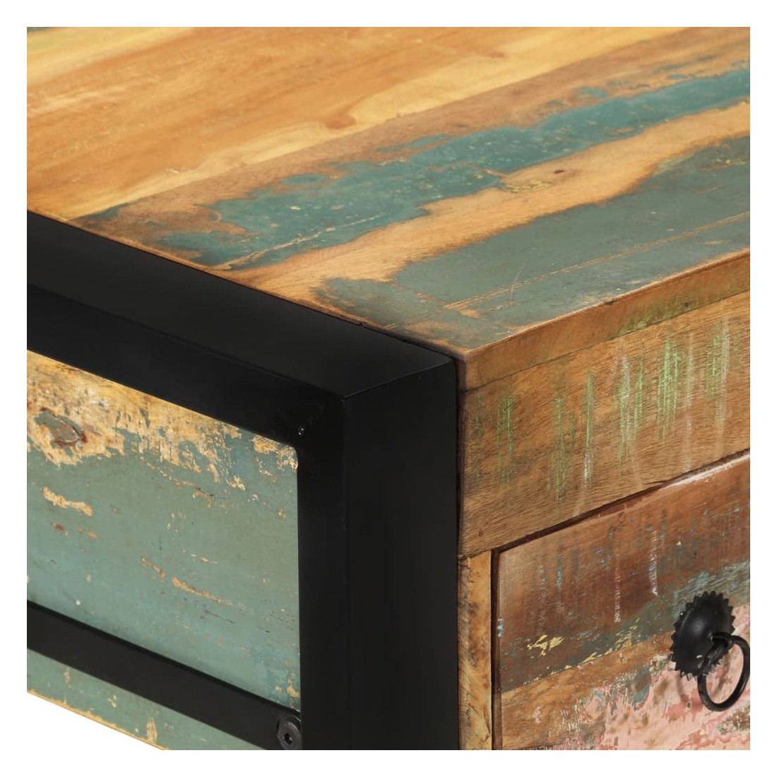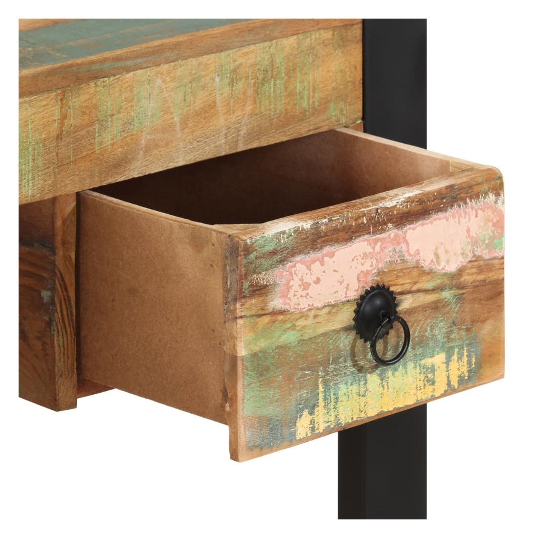 Ce bureau en bois de style vintage, fait en bois de récupération massif, sera un supplément indémodable à votre maison. Grâce à sa structure robuste, le bureau est très stable et durable. Le dessus offre une surface stable et robuste pour que vous puissiez y poser vos verres, un panier de fruits, un vase ou d'autres objets décoratifs. Il est doté de deux tiroirs qui vous offrent assez d'espace pour y ranger des petits objets comme des clés, des carnets et d'autres babioles. Ce bureau peut être utilisé comme bureau d'ordinateur, table de travail, table pour lire ou étudier, etc. Il peut également être utilisé comme buffet ou comme table console. Le bureau est fait en bois de récupération, ce qui signifie que chaque meuble est unique et légèrement différent l'un de l'autre. Les meubles faits en bois de récupération possèdent les caractéristiques de bois différents comme le bois de teck, d'acacia, de manguier, de saal, etc. Le bois de récupération est solide, stable, durable et magnifique. Les signes d'usure et la structure de fibres visible donnent à chaque meuble une apparence unique et leur propre histoire. Ce bureau est entièrement fait à la main et la qualité de l'artisanat s'ajoute à son style rétro spectaculaire. Chaque étape du processus est effectuée avec le plus grand soin, qu'il s'agisse de la recombinaison, le polissage, la peinture ou le cirage. Remarque importante : les couleurs varient d'un meuble à l'autre, rendant chacun de nos bureaux unique. La livraison est aléatoire, ce qui garantit l'exclusivité et l'individualité de votre produit.