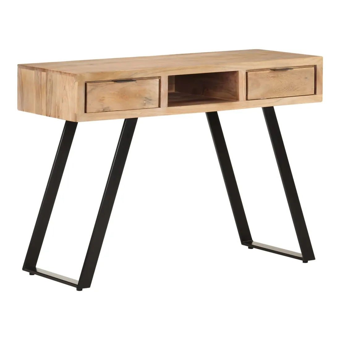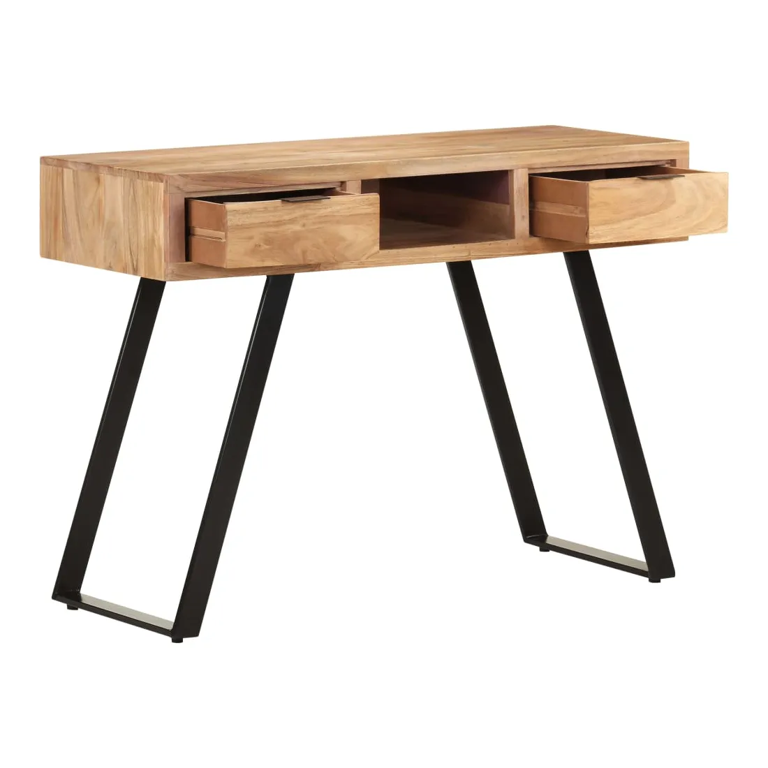 Ce bureau en bois dégage un charme industriel et sera un supplément indémodable à votre décoration intérieure. La table d'ordinateur est faite de bois d'acacia massif, un bois dur avec des grains denses, ce qui la rend stable et durable. Le cadre en acier ajoute également une stabilité supplémentaire. Le bureau en bois a deux tiroirs et un compartiment, offrant amplement d'espace pour ranger des petits objets tels que des clés, un cahier et d'autres bibelots. Le bureau peut également être utilisé comme table console. Remarque importante : les couleurs et les grains peuvent varier d'une pièce à l'autre, rendant chaque pièce unique. La livraison est aléatoire, ce qui garantit l'exclusivité et l'individualité de votre produit.